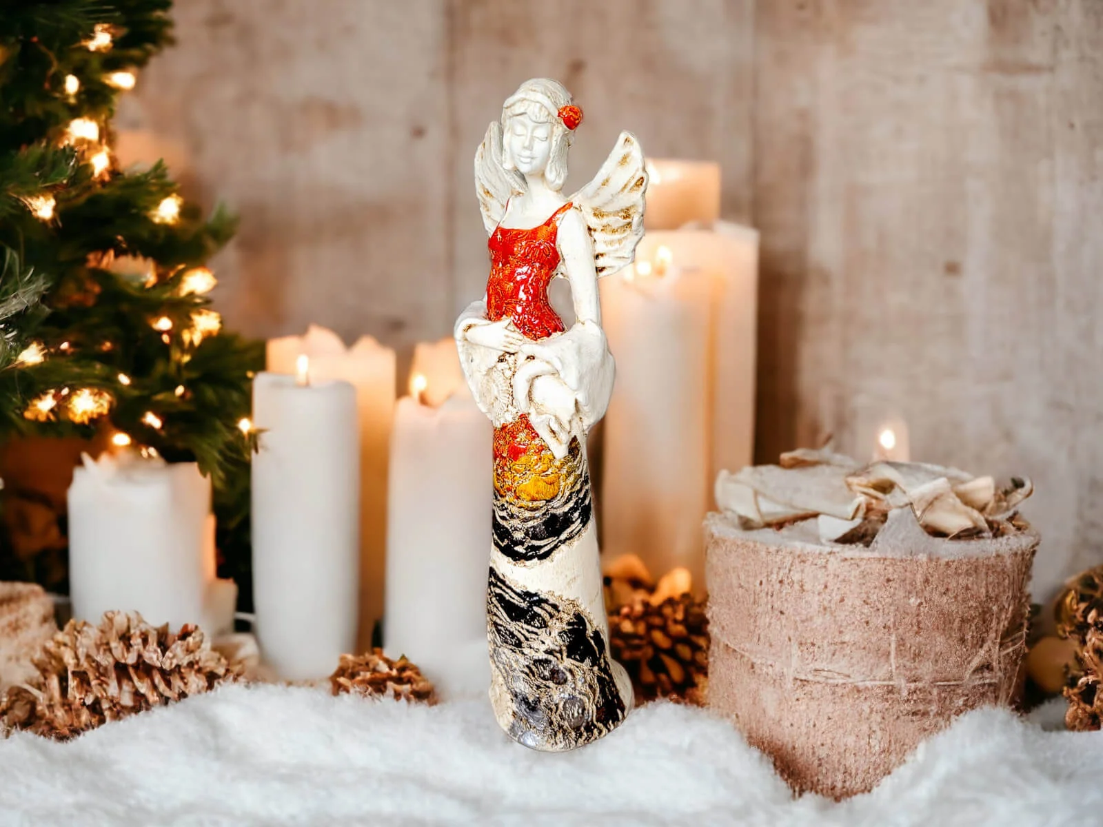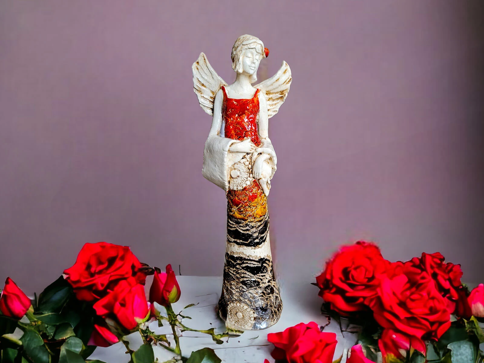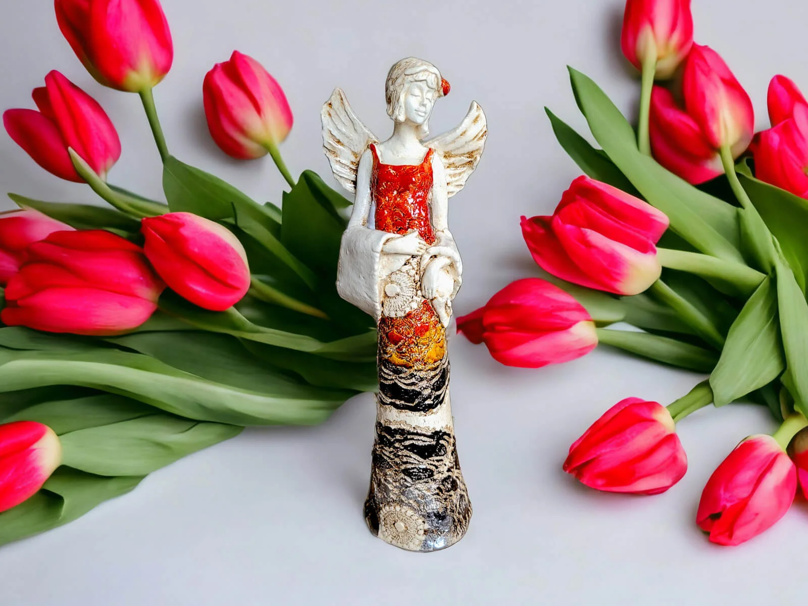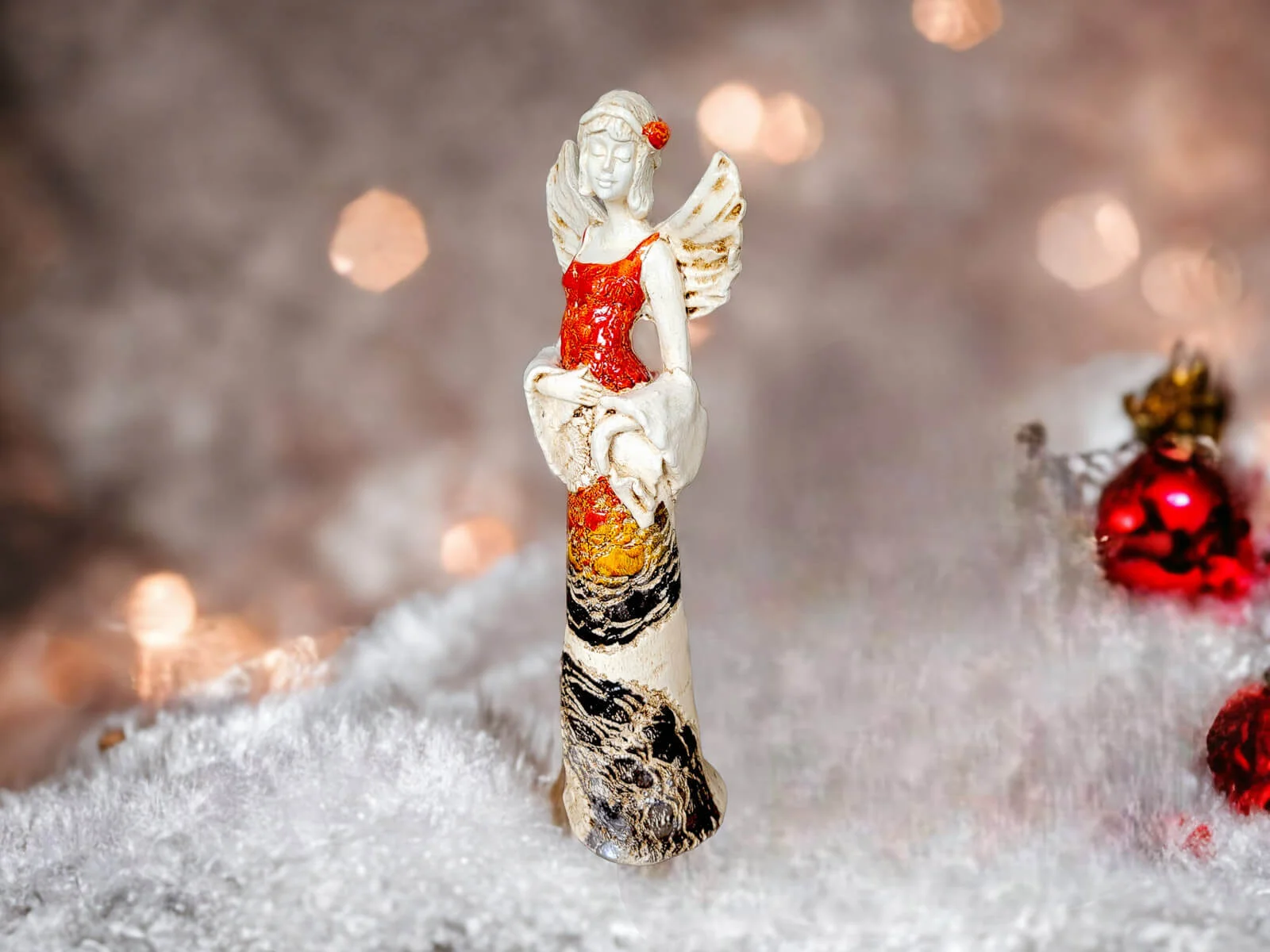 Figurka Anioła Frances w kolorze pomarańczowym emanuje urodą i elegancją. Recznie robiona w Polsce figurka łączy w sobie piękno formy z delikatnością wykonania, tworząc wyjątkową dekorację idealną na różne okazje.