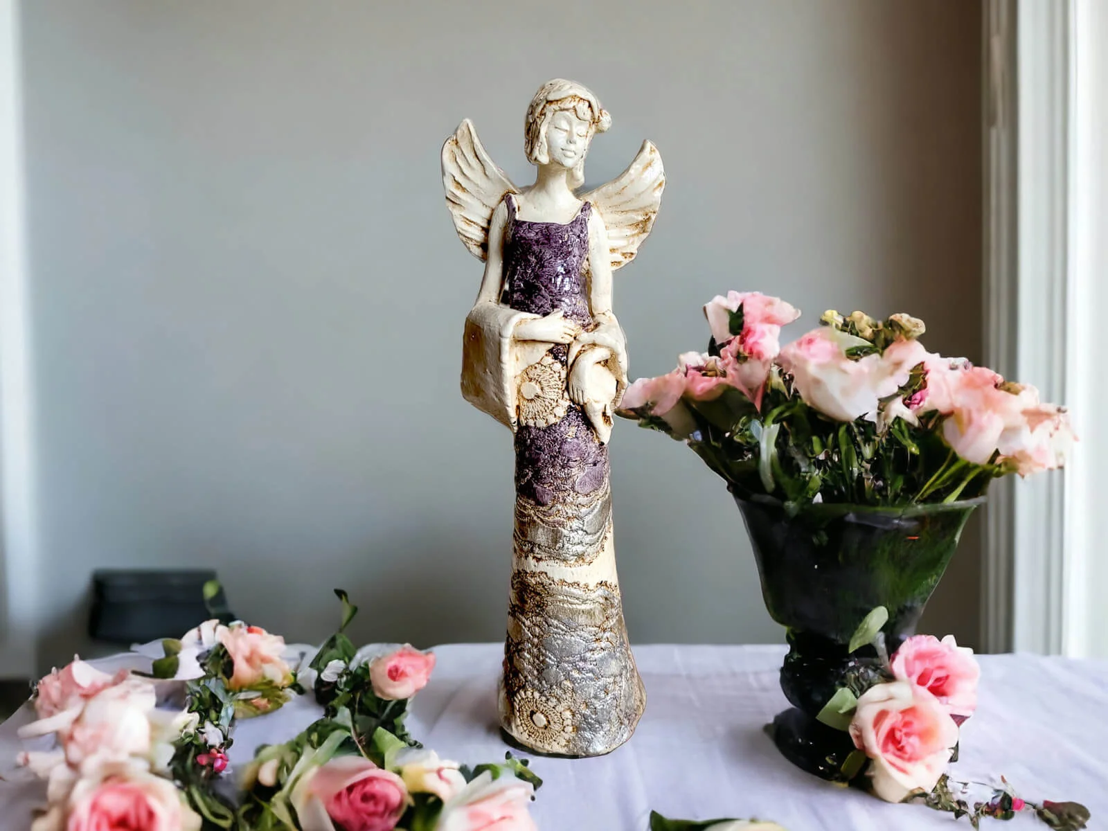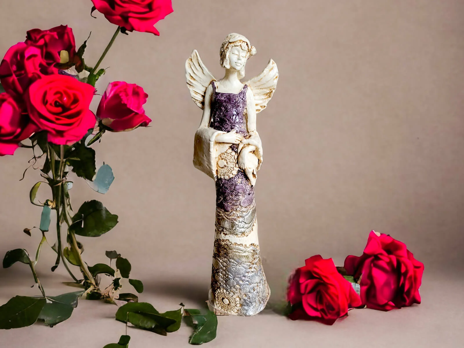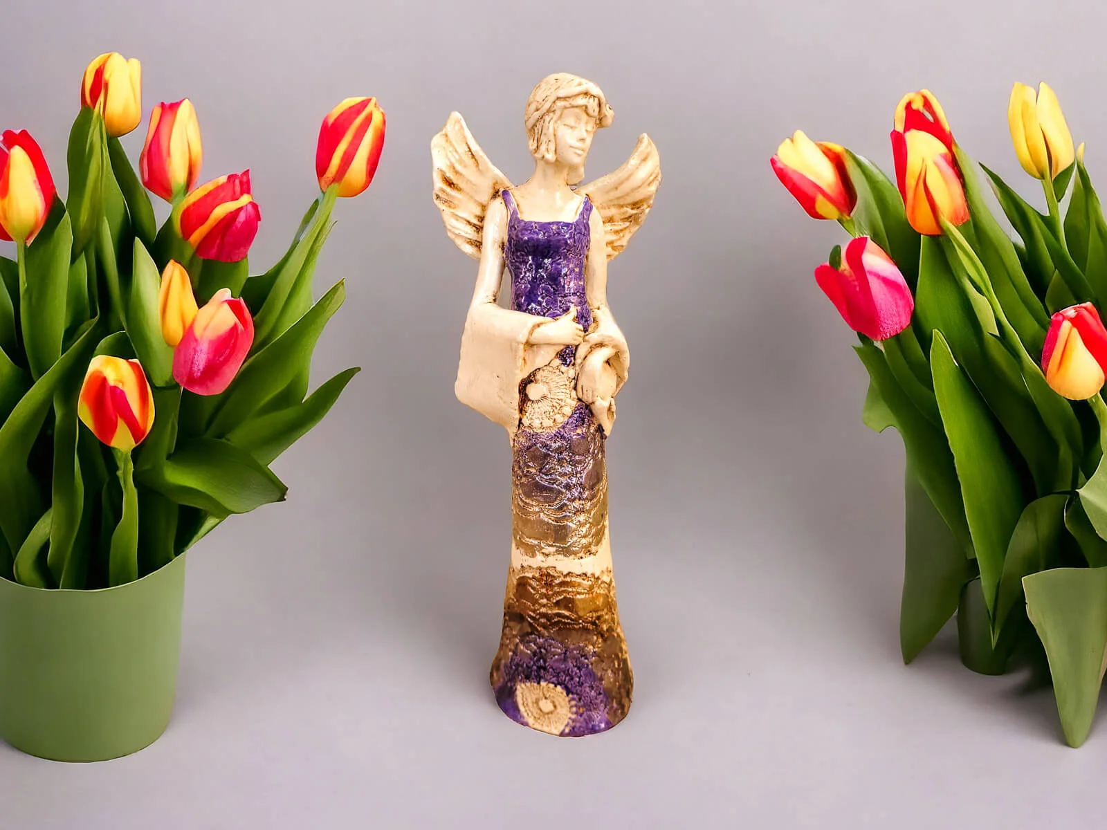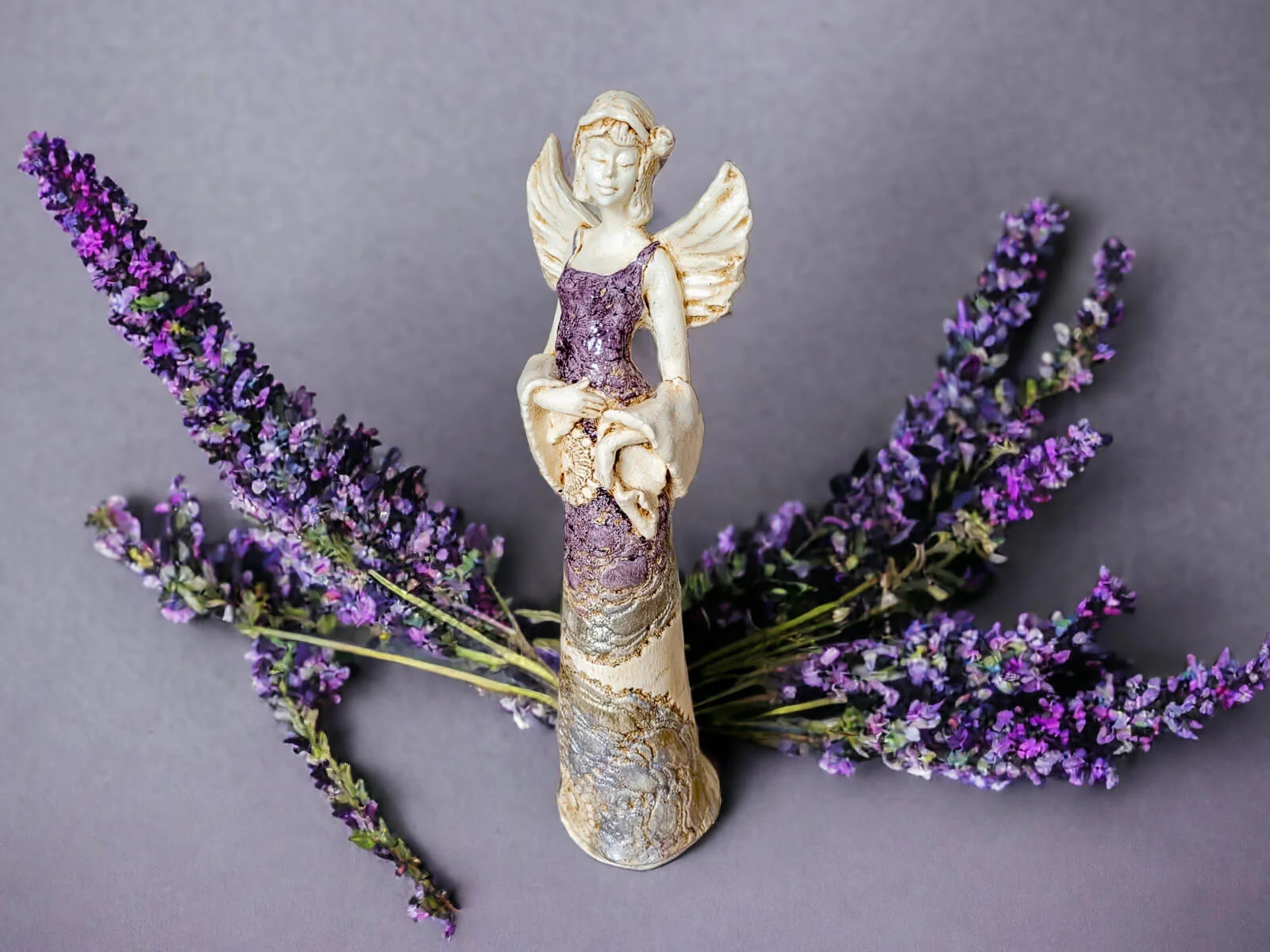 Anioł Frances wyróżnia się nie tylko finezyjną formą, ale także bogatą kolorystyką. Z fioletowym topem i złotą suknią emanuje wyrafinowanym urokiem, nadając wnętrzu subtelnego luksusu.
