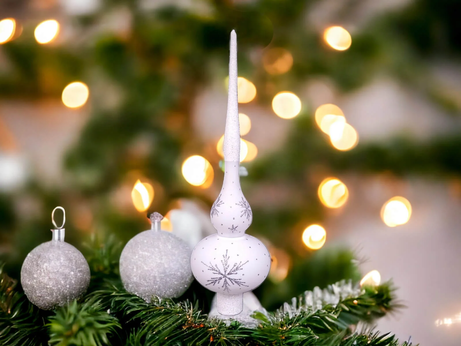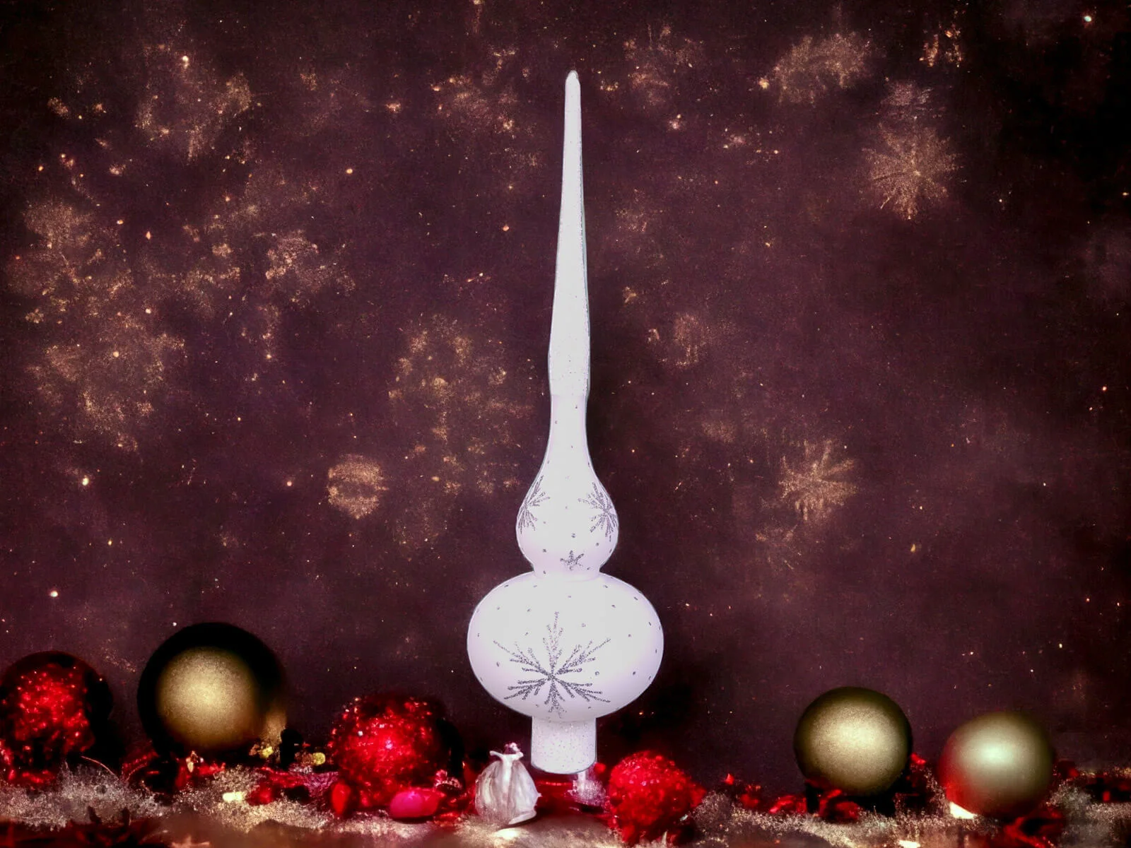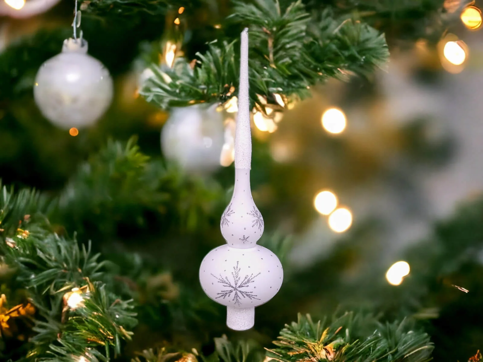 Szpic przyciąga uwagę i nadaje choince unikalny charakter. Na białym tle szpica rozmieszczone są srebrne gwiazdki, które tworzą delikatny, ale efektowny wzór. Gwiazdki te, migoczące w blasku świateł choinkowych, dodają bombce elegancji i delikatności. Srebrny połysk kontrastuje z białym podkładem, tworząc subtelny, lecz efektowny efekt wizualny.