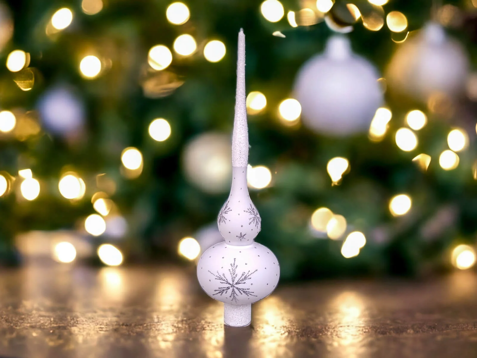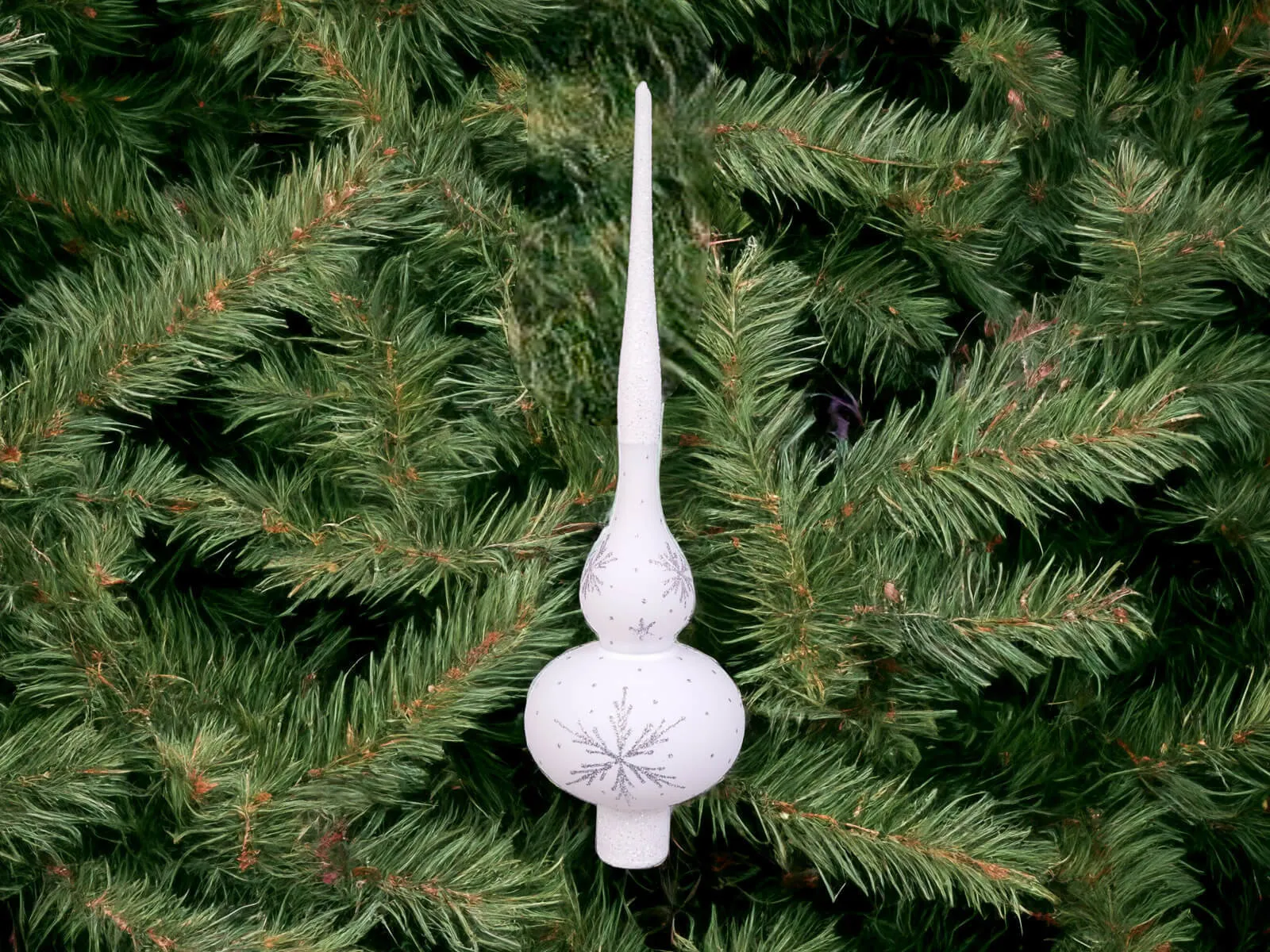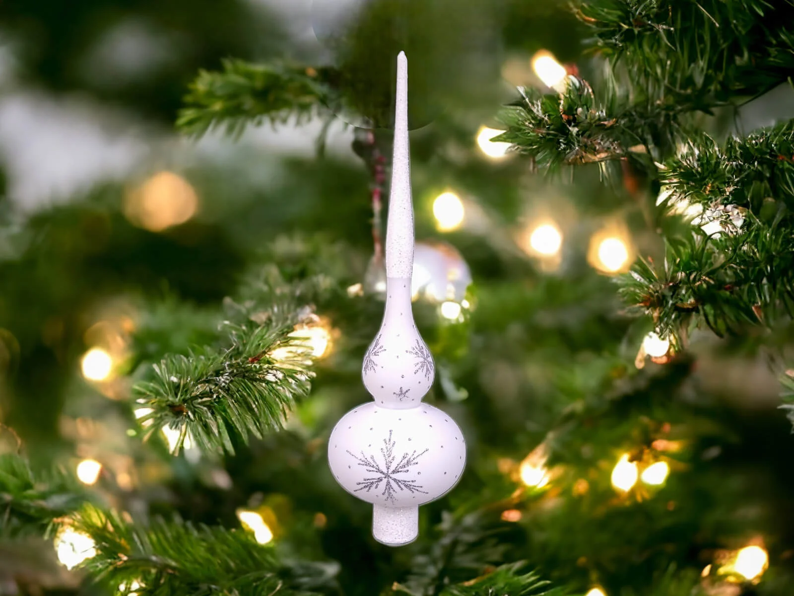 Szpic przyciąga uwagę i nadaje choince unikalny charakter. Na białym tle szpica rozmieszczone są srebrne gwiazdki, które tworzą delikatny, ale efektowny wzór. Gwiazdki te, migoczące w blasku świateł choinkowych, dodają bombce elegancji i delikatności. Srebrny połysk kontrastuje z białym podkładem, tworząc subtelny, lecz efektowny efekt wizualny.