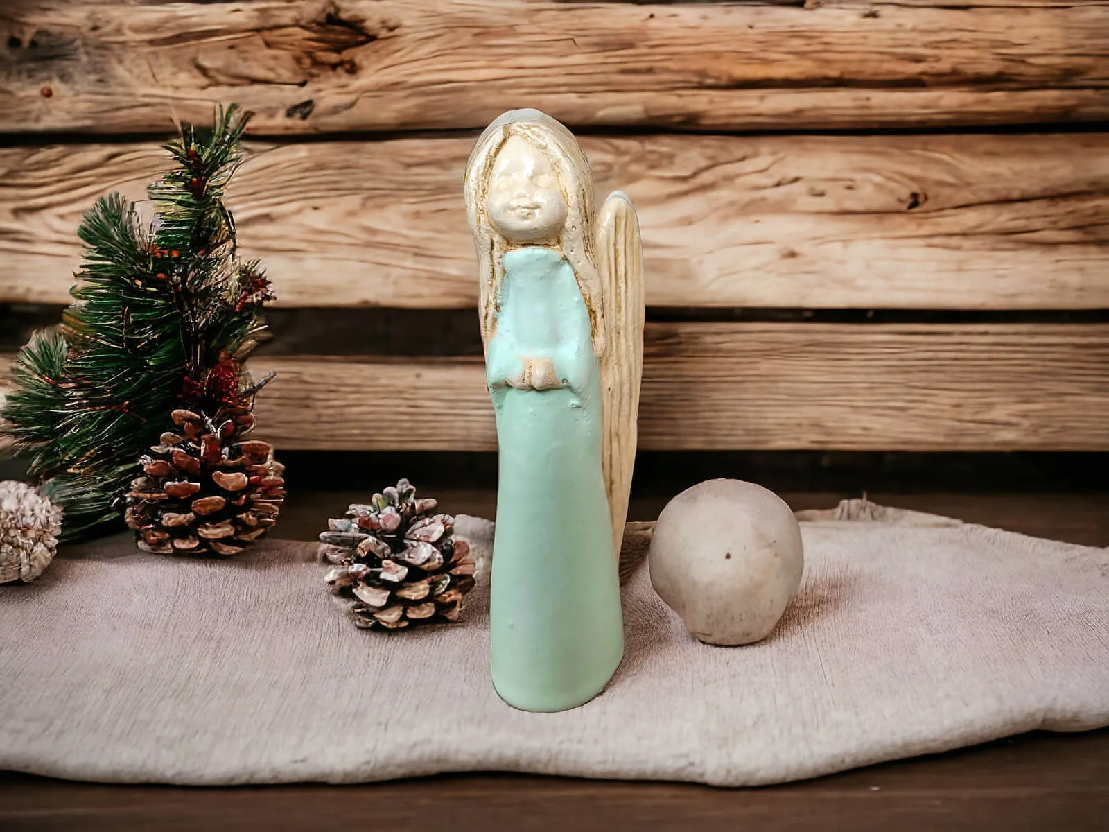 Słodziak prezentuje się w uroczej sukni w odcieniu seledynu, który symbolizuje spokój, świeżość i delikatność. Kolor ten nadaje figurce wyjątkowego charakteru, czyniąc ją doskonałym dodatkiem do wnętrz utrzymanych w subtelnych tonacjach. Każda figurka Słodziak jest dziełem artysty, co gwarantuje unikalność i dbałość o detale. Starannie wykonane rzeźbienia sukni oraz subtelne rysy twarzy tworzą harmonijną całość, emanującą pięknem i klasyką.