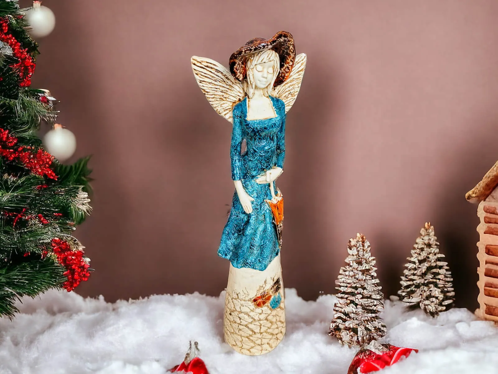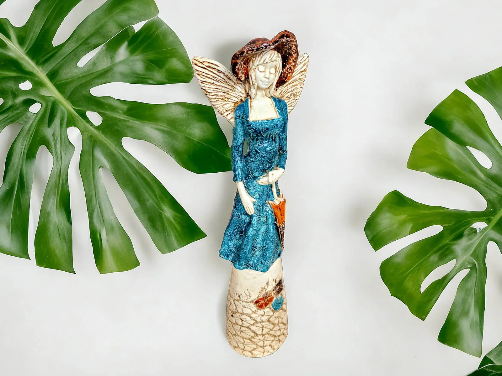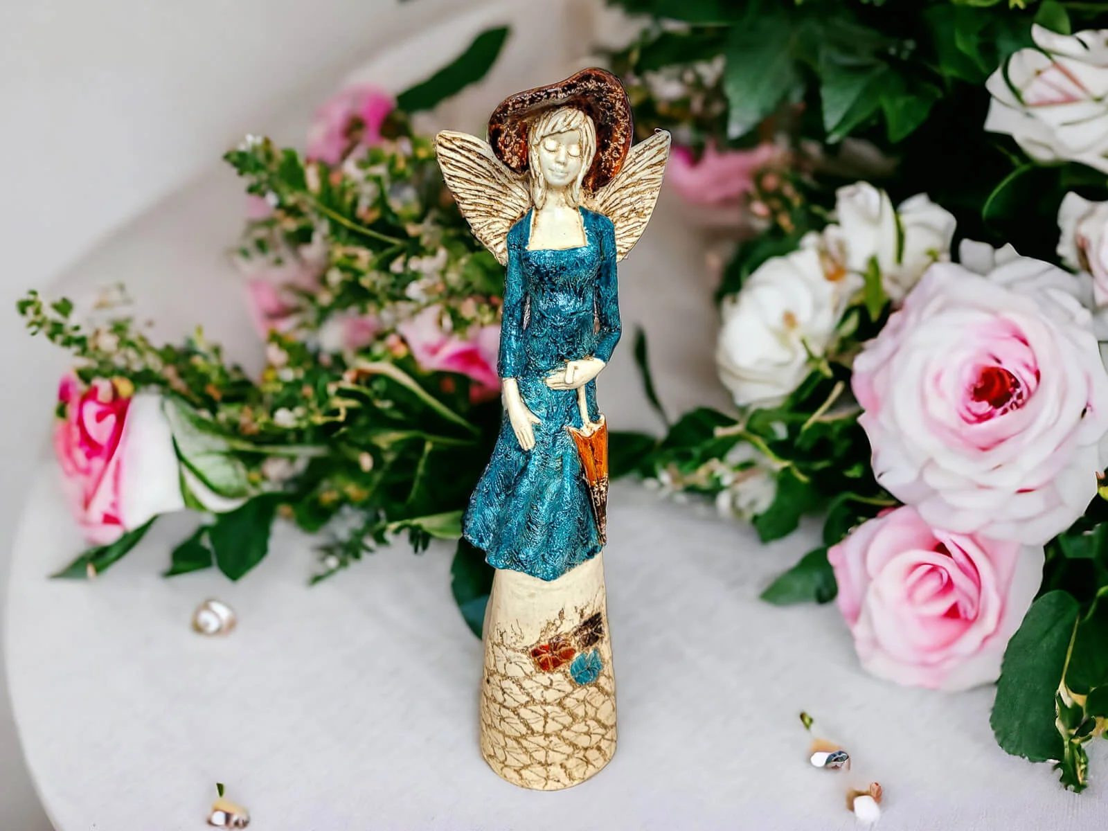 Anioł Olivia to ręcznie wykonany anioł w turkusowej sukni. Olivia ma krótkie, jasne włosy, a w lewej dłoni trzyma parasol. Z tyłu wystają małe skrzydła. Figurka pięknie wyglądałaby w salonie, sypialni lub innym pomieszczeniu. Idealnie nadaje się na prezent dla osoby, która lubi anioły i unikatowe dekoracje z duszą.