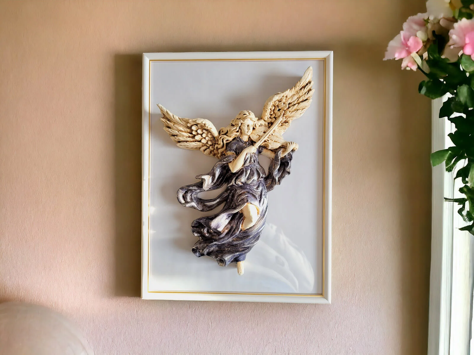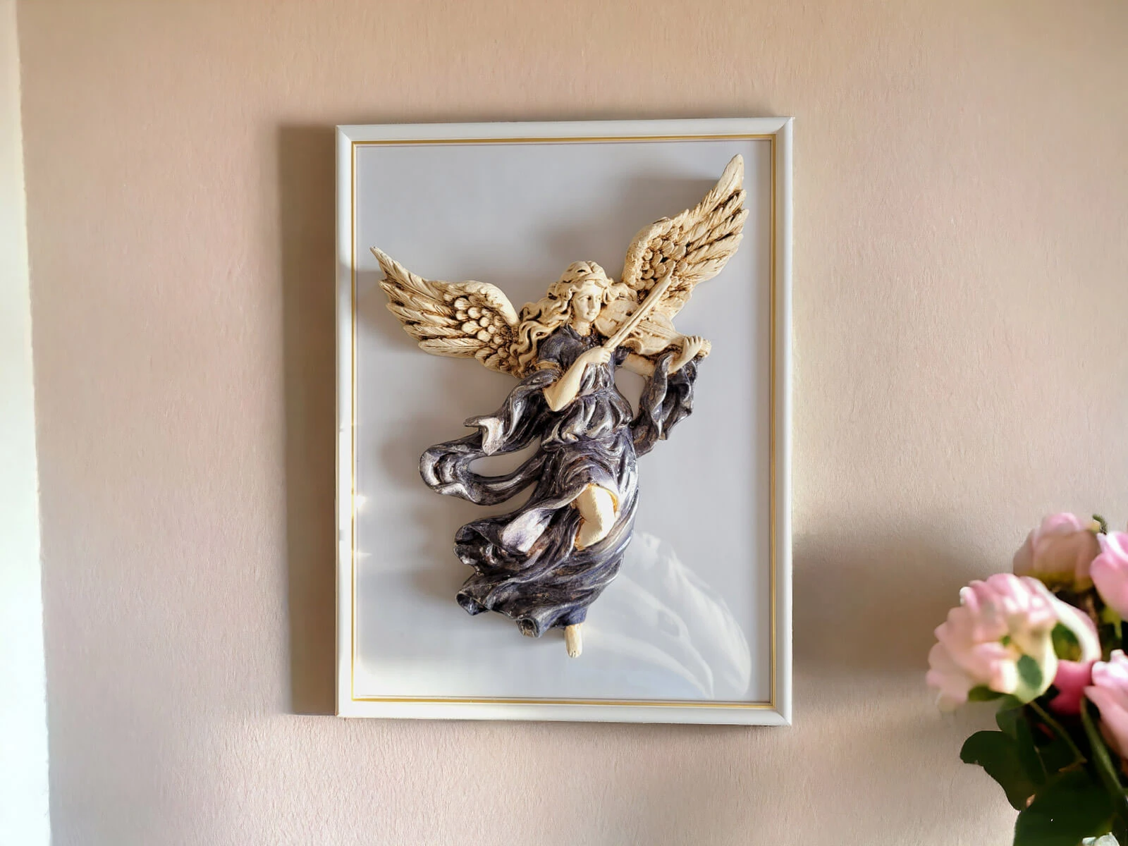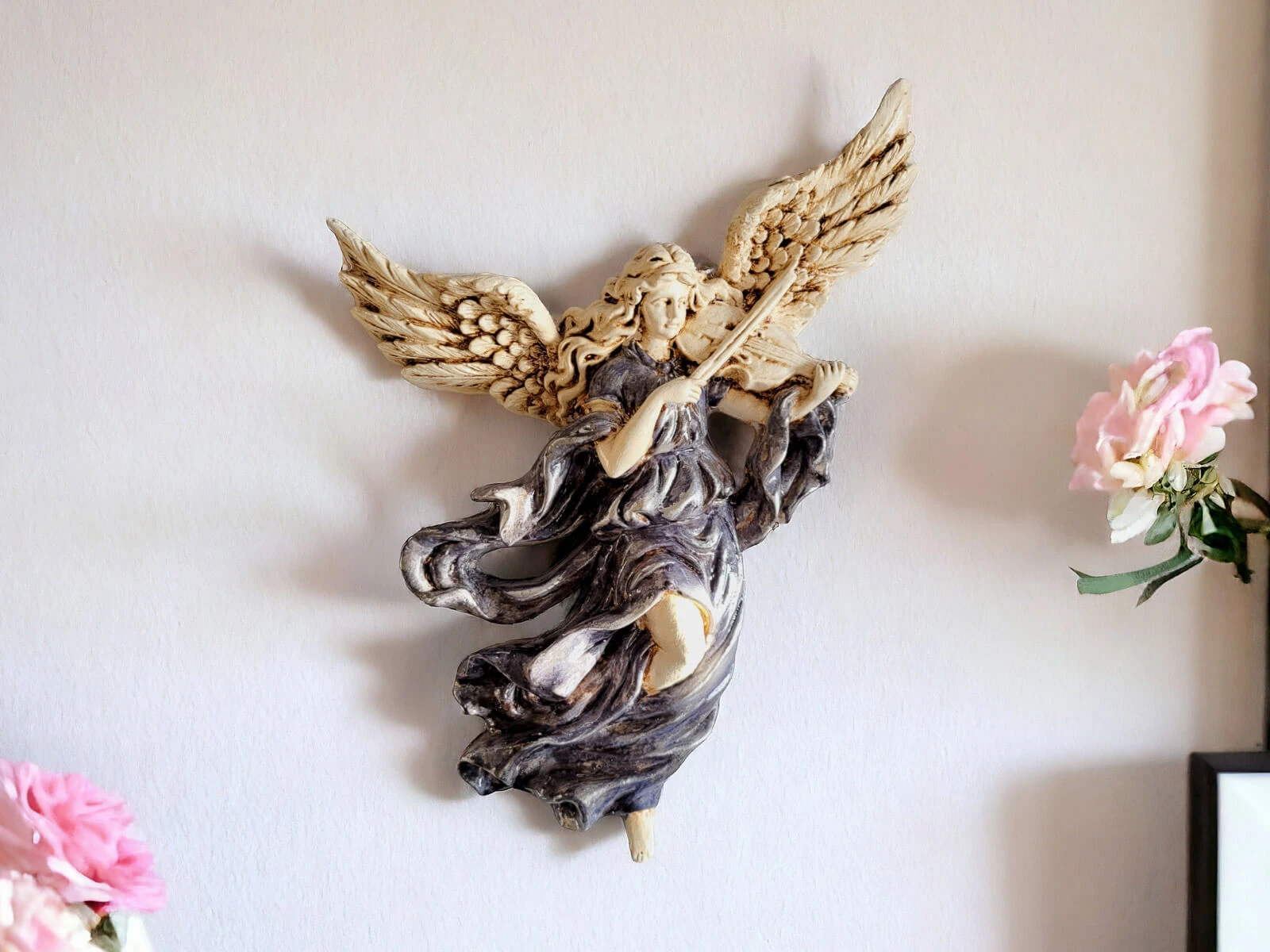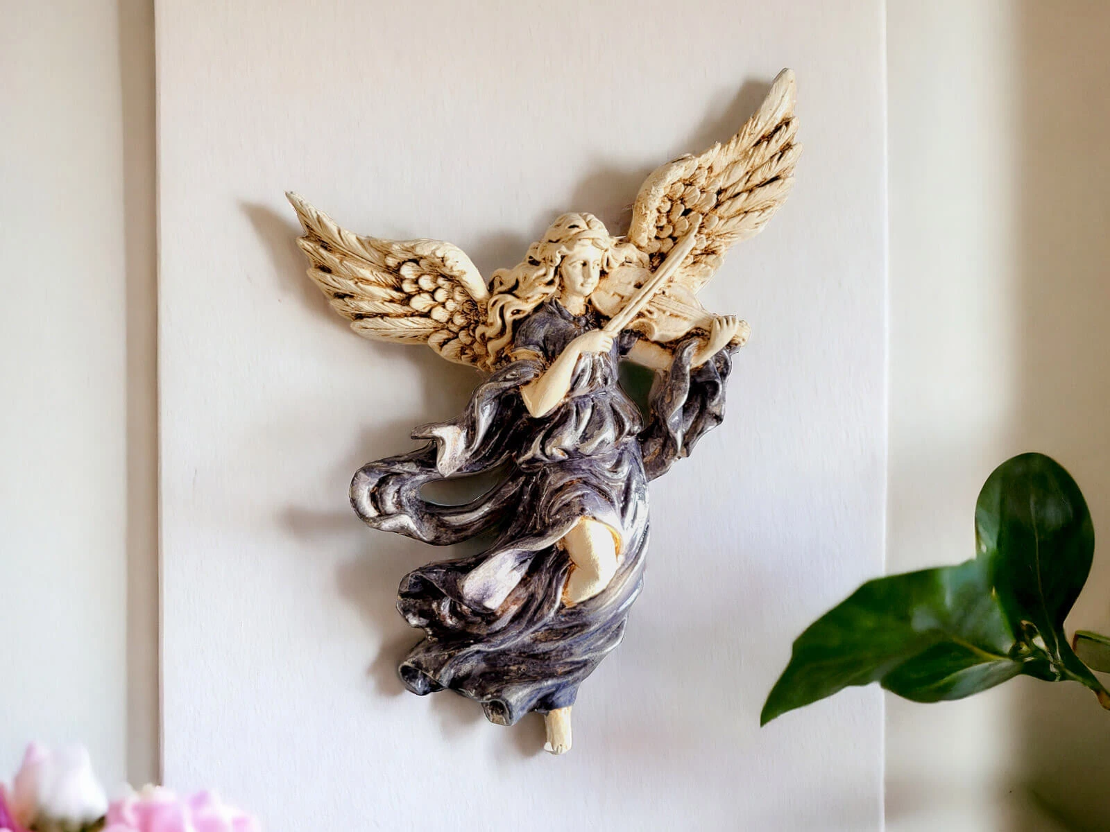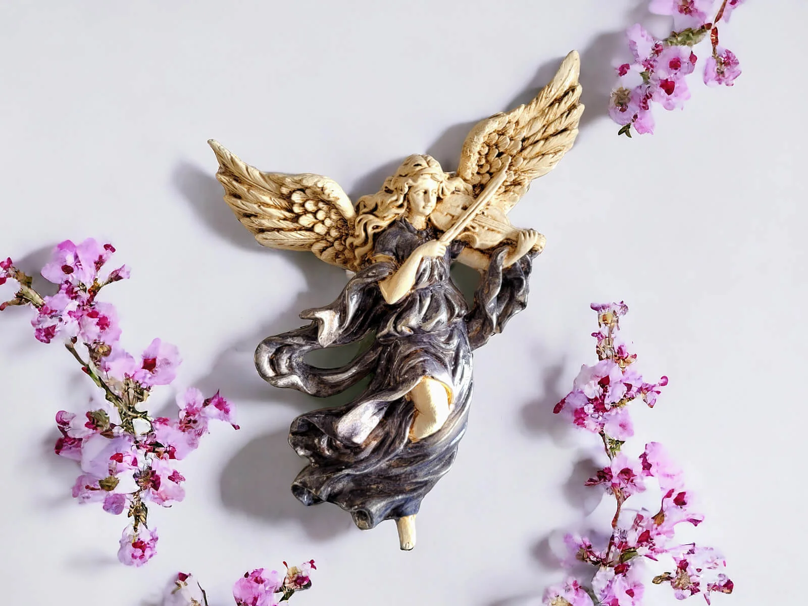 Anioł ten jest niezwykłym połączeniem delikatności i wyrafinowania. Jego rozwinięte skrzydła oraz postawa przywołują nutę niebiańskiego piękna. Każdy detal jest ręcznie formowany i starannie malowany, co nadaje postaci niepowtarzalny charakter.