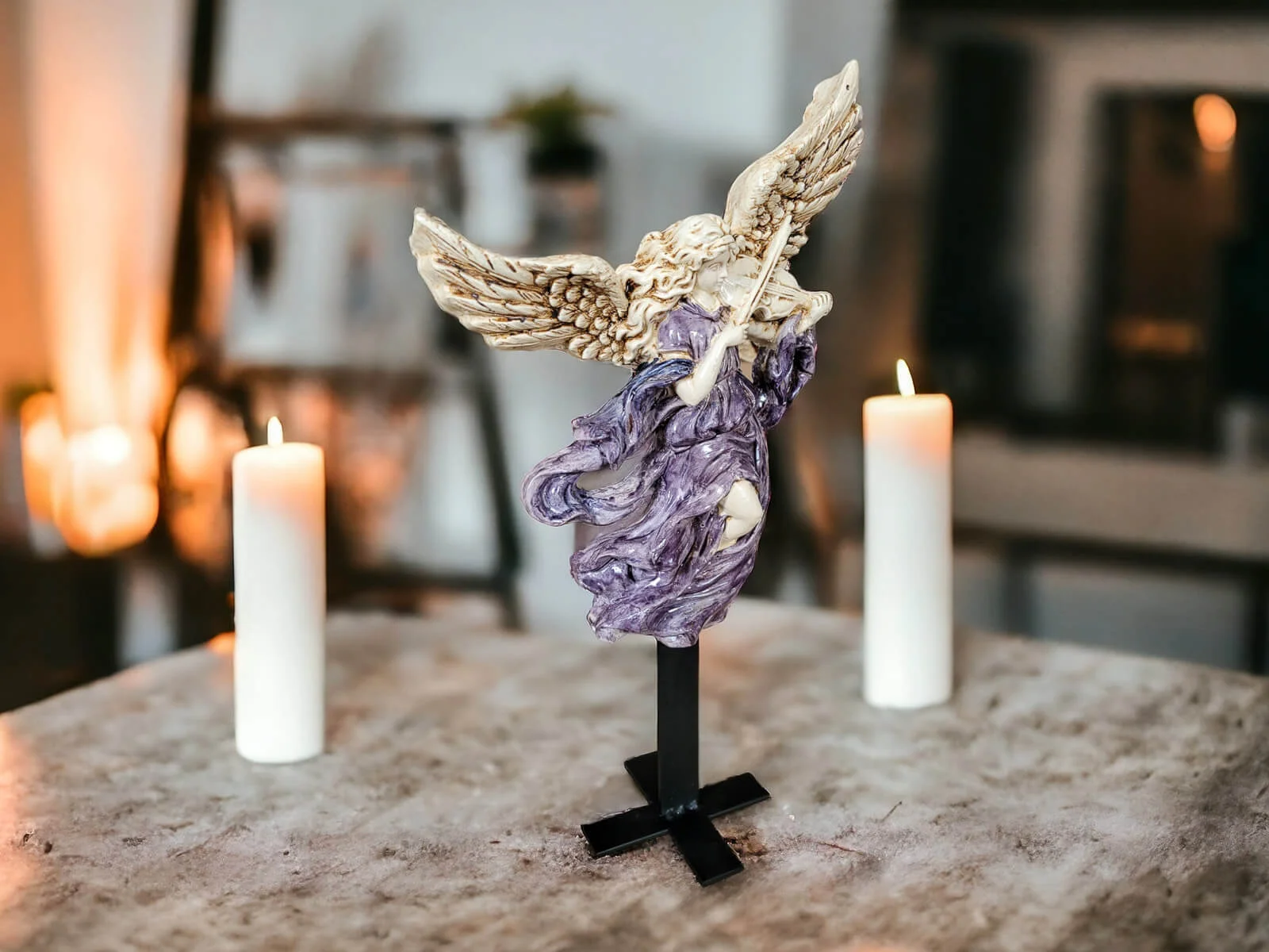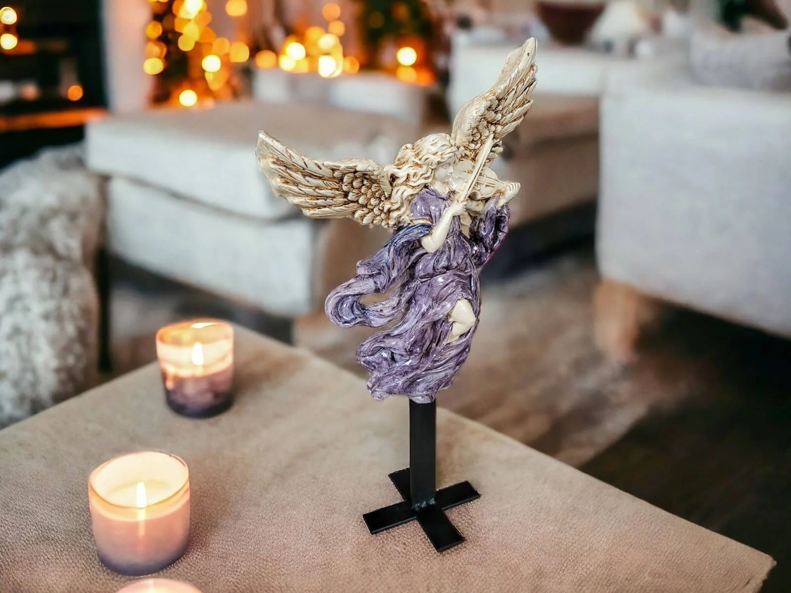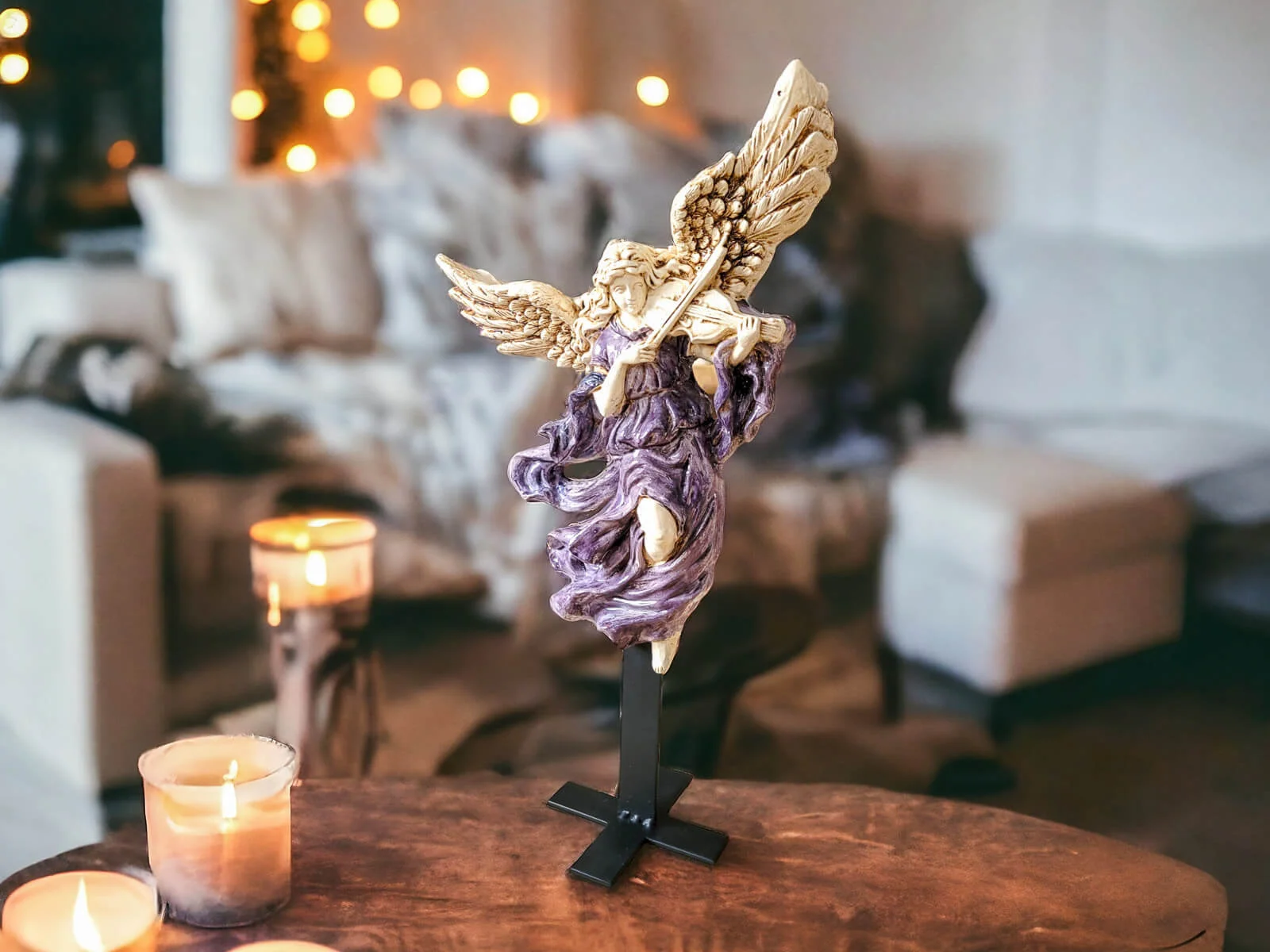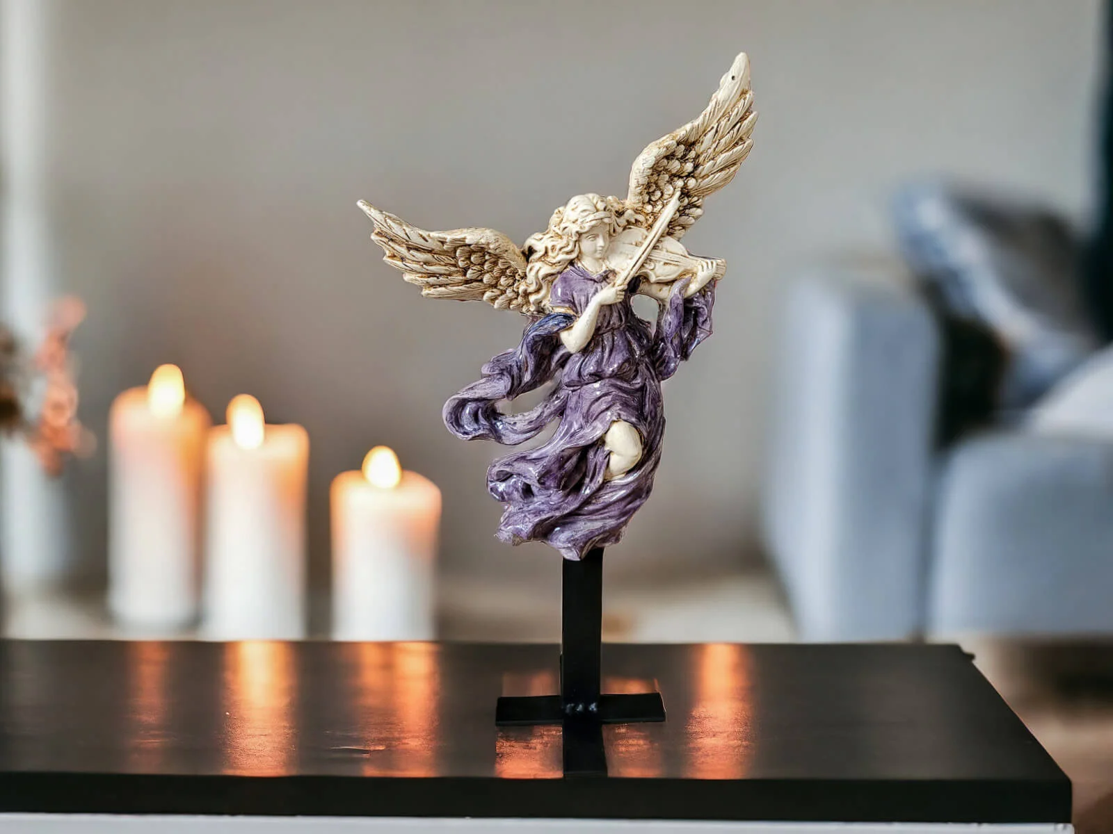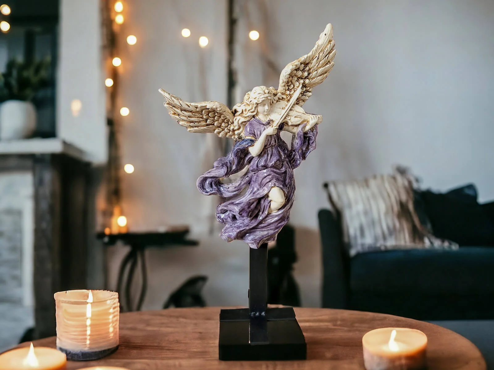 Anioł ten jest niezwykłym połączeniem delikatności i wyrafinowania. Jego rozwinięte skrzydła oraz postawa przywołują nutę niebiańskiego piękna. Każdy detal jest ręcznie formowany i starannie malowany, co nadaje postaci niepowtarzalny charakter.