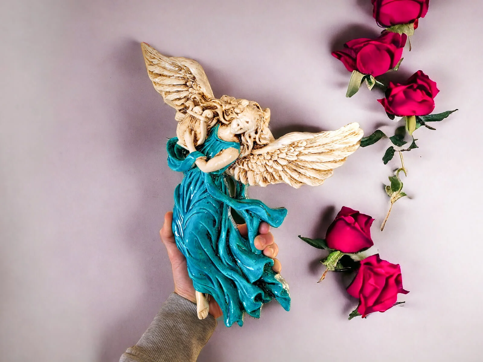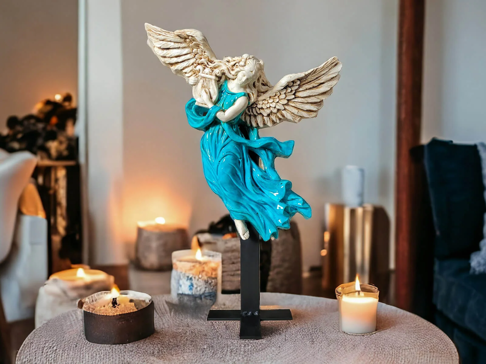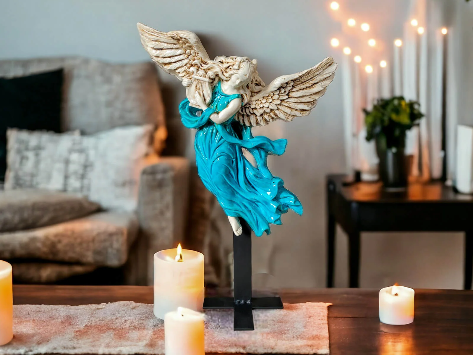 Turkusowa szata anioła jest wyrazem harmonii, spokoju i elegancji. Kolor ten nadaje postaci wyjątkowego charakteru, podkreślając jej artystyczny urok.