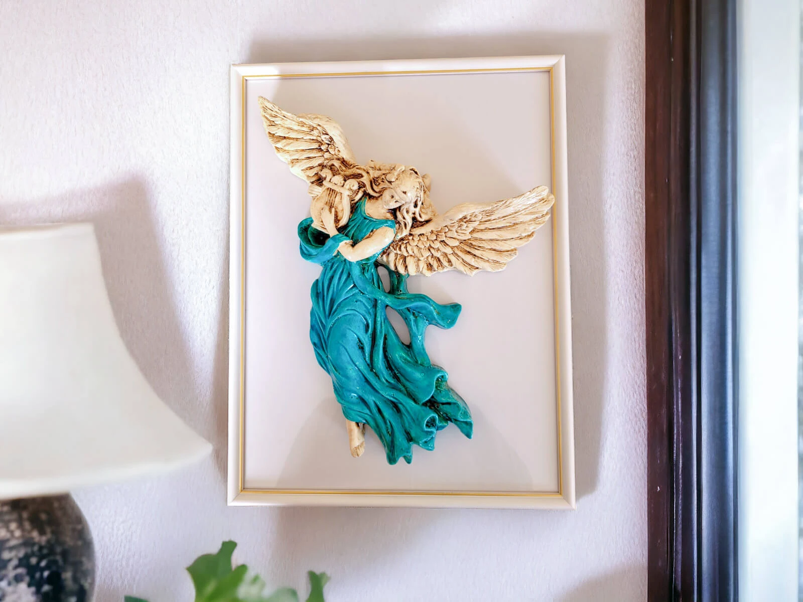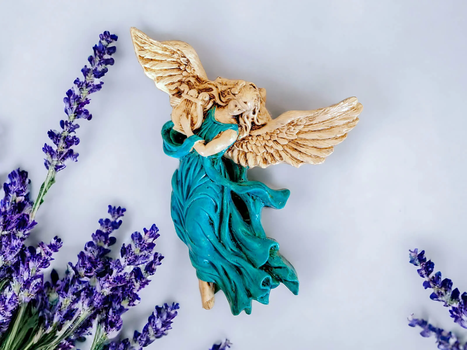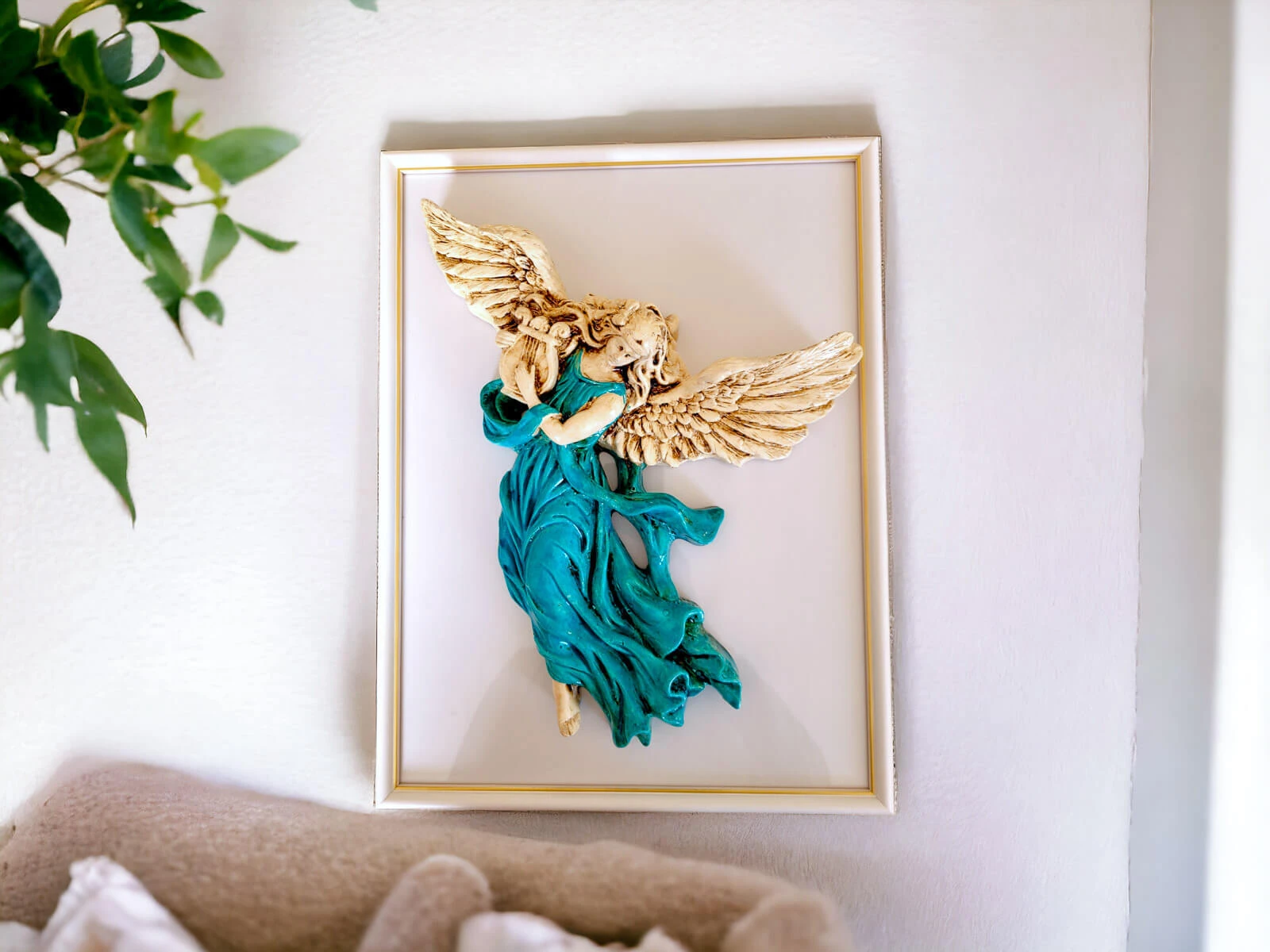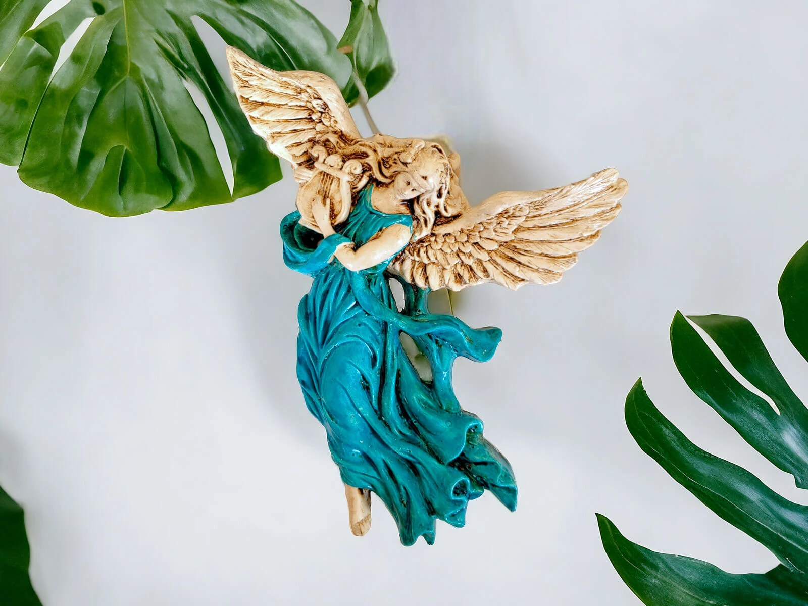 Anioł z Harfą w turkusowej szacie to ręcznie wykonana figurka do powieszenia na ścianie z możliwością personalizacji. Figurka anioła to mistyczne połączenie piękna i starannie wykonanej rękodzielniczej precyzji. Ta delikatna postać, z sercem włożonym w każdy detal, stanie się wyjątkowym dodatkiem do Twojego wnętrza, wprowadzając w nim aurę spokoju i estetyki.