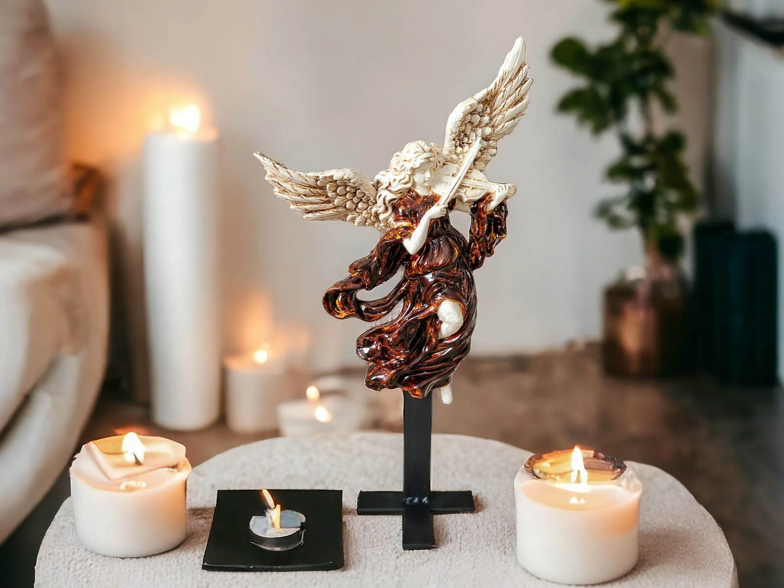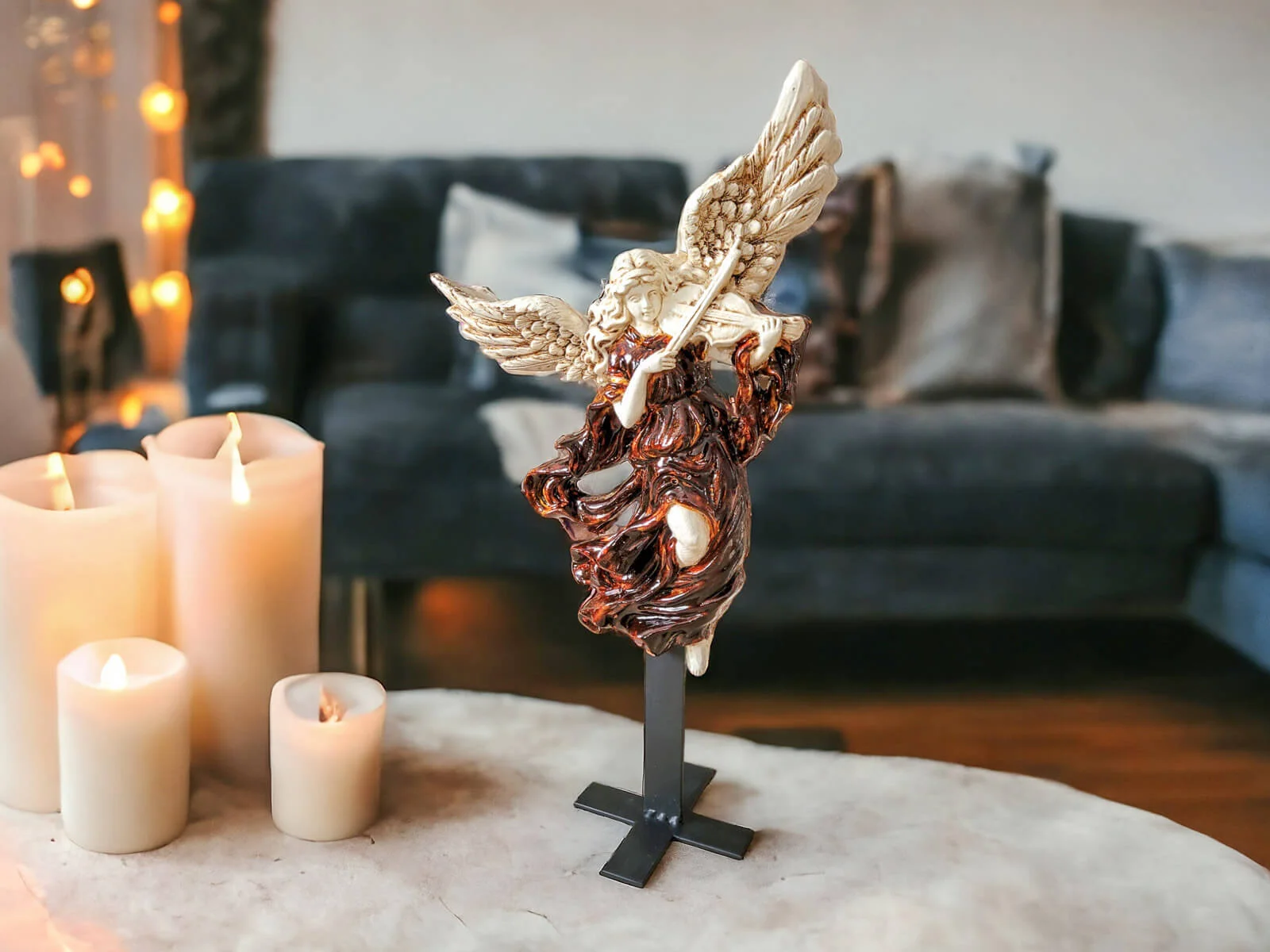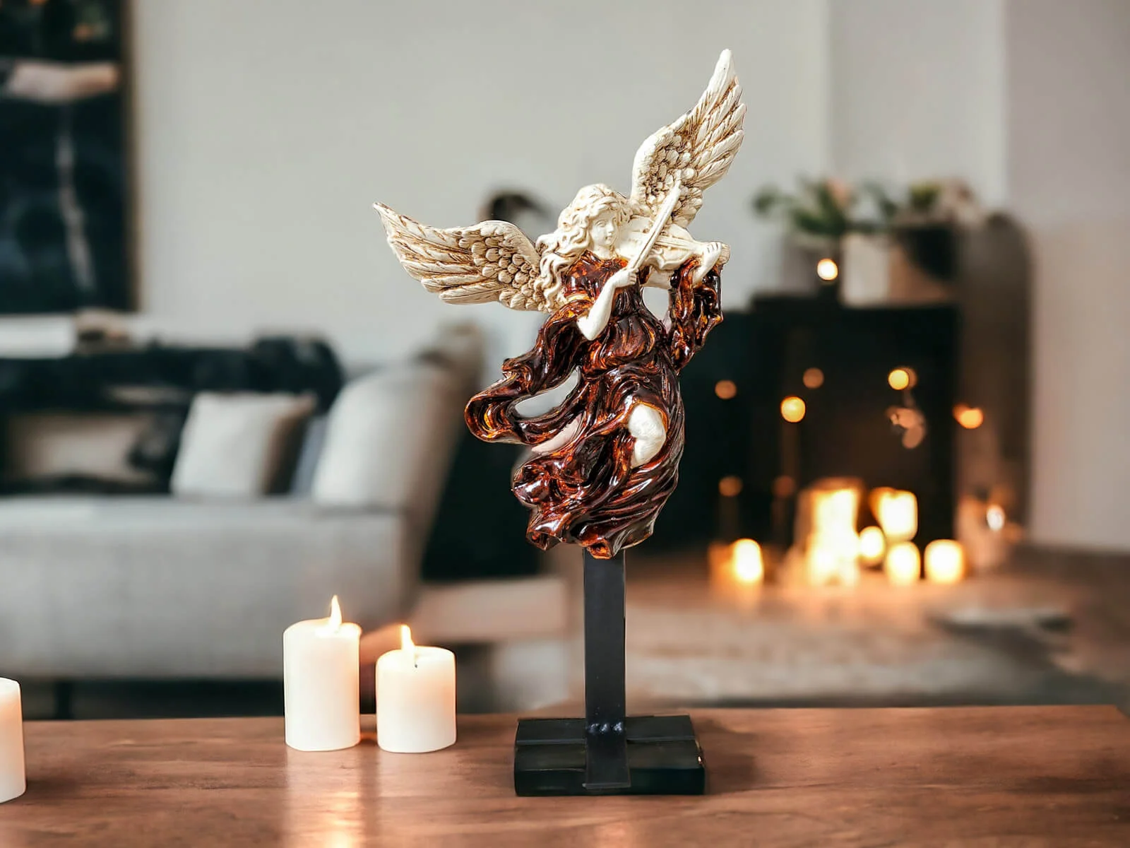 Anioł ten jest niezwykłym połączeniem delikatności i wyrafinowania. Jego rozwinięte skrzydła oraz postawa przywołują nutę niebiańskiego piękna. Każdy detal jest ręcznie formowany i starannie malowany, co nadaje postaci niepowtarzalny charakter.