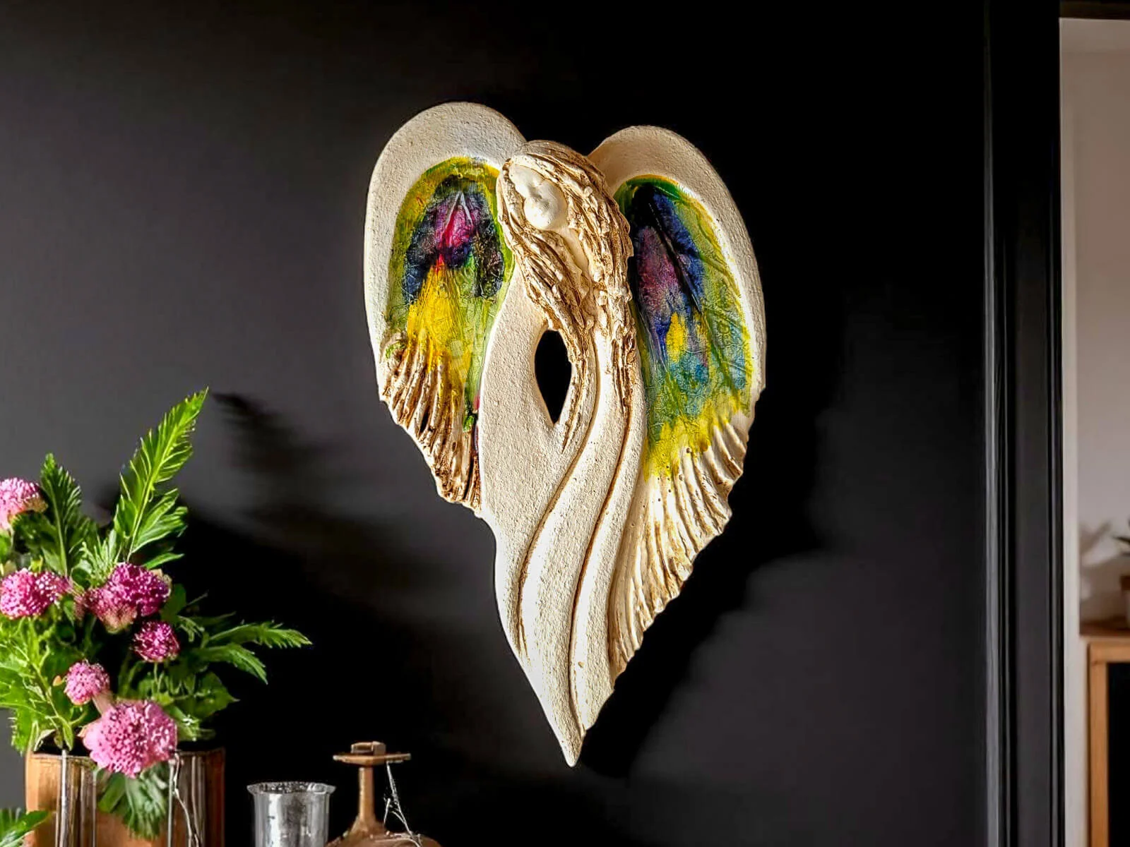 Unikalny anioł Cynthia z kolekcji Art Leaf z wzorami prawdziwych liści. Jedyna sztuka z tym wzorem. Wyjątkowa uroda, ujmująca delikatność, wielka wrażliwość, kwintesencja kobiecości, pełna miłości, porywająca, a jednocześnie zapewniająca spokój. Zobacz jak pięknie chroni miłość, jak dba i troszczy się o Ciebie i Twoich bliskich, opiekuje, obdarza wiarą dającą siłę, rozlewa radość do każdego zakątka mieszkania, przepełnia je dobrocią, sercem pełnym nadziei, sprawia, że miłość dwojga ludzi jest spokojną przystanią.