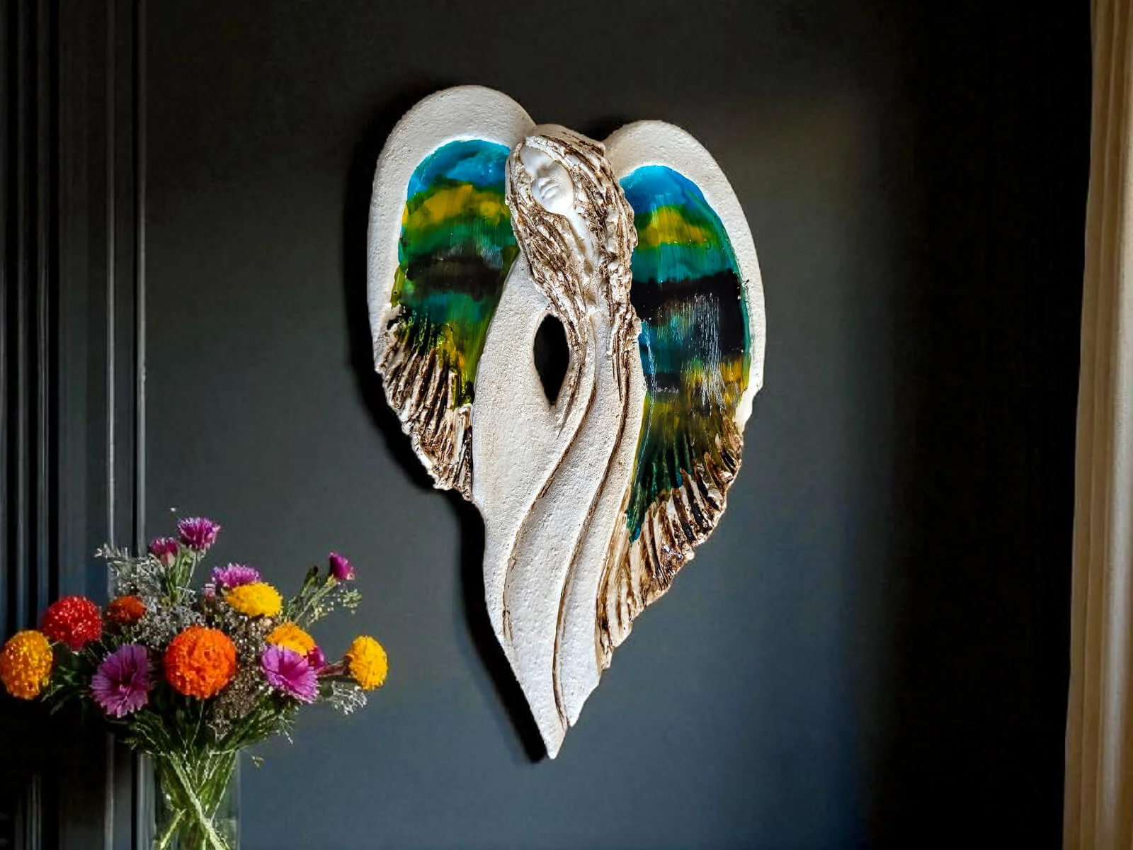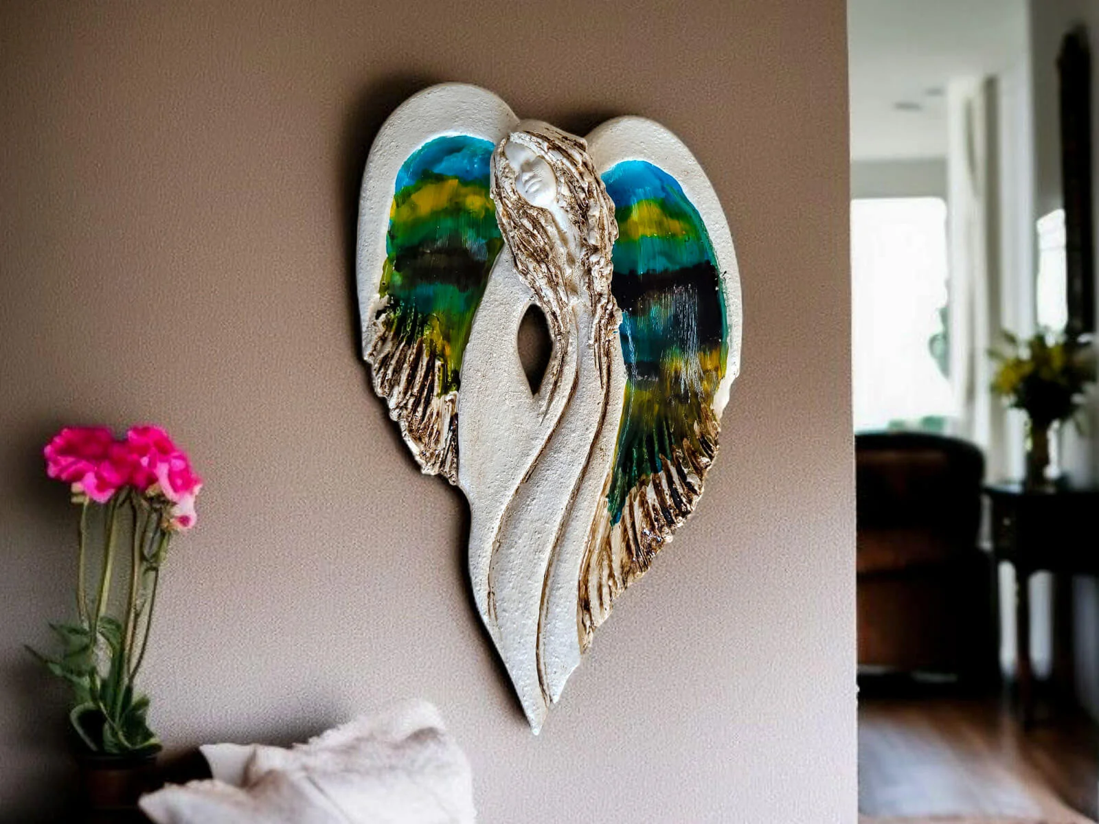 Unikalny anioł Cynthia z kolekcji Art Leaf z wzorami prawdziwych liści. Jedyna sztuka z tym wzorem. Wyjątkowa uroda, ujmująca delikatność, wielka wrażliwość, kwintesencja kobiecości, pełna miłości, porywająca, a jednocześnie zapewniająca spokój. Zobacz jak pięknie chroni miłość, jak dba i troszczy się o Ciebie i Twoich bliskich, opiekuje, obdarza wiarą dającą siłę, rozlewa radość do każdego zakątka mieszkania, przepełnia je dobrocią, sercem pełnym nadziei, sprawia, że miłość dwojga ludzi jest spokojną przystanią.