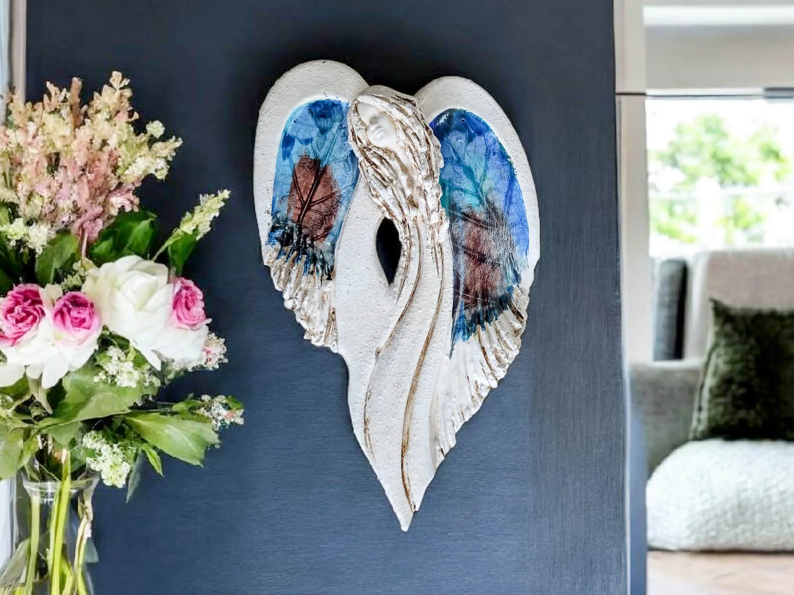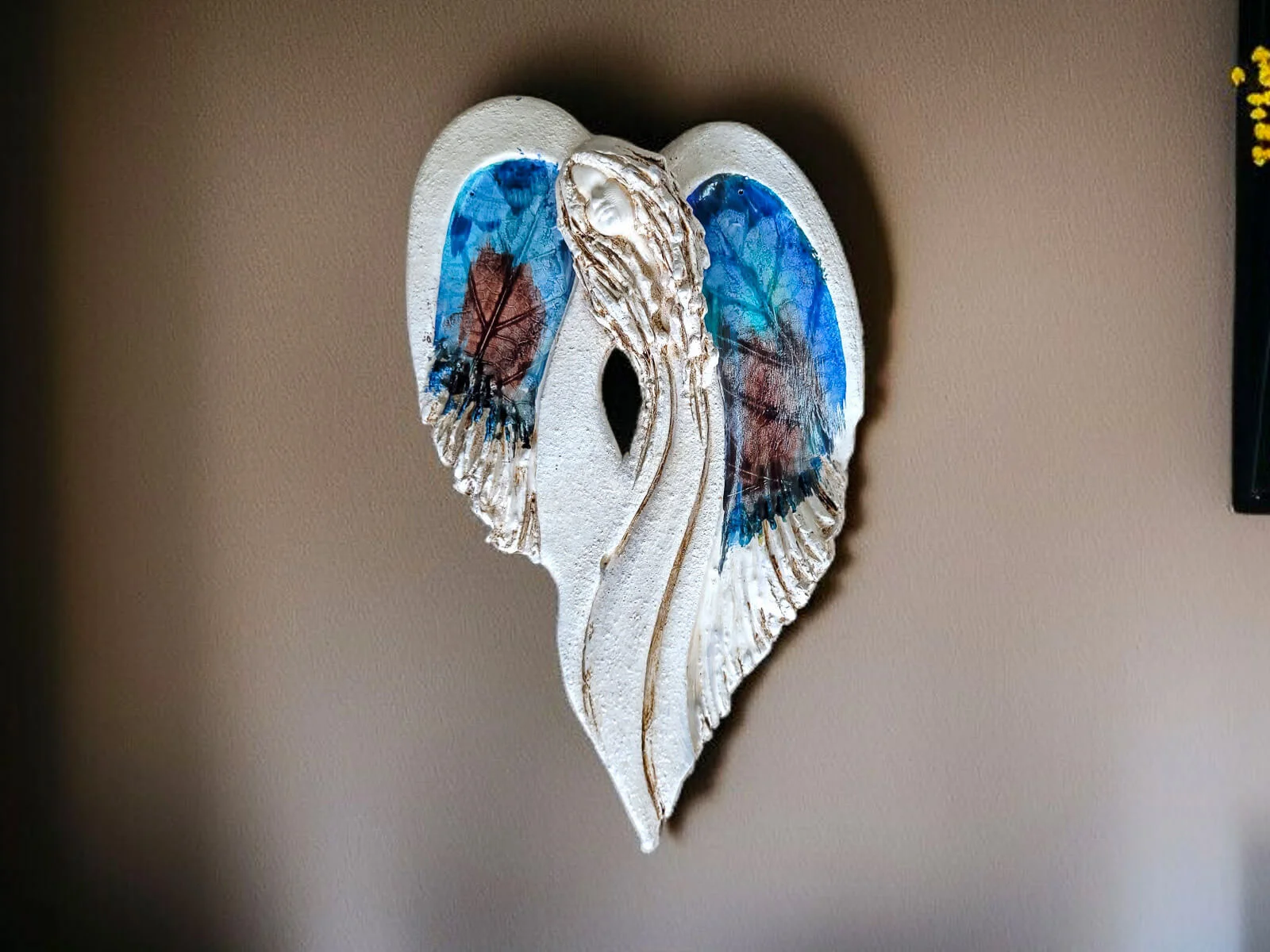 Unikalny anioł Cynthia z kolekcji Art Leaf z wzorami prawdziwych liści. Jedyna sztuka z tym wzorem. Wyjątkowa uroda, ujmująca delikatność, wielka wrażliwość, kwintesencja kobiecości, pełna miłości, porywająca, a jednocześnie zapewniająca spokój. Zobacz jak pięknie chroni miłość, jak dba i troszczy się o Ciebie i Twoich bliskich, opiekuje, obdarza wiarą dającą siłę, rozlewa radość do każdego zakątka mieszkania, przepełnia je dobrocią, sercem pełnym nadziei, sprawia, że miłość dwojga ludzi jest spokojną przystanią.