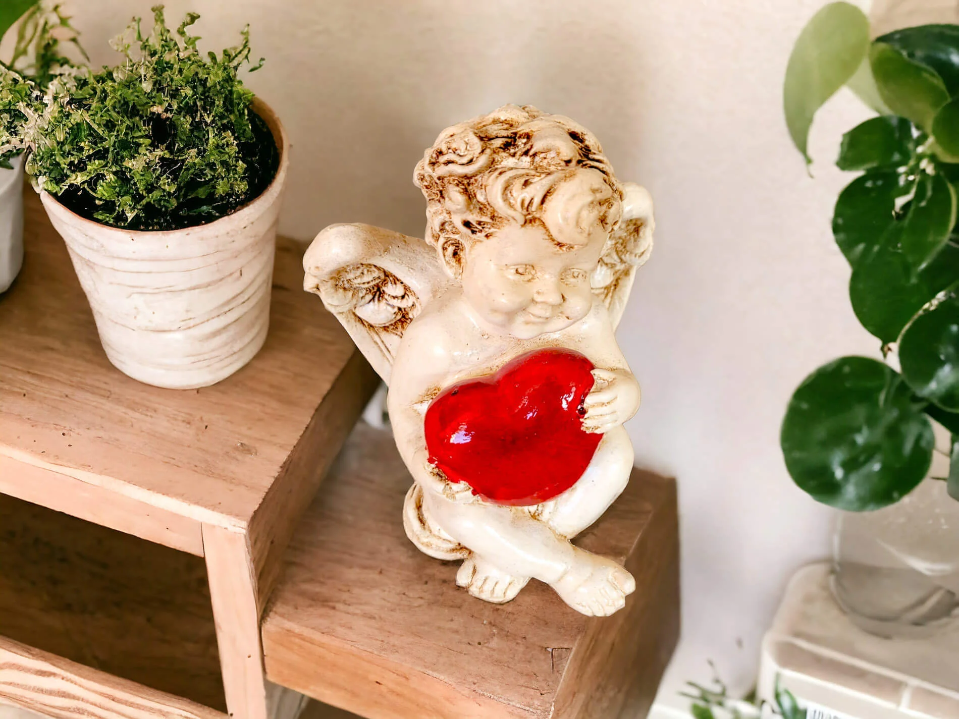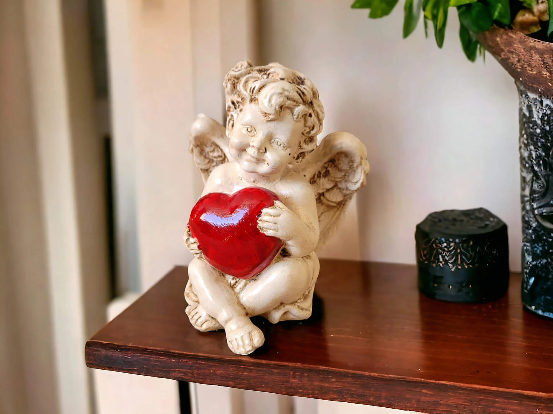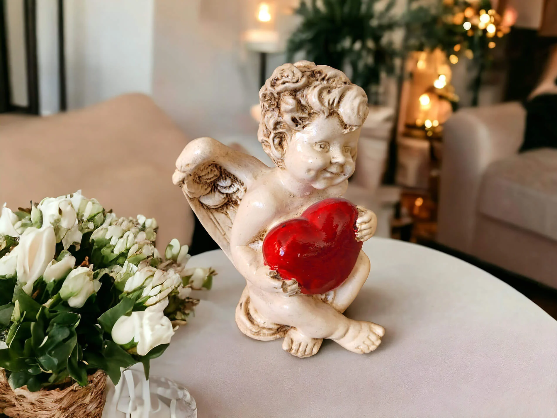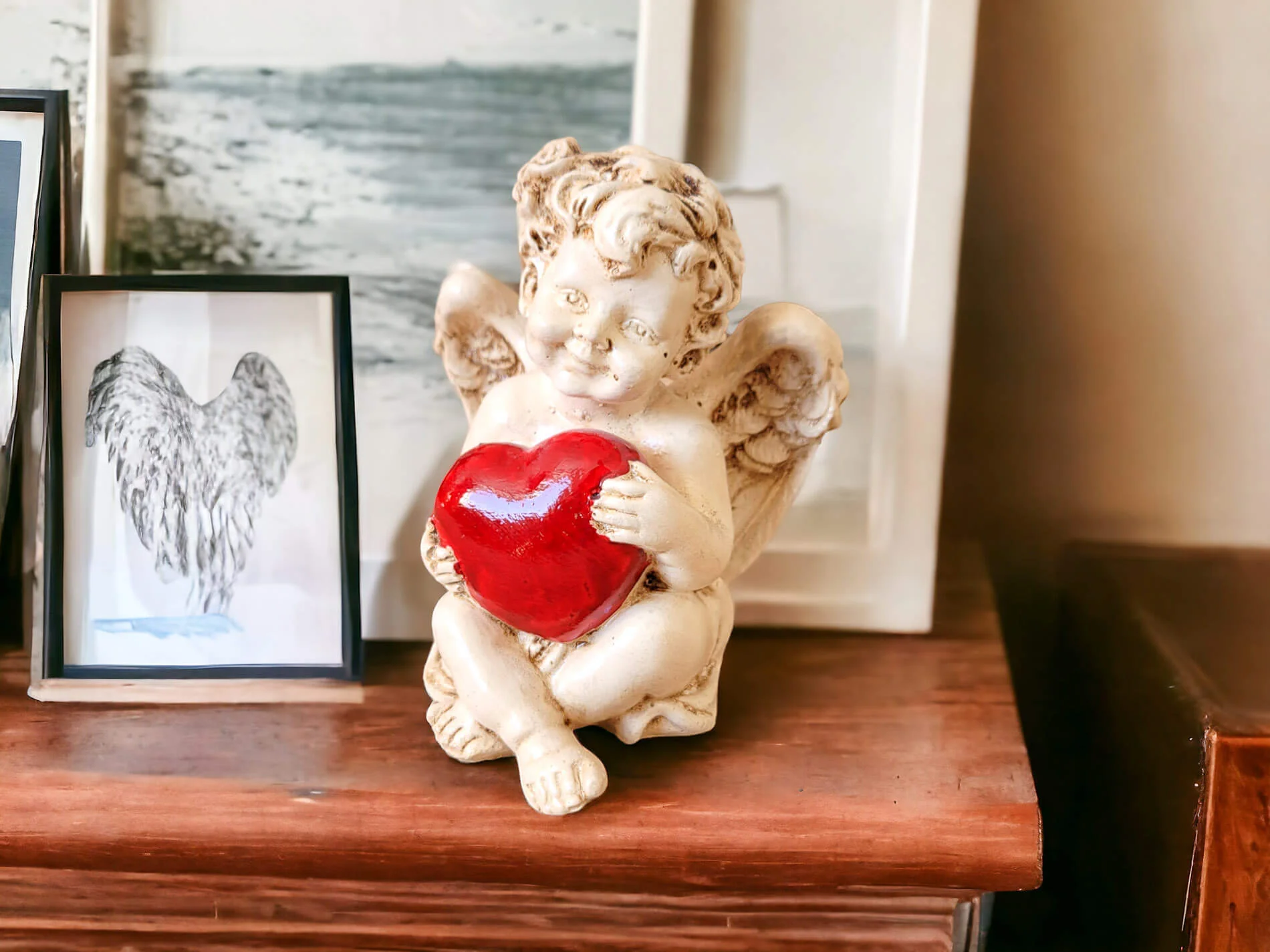 Aniołek Amorek to urocza, mała figurka, emanująca pozytywną energią i delikatnością. Ta ręcznie wykonana dekoracja przypomina renesansowe amorki, zwane także Putto. Siedzący Aniołek Amore trzyma w swoich delikatnych dłoniach duże, czerwone serce, które dodaje mu wyjątkowego uroku. Jego uśmiech jest jak radosna minka chłopca, emanująca czystą radością i niewinnością. To symboliczne wyrażenie miłości, dobra i optymizmu, które idealnie wprowadza atmosferę ciepła i harmonii.