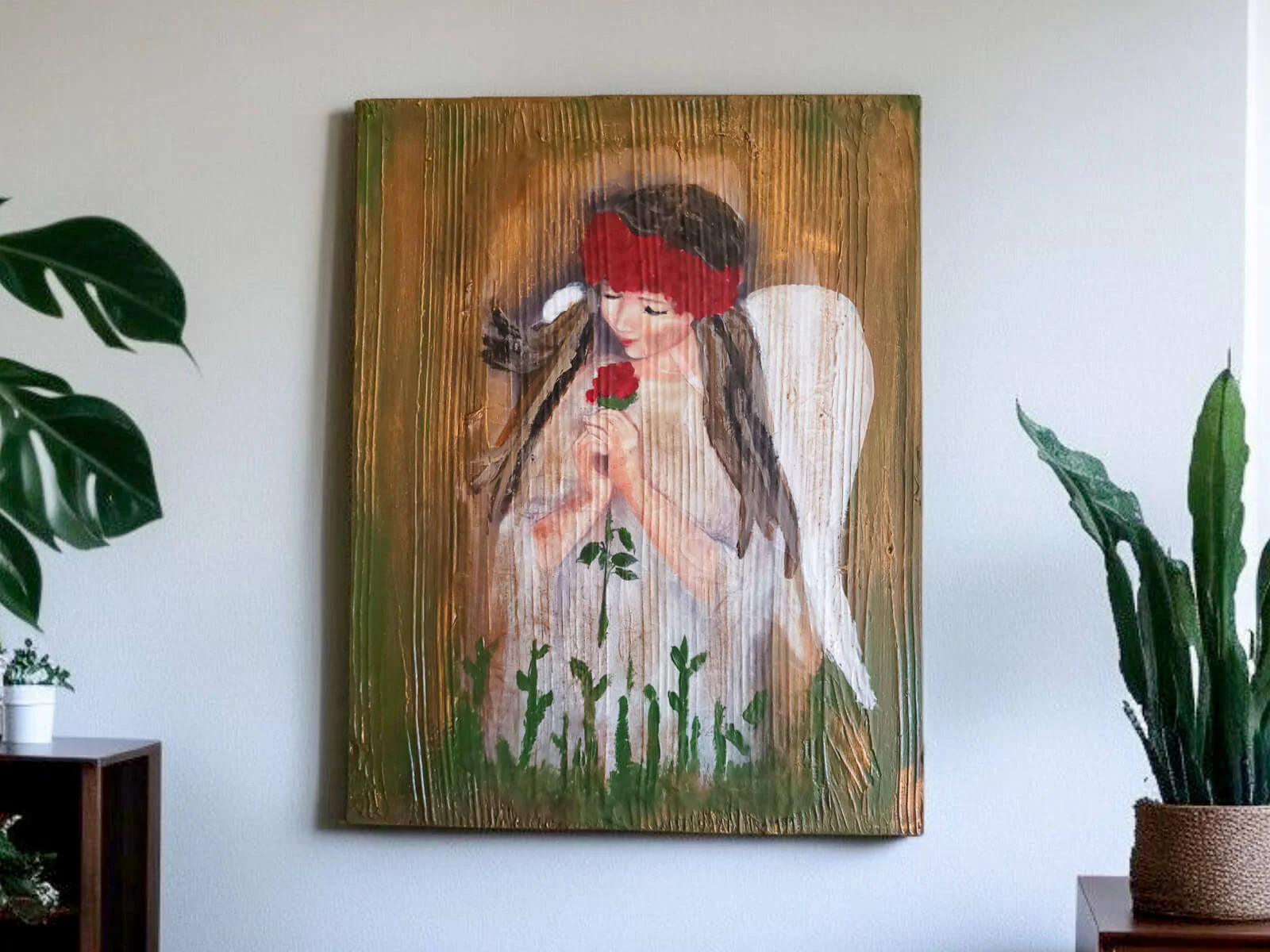 Obraz Anioła dziewczynki z różą. Obraz wykonany na desce. Idealny na prezent np. jako pamiątka I Komunii.
