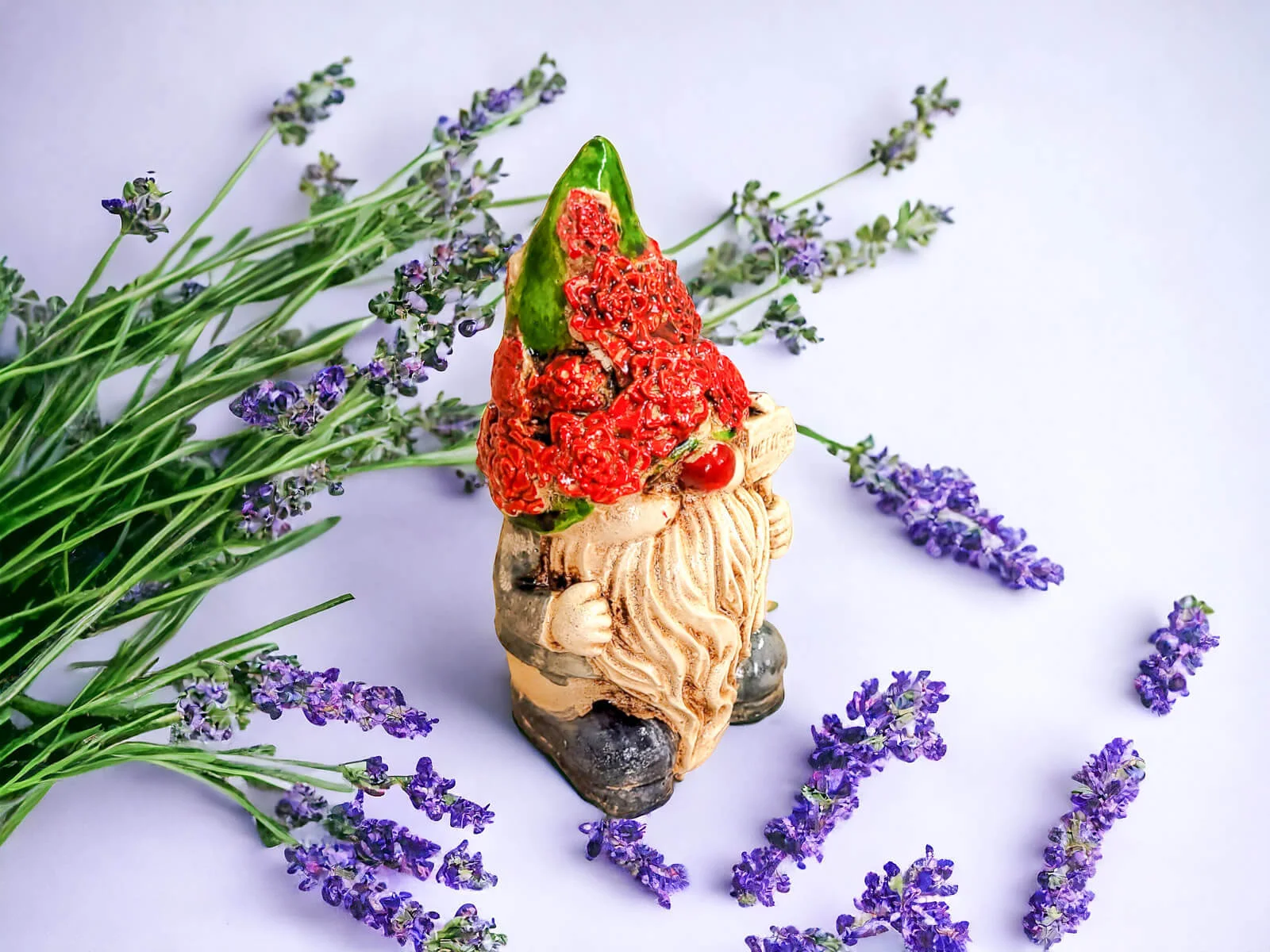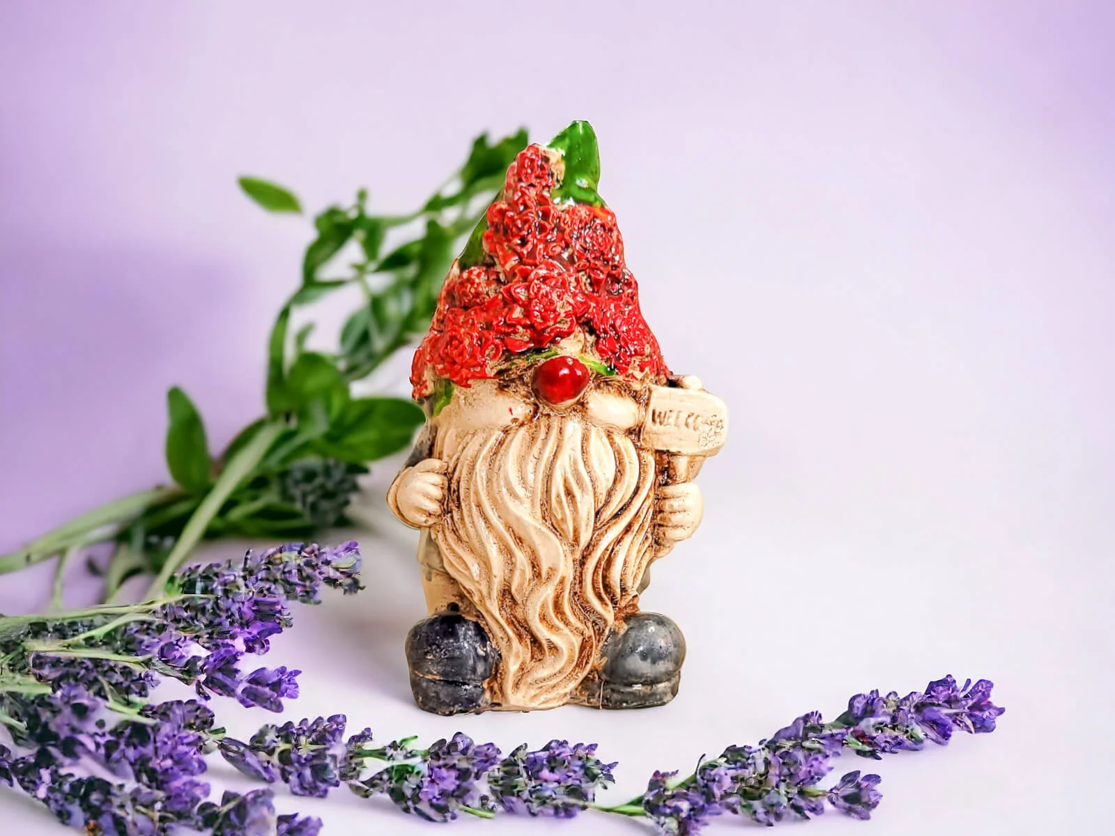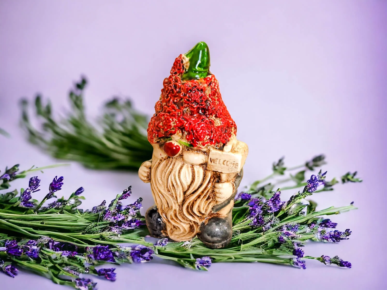 Skrzat Witaj prezentuje się w zielonym ubraniu, co nadaje mu subtelności i neutralności. Jego czerwona pokryta kwiatami czapka jest modnym elementem, który Skrzat nosi z dumą. Ta długa czapka to jego nieodłączny atrybut, który nadaje mu charakterystyczny wygląd.