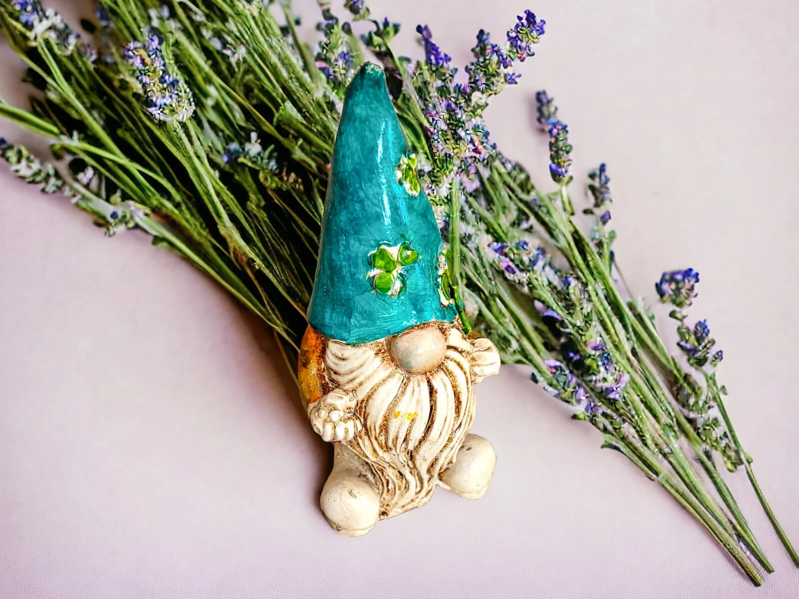 Jego turkusowa za duża czapka z długim szpicem pełni nie tylko funkcję stylowego dodatku, ale także miejsca, do którego często przyklejają się koniczynki. Te pięciolistne koniczynki to znak szczęścia, a przypisywane im magiczne właściwości sprawiają, że Skrzat Szczęściarz uważany jest za posłańca pomyślności.