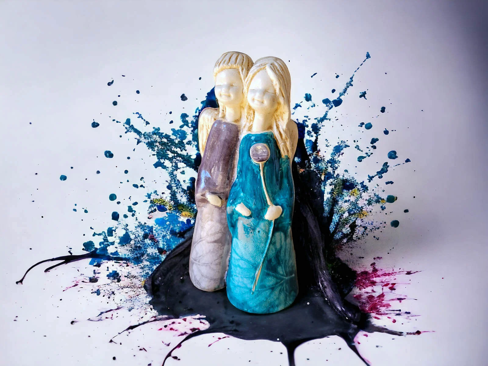 Ręcznie robiona figurka aniołów z unikalnej kolekcji Art – Apple & Ella. Te wyjątkowe anioły w szaro turkusowych barwach zachwycają nie tylko swoją estetyką, ale także unikalnością, dzięki wykorzystaniu prawdziwych liści, które nadają im niepowtarzalny charakter.