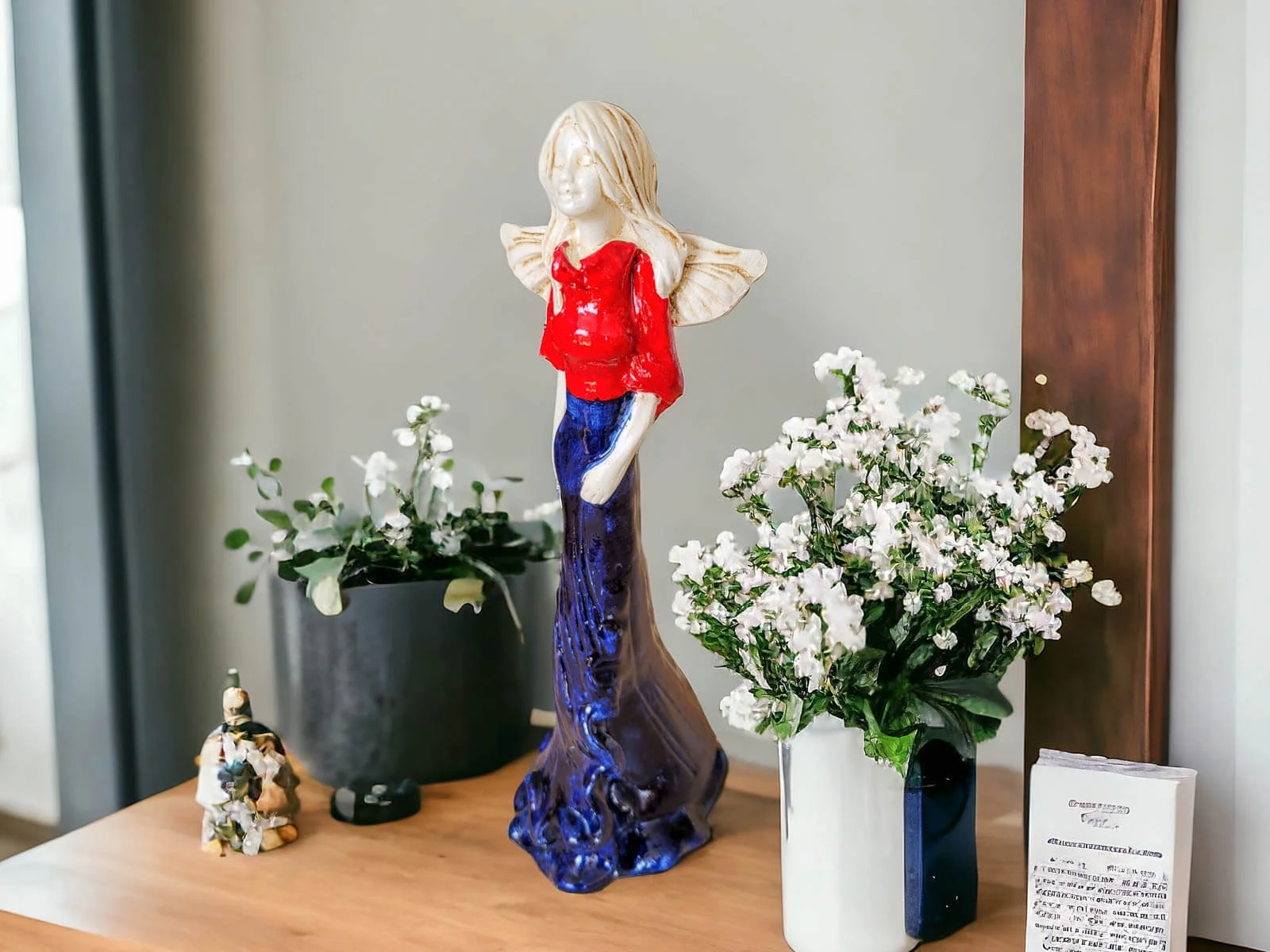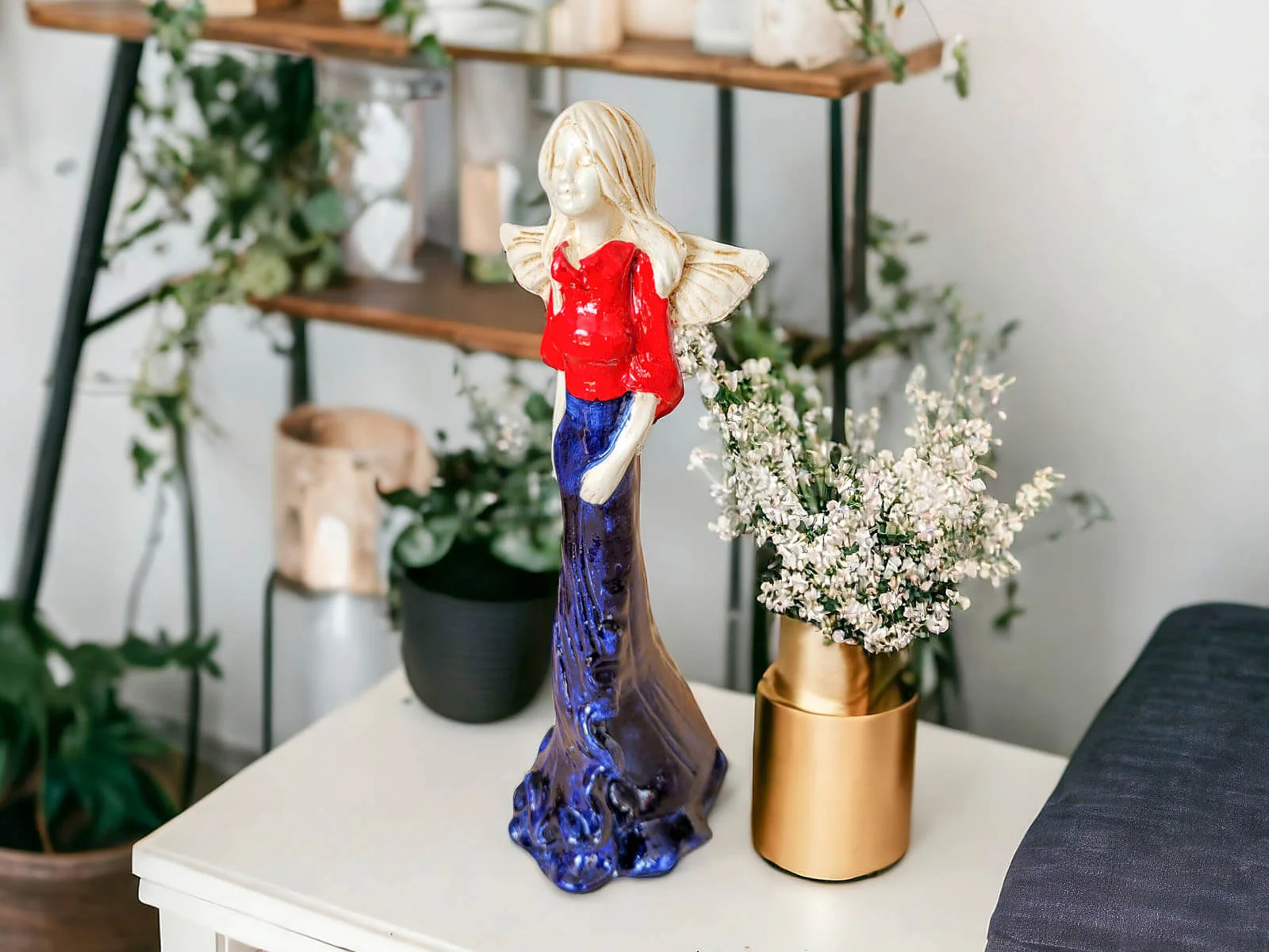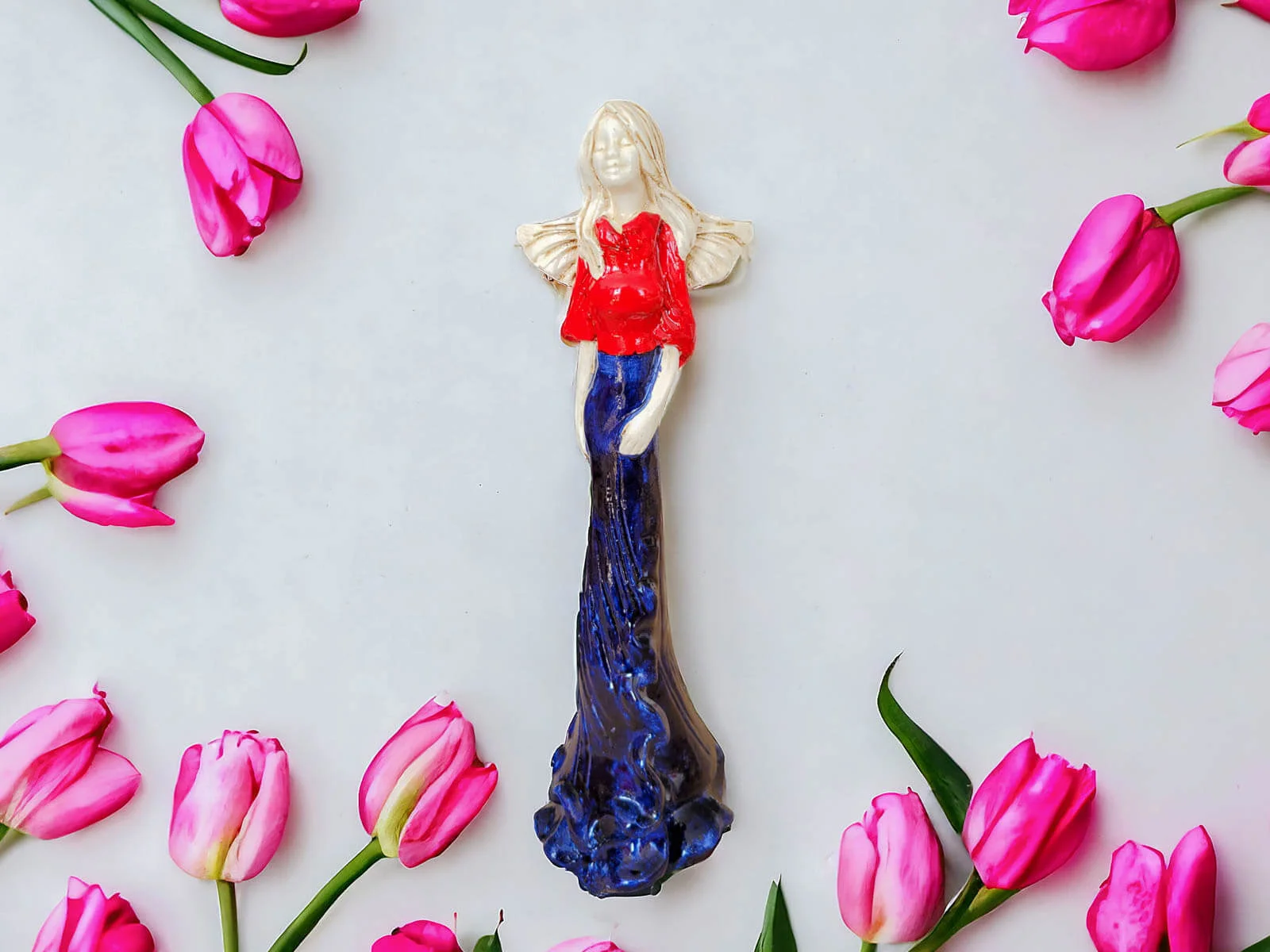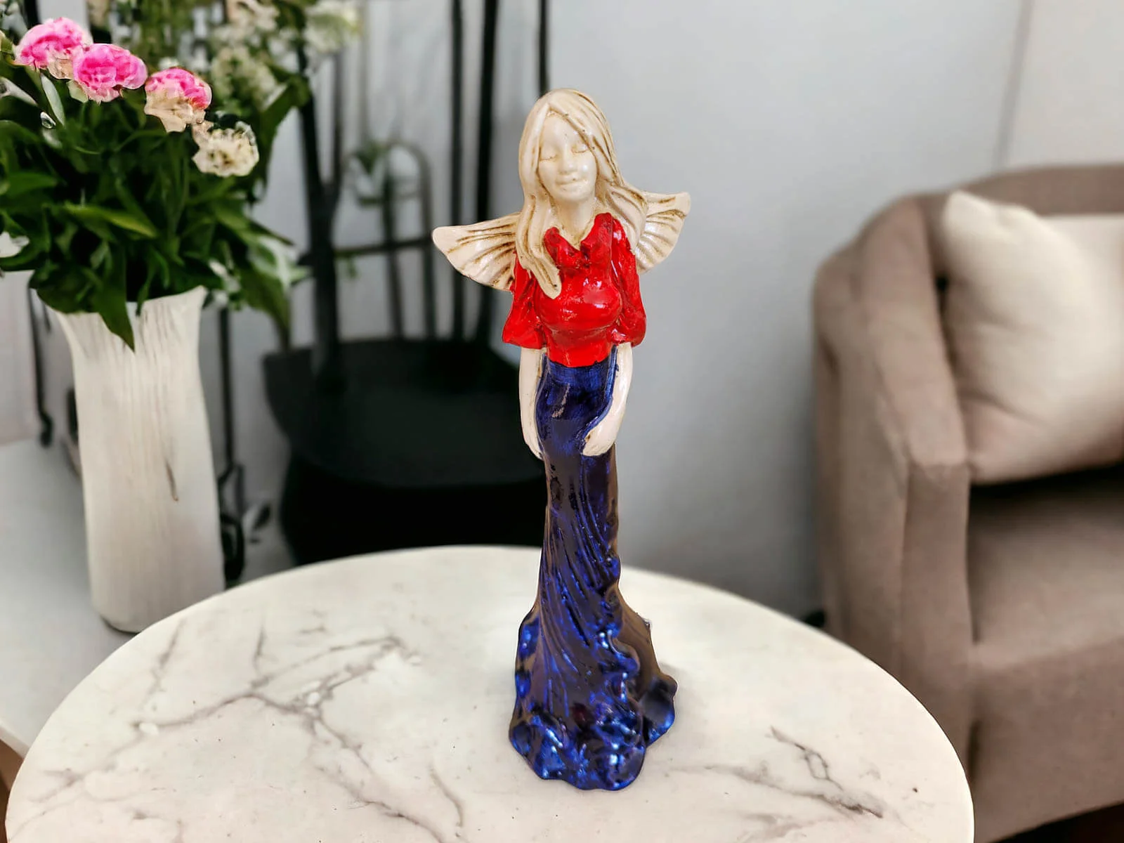 Anioł Margaret w granatowej sukni z czerwonym topem to ręcznie wykonana figurka. Jej imię wywodzi się od greckiego słowa ,,margerites” co oznacza ,,perła”. Gosia to skromna dziewczyna pełna wdzięku i uroku osobistego. Jest zawsze uśmiechnięta i optymistycznie nastawiona do życia. Urokiem i subtelnością przyciąga do siebie dużo adoratorów. Małgorzata pięknie prezentuje długą, jasno-granatową suknię. Ma delikatne skrzydełka. Idealnie nadaje się na prezent dla kobiet. Świetnie sprawdzi się jako ozdoba w każdym wnętrzu.