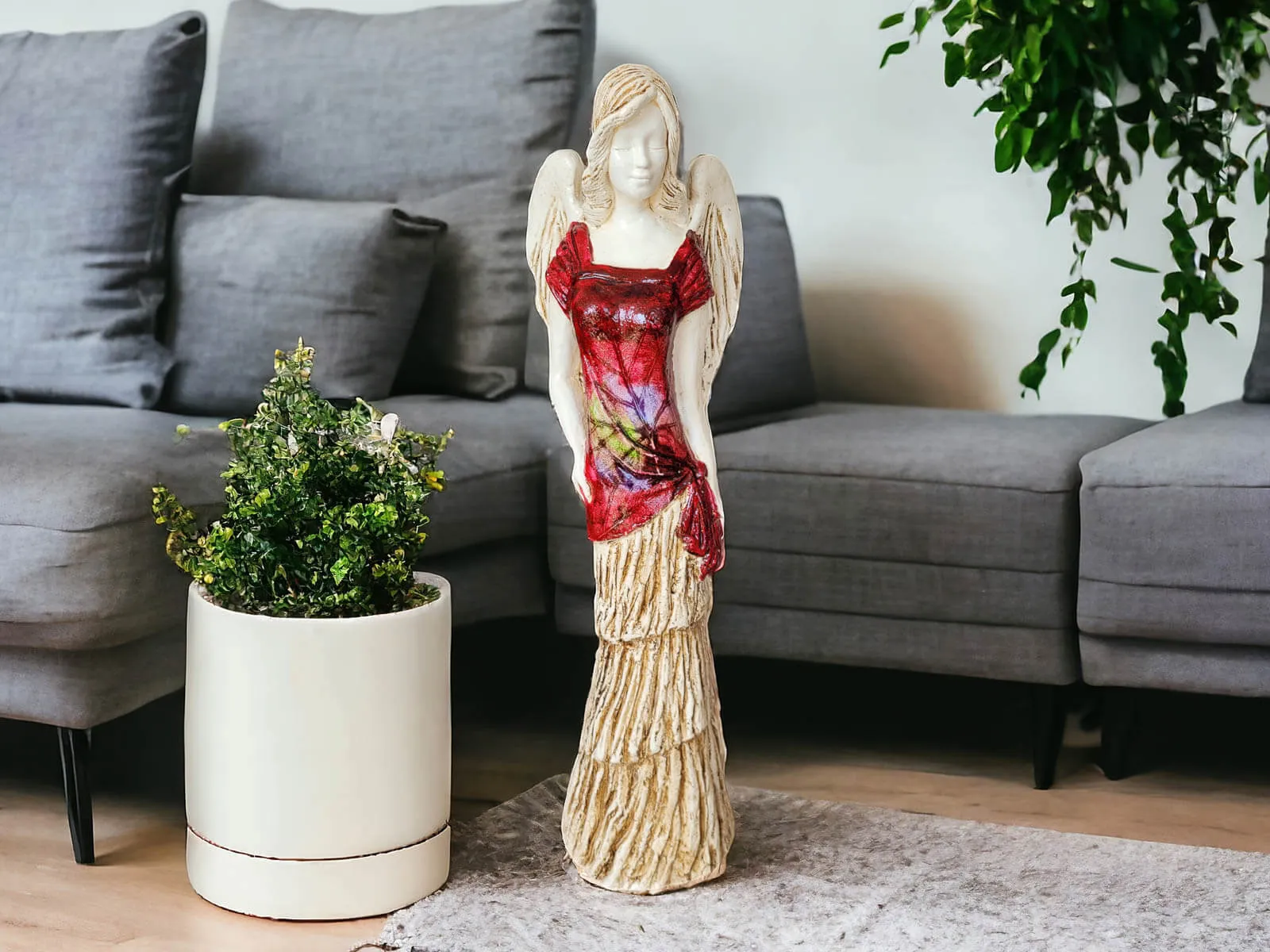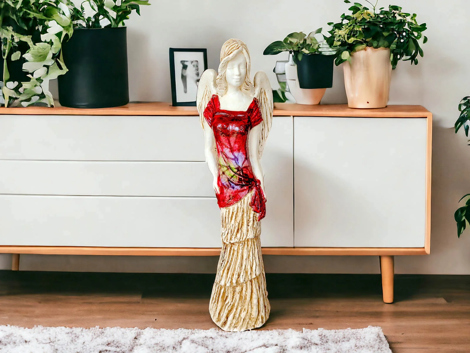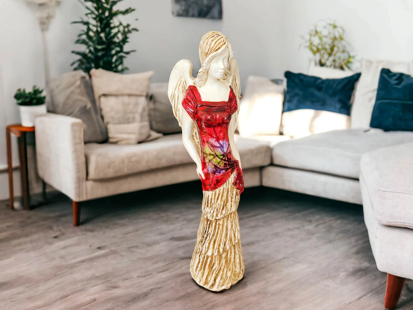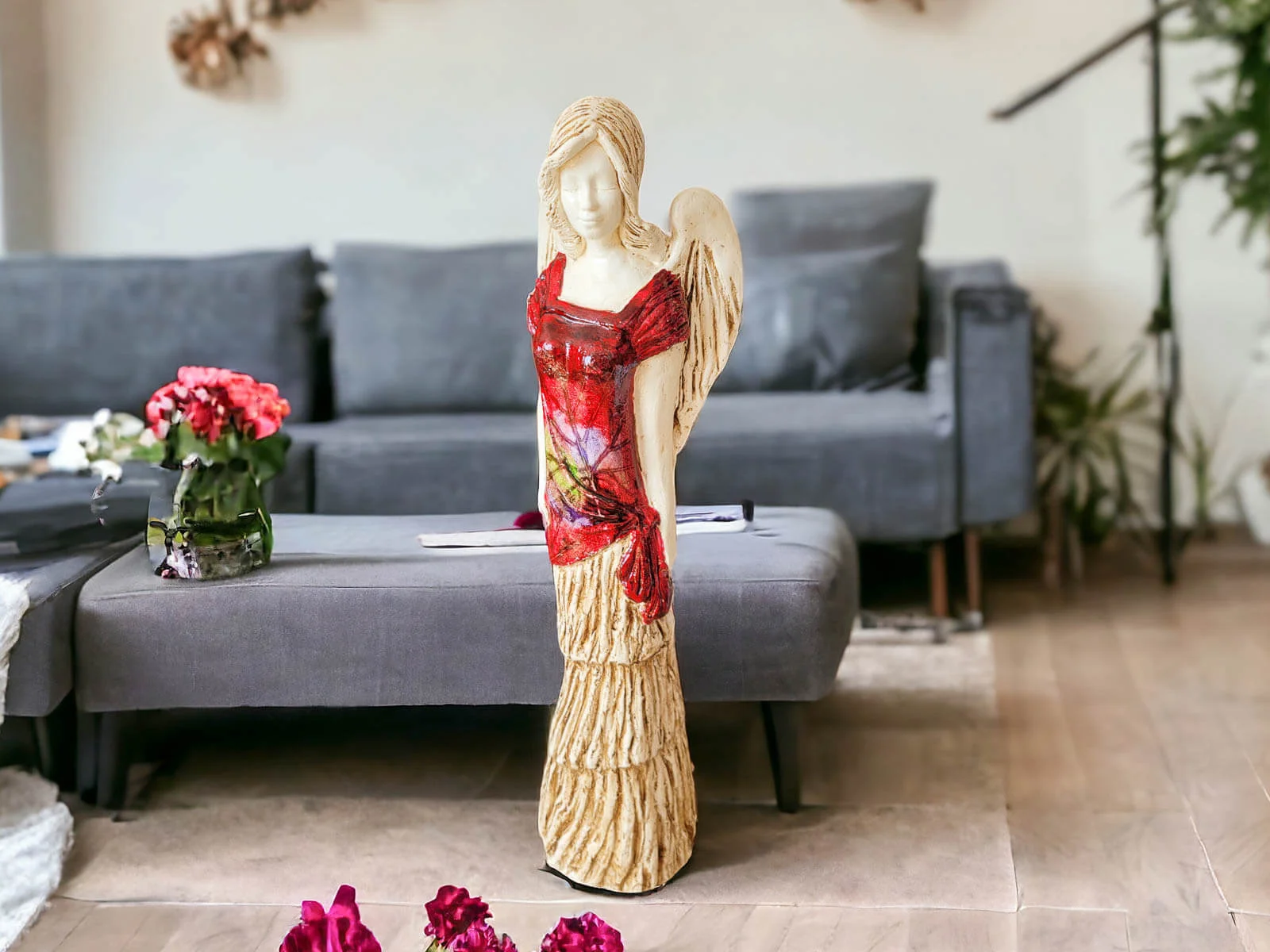 Anioł Victoria ubrany jest w bogato zdobioną suknię w odcieniu głębokiego bordo, która symbolizuje miłość, pasję i głębokie emocje. Jej elegancka sylwetka i delikatne, subtelne rysy twarzy nadają figurce wyjątkowej gracji i wdzięku. Bordowa suknia pięknie kontrastuje z delikatnym blaskiem prawdziwych liści, tworząc harmonijną kompozycję, która przyciąga wzrok i wprowadza do wnętrza atmosferę spokoju i ciepła.