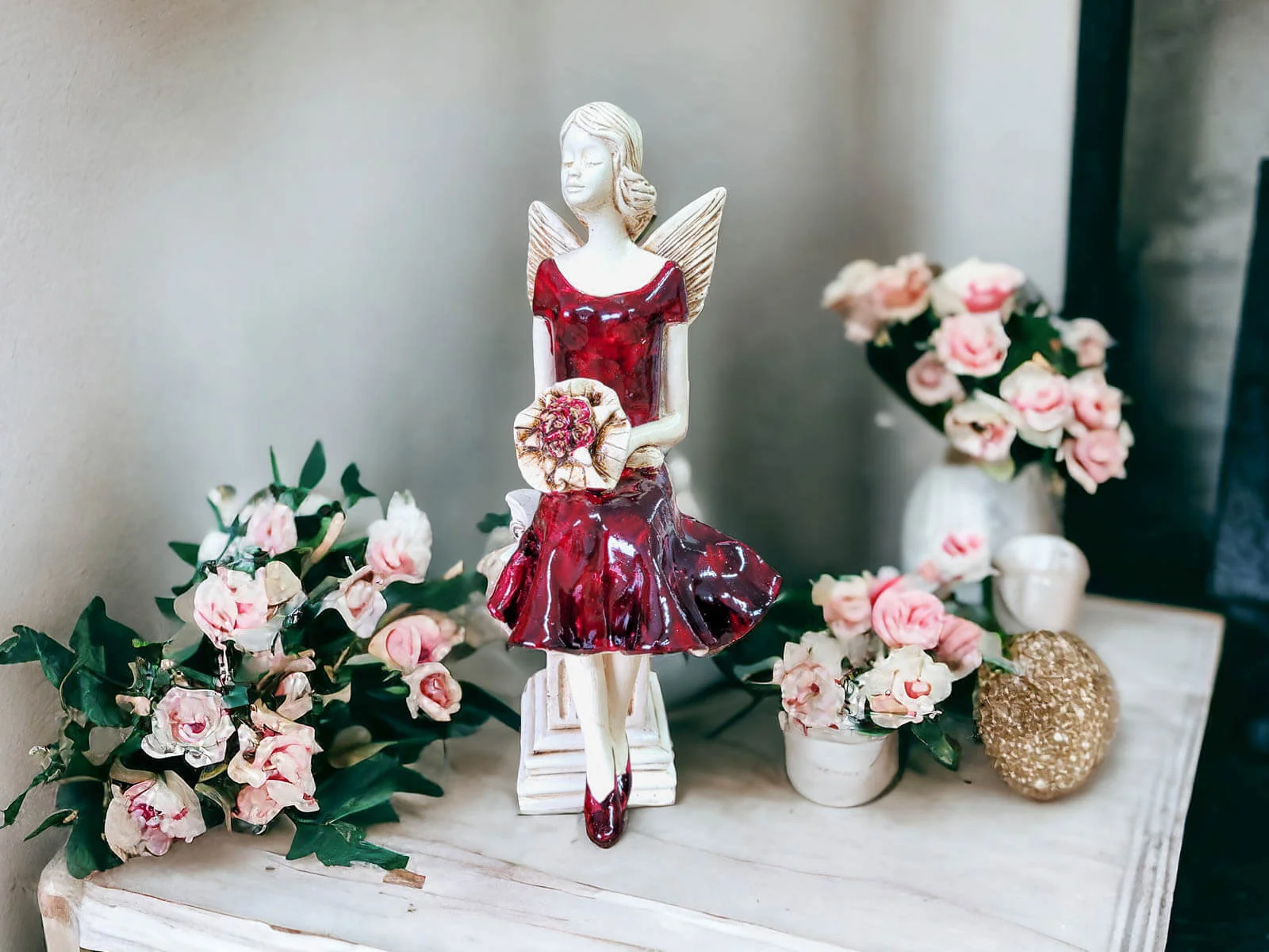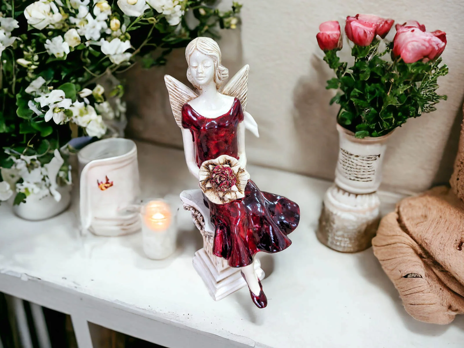 Figurka Anioła Pauline to wyjątkowa ozdoba, która swoim wyglądem i przesłaniem przynosi do wnętrza harmonię, ciepło oraz inspirację. Pauline, ubrana w elegancką, burgundową suknię, z wdziękiem wyciąga ramiona ku słońcu, jakby łapała jego promienie, przynosząc blask i pozytywną energię do Twojego domu. Jej postawa wyraża poczucie spokoju, siły oraz wewnętrznej równowagi, a jej ręcznie wykonane detale czynią ją prawdziwym arcydziełem rzemieślniczym.
