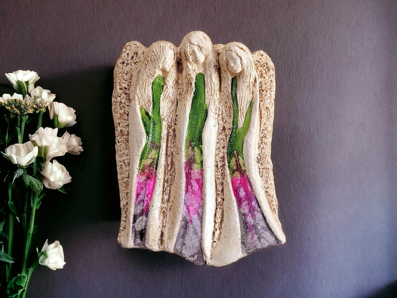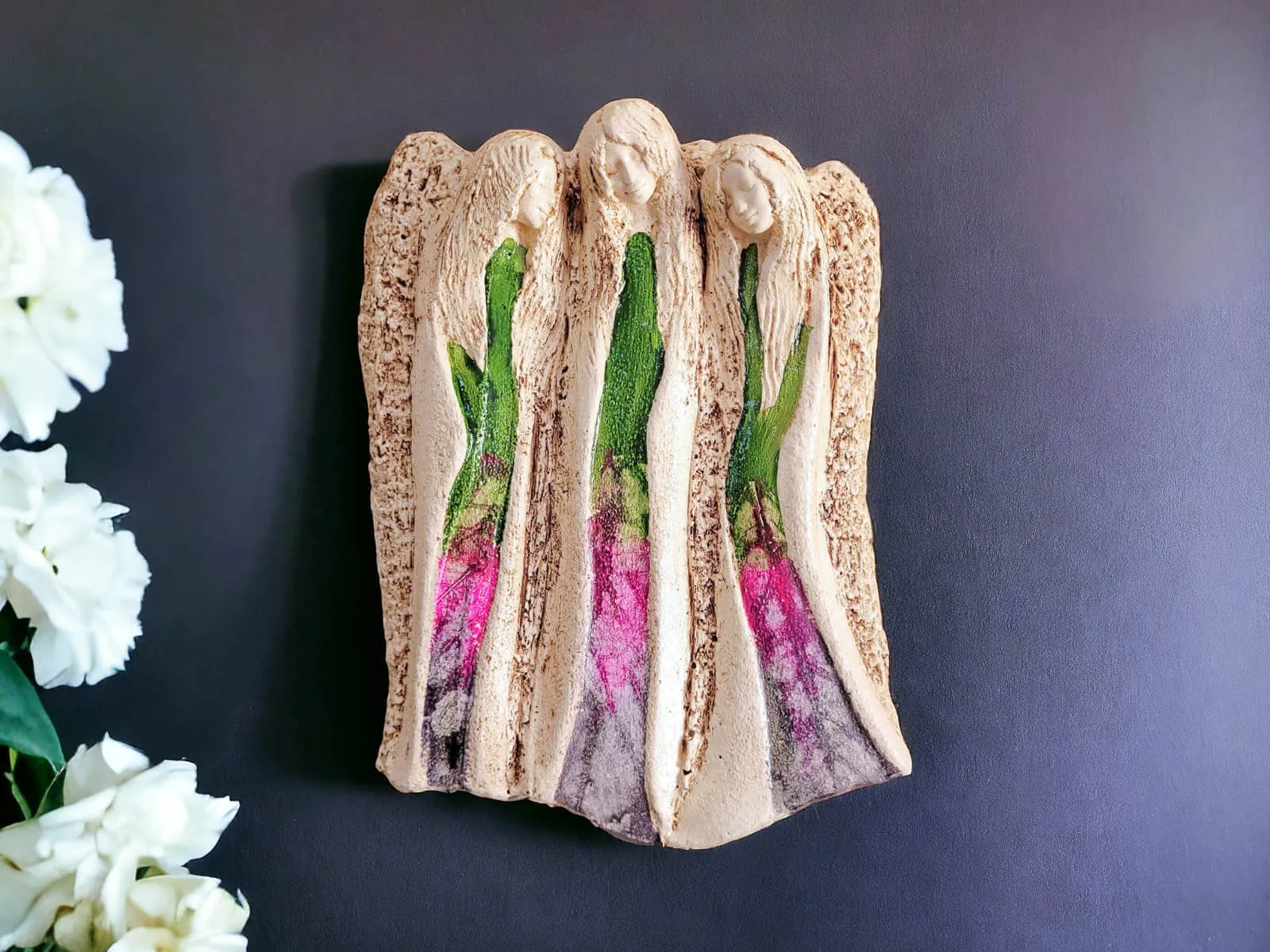 Figurka Anioły Wiara, Nadzieja, Miłość z kolekcji Art Leaf to wyjątkowa dekoracja, która emanuje głębokim pięknem i symboliką. Ręcznie wykonana z najwyższej jakości gipsu, każda figurka przedstawiająca trzy anioły jest jedyna w swoim rodzaju, co czyni ją niezwykle cenną ozdobą i niepowtarzalnym elementem kolekcji. Anioły te symbolizują trzy kluczowe wartości – wiarę, nadzieję i miłość – które przypominają o najważniejszych aspektach życia, wnosząc do wnętrza aurę spokoju, ciepła i inspiracji. Figurki z tej kolekcji są ręcznie malowane, dzięki czemu każda z nich posiada unikalny charakter oraz subtelne niuanse kolorystyczne, nadające jej niepowtarzalnego wdzięku i elegancji.