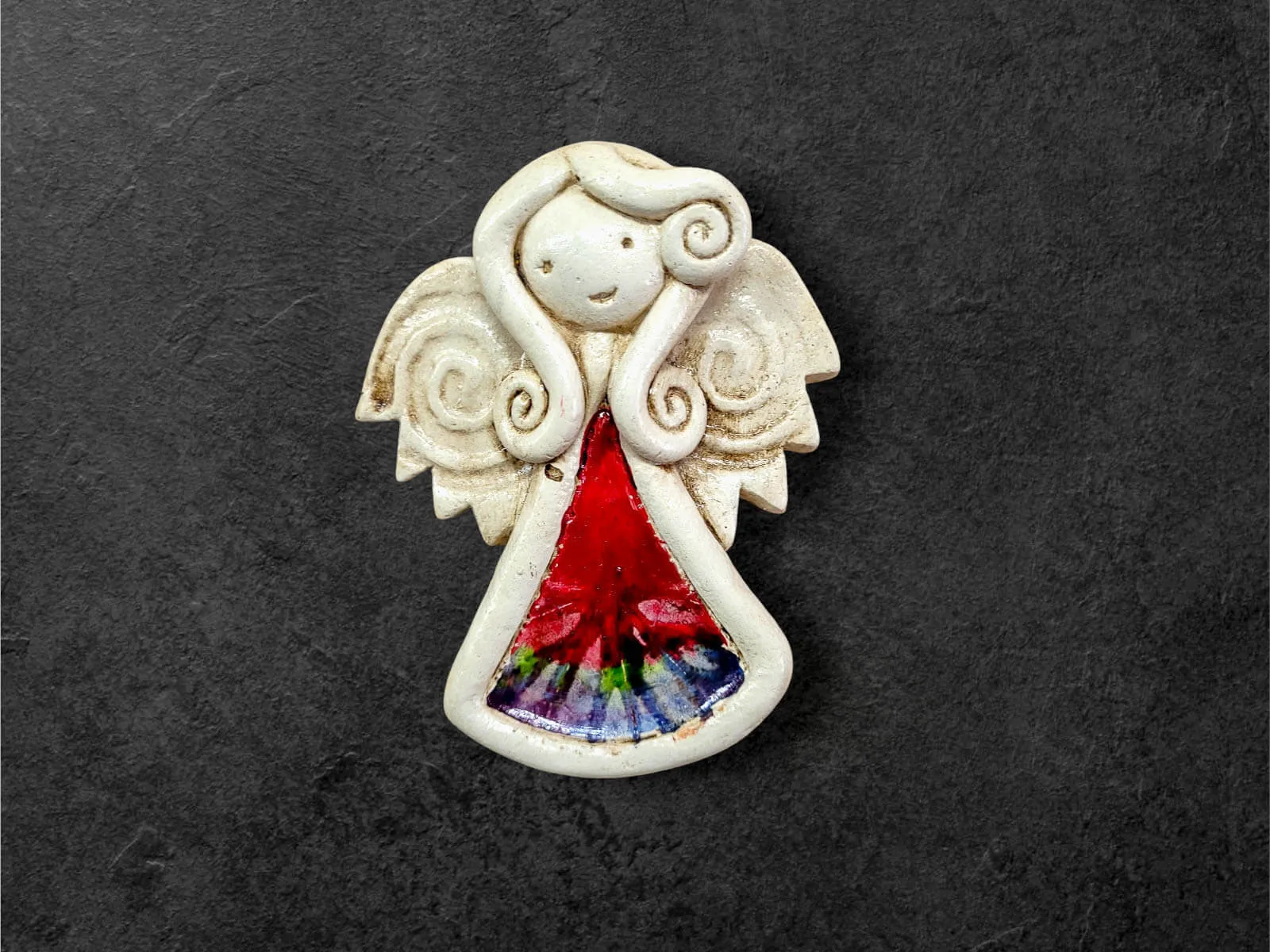 Ręcznie robiony aniołek Niunia w unikatowej wersji Art Leaf z liściem. Niunia jest śliczną dziewczynką, która całym sercem kocha swoją rodzinę. Jest troskliwa, martwi się o innych. Jest ubrana w kolorową sukienkę z wzorem liścia. Ma delikatne skrzydełka. Kolor czerwony jest symbolem miłości i namiętności. Figurka idealnie nadaje się na prezent dla ukochanej osoby z okazji walentynek.