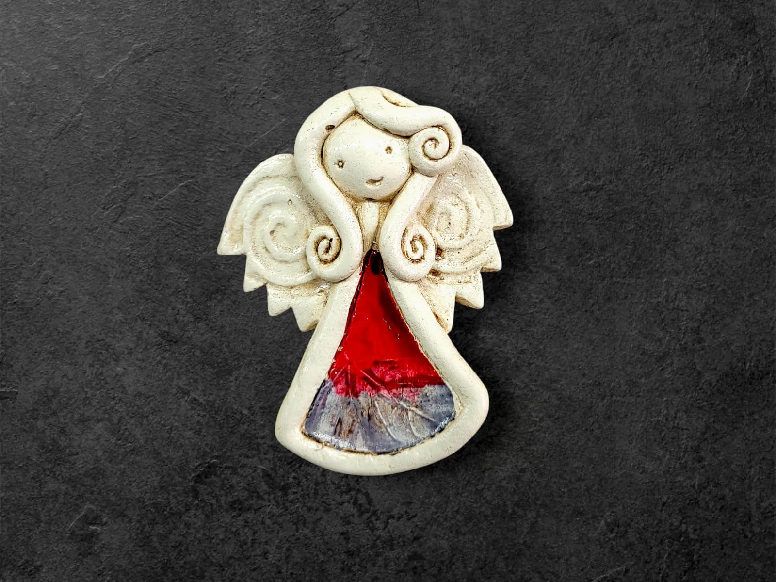 Ręcznie robiony aniołek Niunia w unikatowej wersji Art Leaf z liściem. Niunia jest śliczną dziewczynką, która całym sercem kocha swoją rodzinę. Jest troskliwa, martwi się o innych. Jest ubrana w kolorową sukienkę z wzorem liścia. Ma delikatne skrzydełka. Kolor czerwony jest symbolem miłości i namiętności. Figurka idealnie nadaje się na prezent dla ukochanej osoby z okazji walentynek.