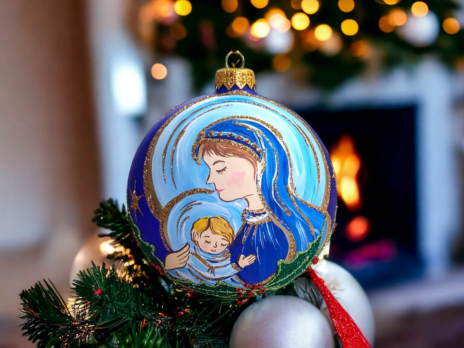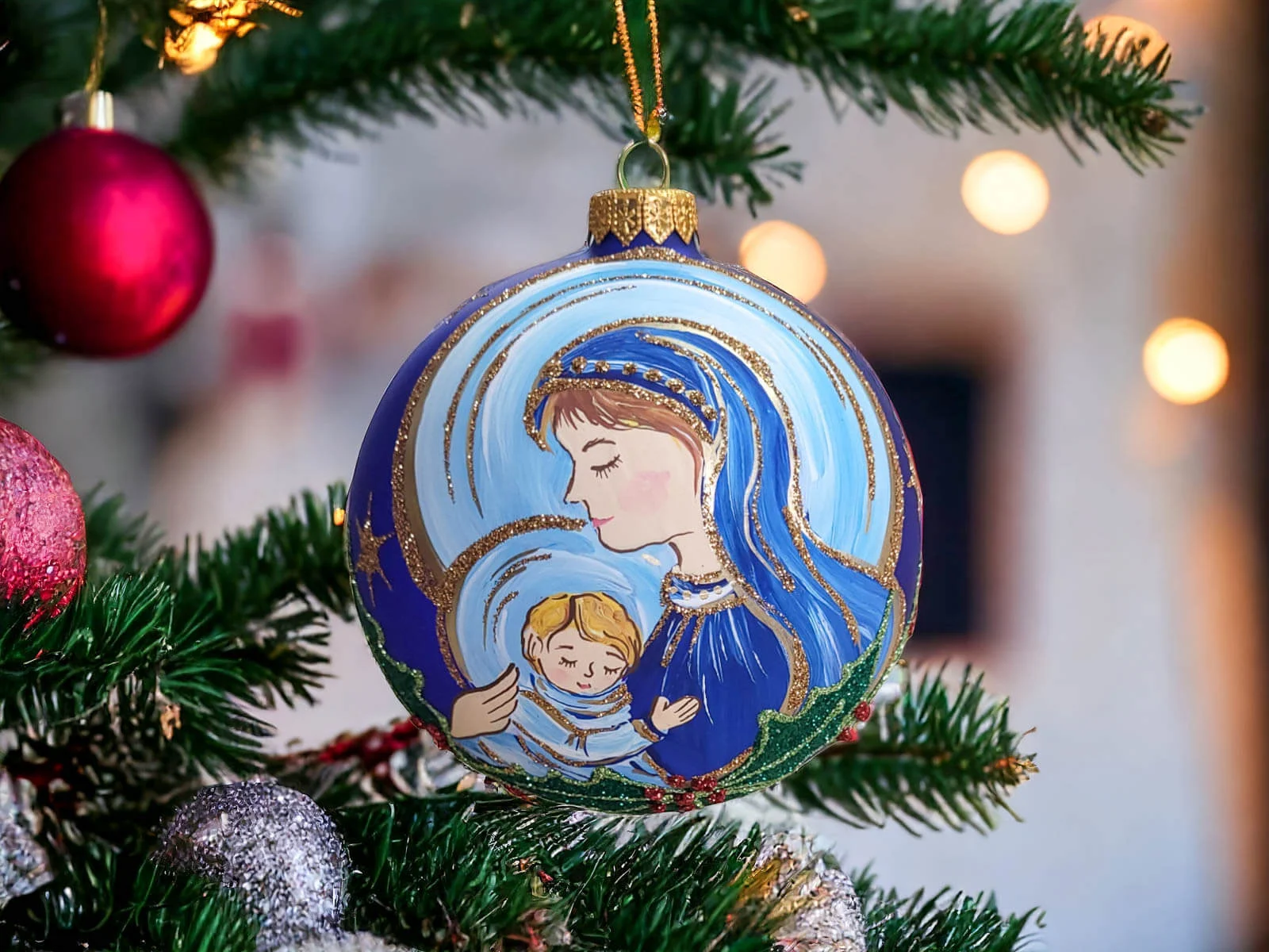 Szklana bombka, która staje się nie tylko ozdobą choinki, ale również pięknym symbolem Świąt Bożego Narodzenia. Ta ręcznie malowana ozdoba wznosi się ponad zwykłe dekoracje, przedstawiając scenę Św. Maryi i malutkiego Jezuska.