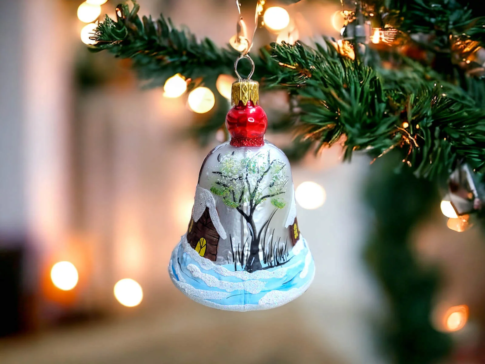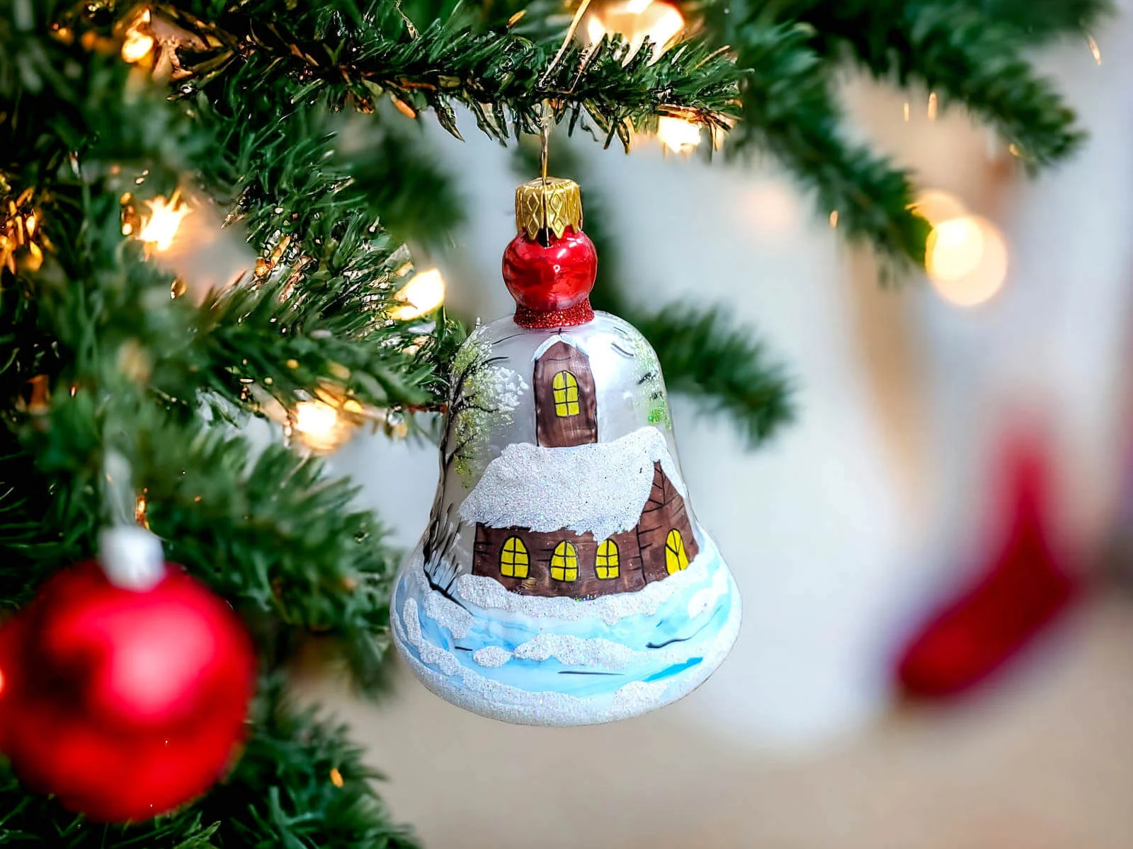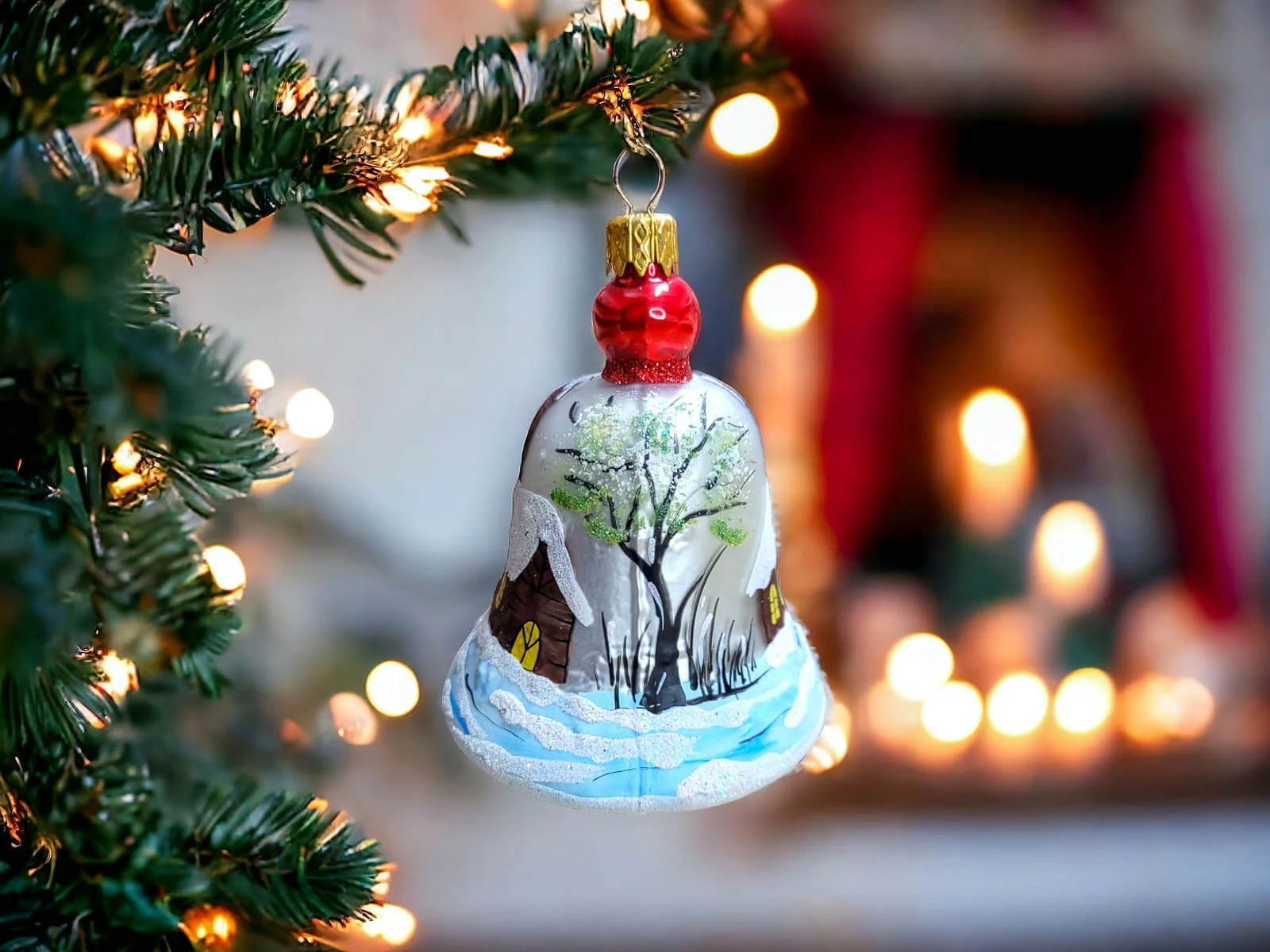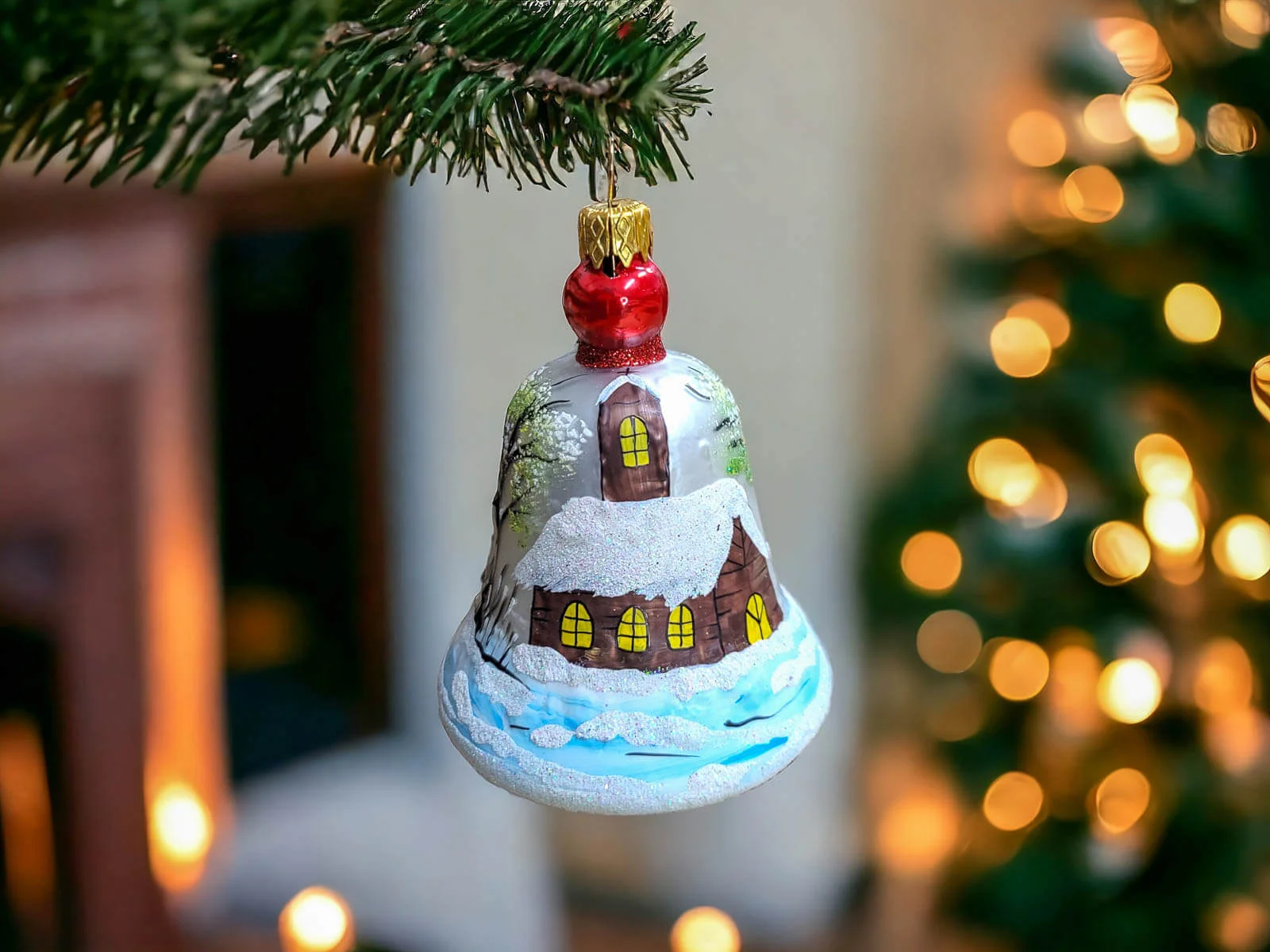 Szklana bombka choinkowa kształtka Dzwonek z Kościółkiem. Idealna na prezent dla dzieci. Unikalna dekoracja - dzieło sztuki dla kolekcjonera.