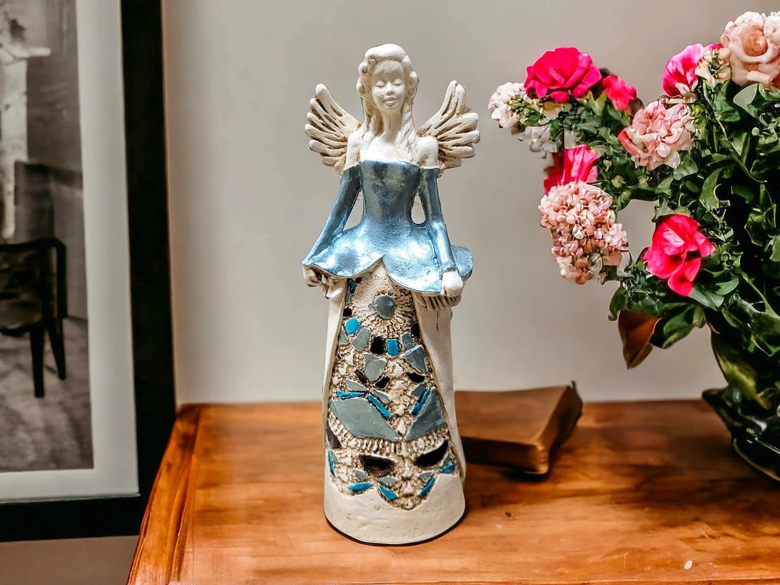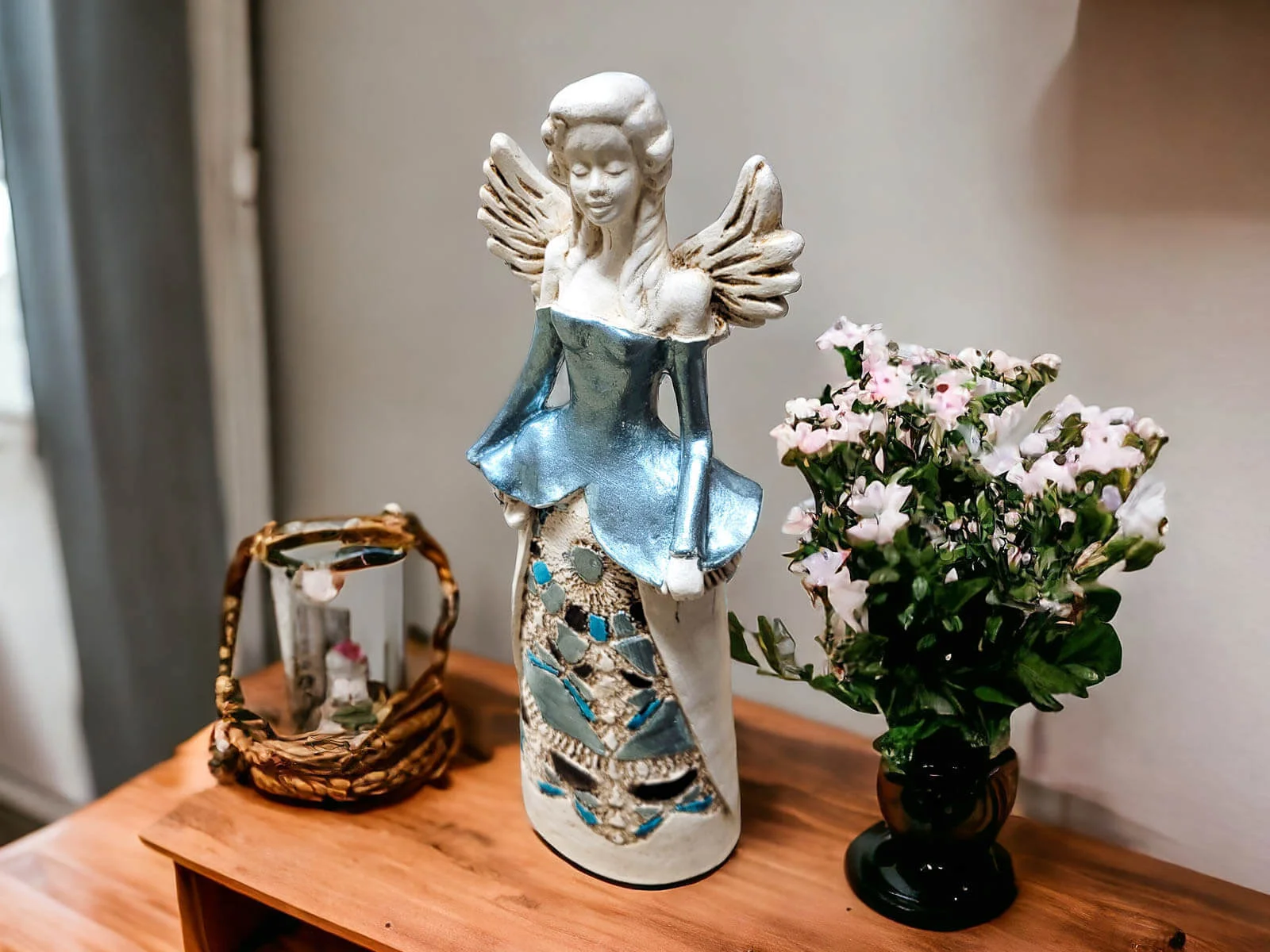 Anioł Anna w srebrnej sukni jest ręcznie wykonaną ozdobą z gipsu. Idealnie nadaje się na prezent dla kobiety - żony, mamy, babci czy przyjaciółki. Jego niespotykany wygląd przyciąga wzrok w salonie lub innym pomieszczeniu i stanowi doskonały dodatek dekoracyjny.