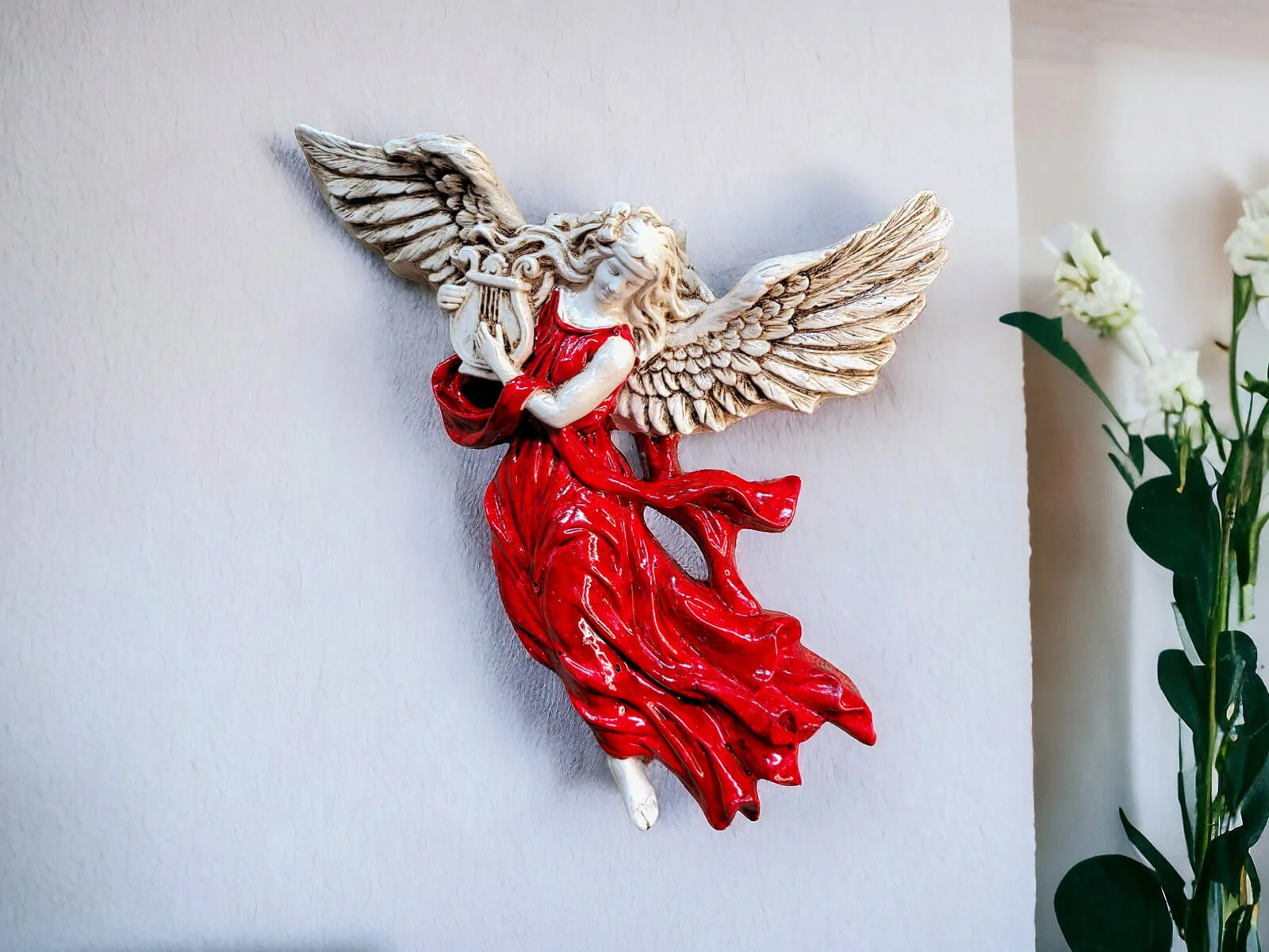Anioł z Harfą w czerwonej sukni to ręcznie robiona figurka do powieszenia na ścianie z możliwością personalizacji. Figurka to mistyczne połączenie piękna i rękodzielniczej precyzji, której delikatność i elegancja sprawią, że stanie się wyjątkową ozdobą Twojego wnętrza. To nie tylko ręcznie wykonana figurka, ale prawdziwe dzieło sztuki, które emanuje spokojem i pięknem.