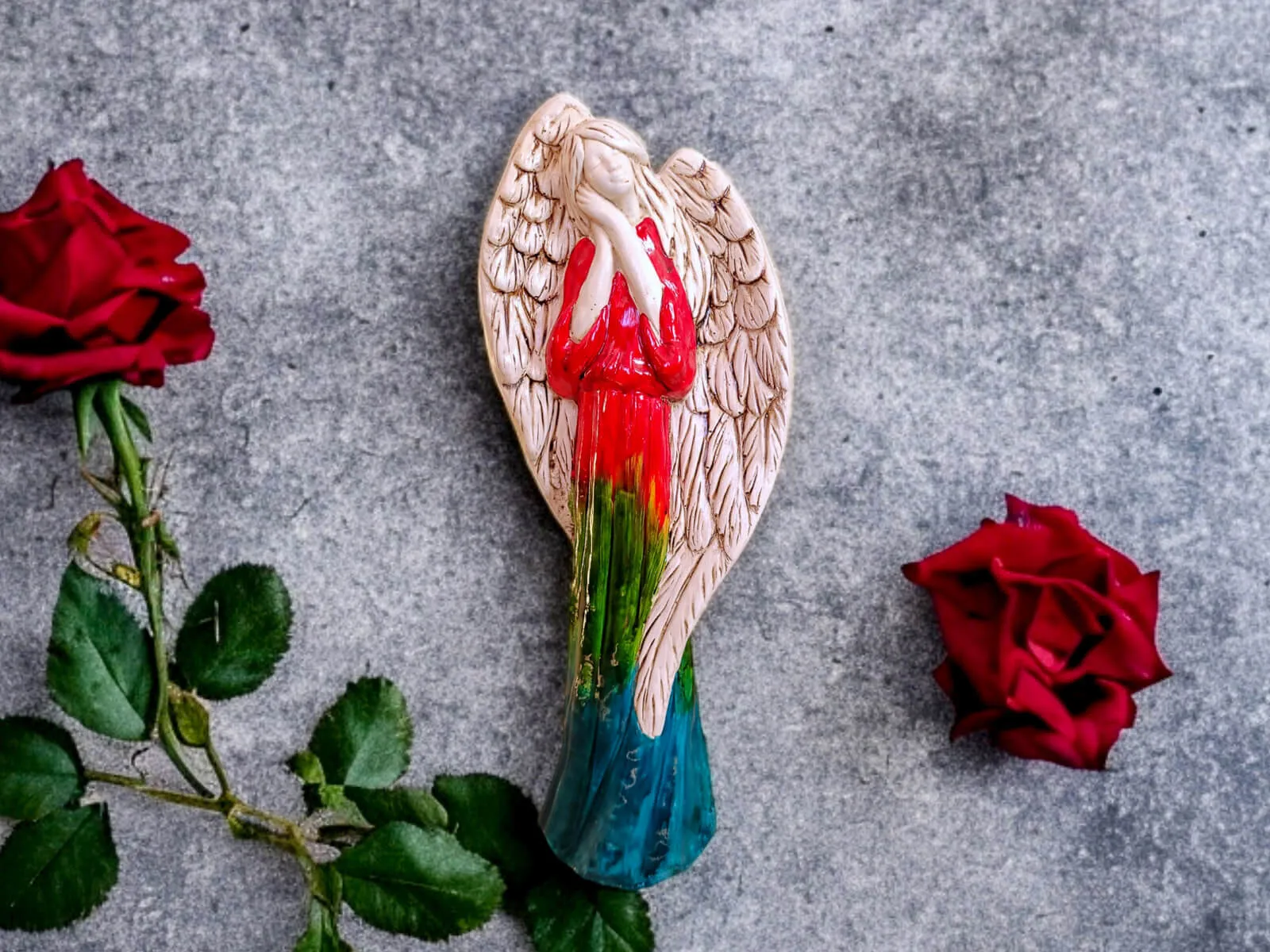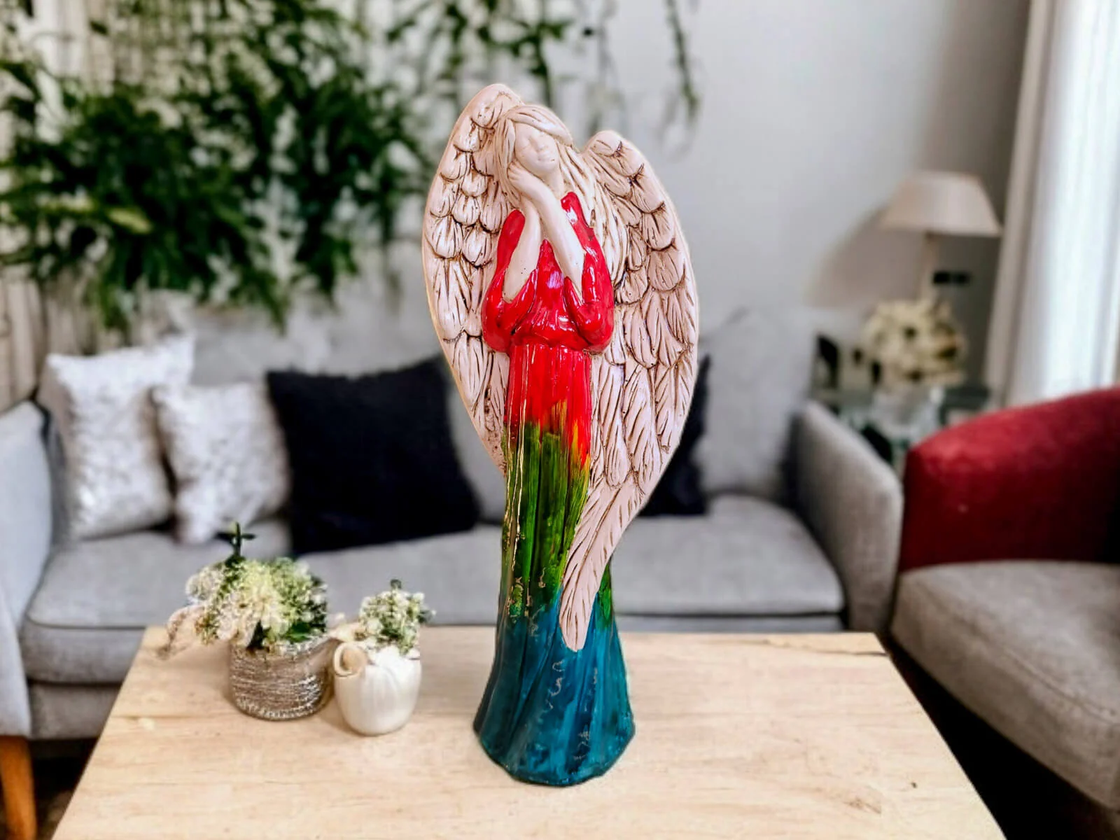 Poznaj Anioła Gabriela w wersji Art Tricolor - Wiara, Nadzieja, Miłość – wyjątkową figurkę, która zachwyca nie tylko formą, ale i głęboką symboliką. Czerwień, zieleń i turkus – to nieprzypadkowy zestaw barw. Każdy kolor niesie ze sobą ważne przesłanie: Miłość, Nadzieję i Wiarę. To idealny prezent na wyjątkowe okazje – duchowe i osobiste.