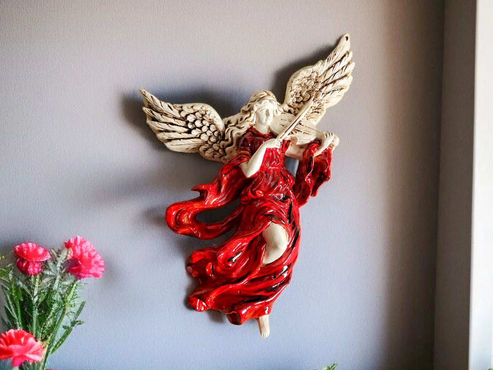 Anioł ze Skrzypcami to unikatowa, ręcznie robiona figurka do powieszenia na ścianie dzięki której wnętrze Twojego domu nabierze niepowtarzalnego uroku. Każdy element figurki emanuje starannością, tradycją i artystycznym kunsztem.