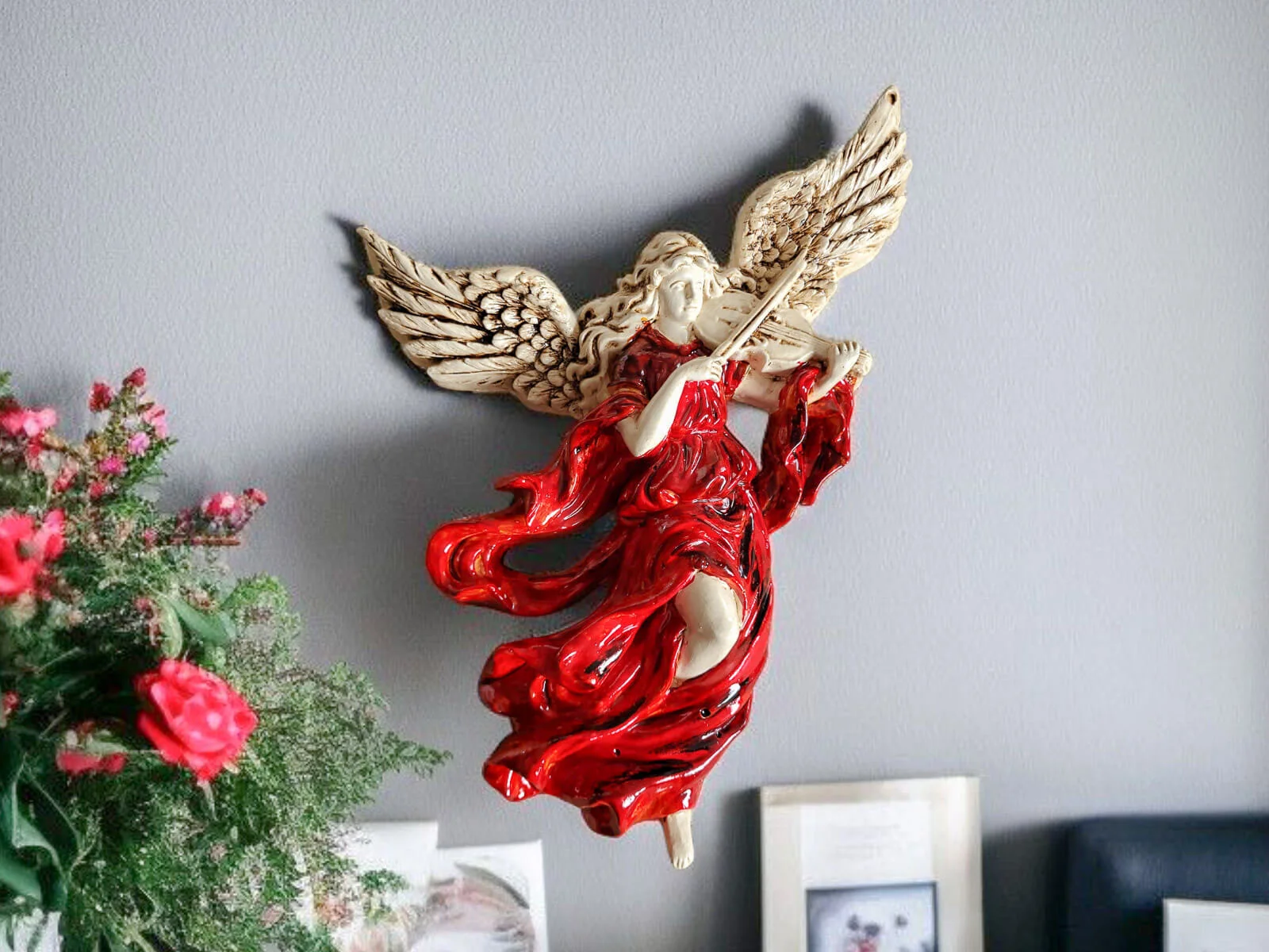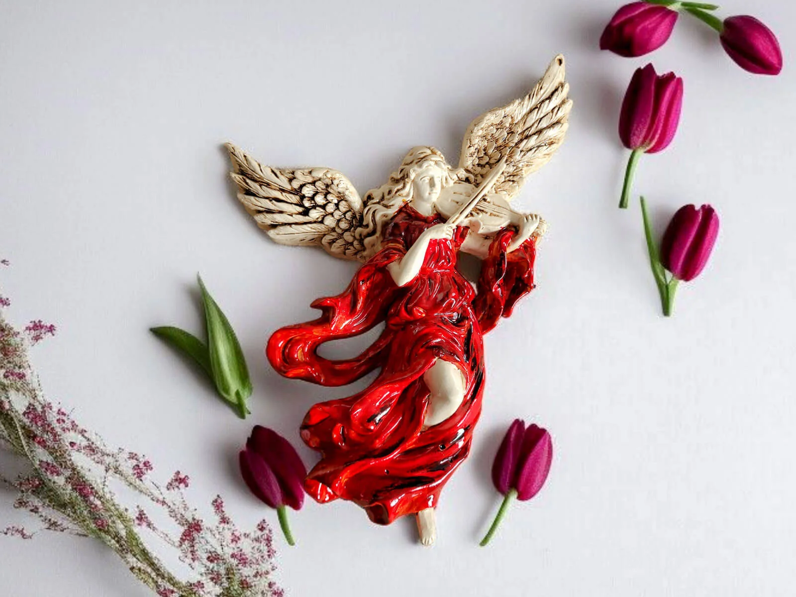 Anioł ten jest niezwykłym połączeniem delikatności i wyrafinowania. Jego rozwinięte skrzydła oraz postawa przywołują nutę niebiańskiego piękna. Każdy detal jest ręcznie formowany i starannie malowany, co nadaje postaci niepowtarzalny charakter.