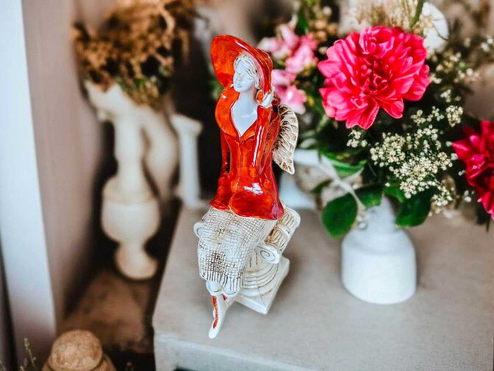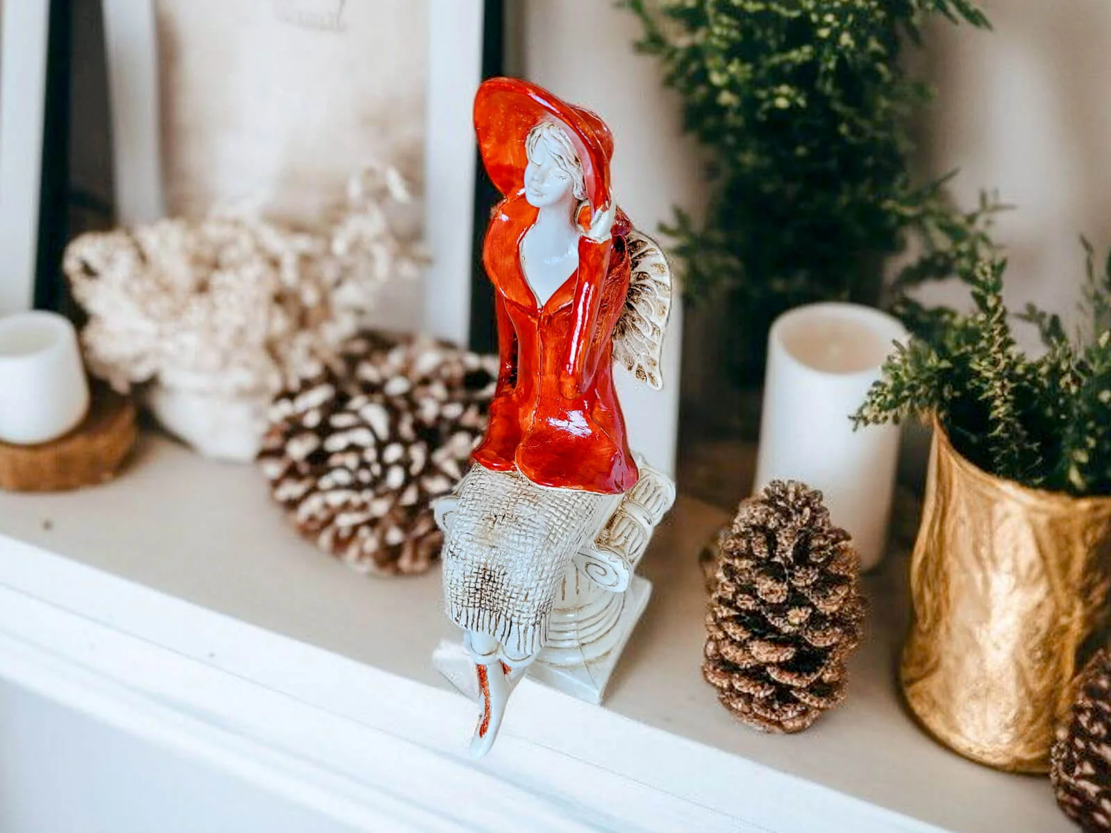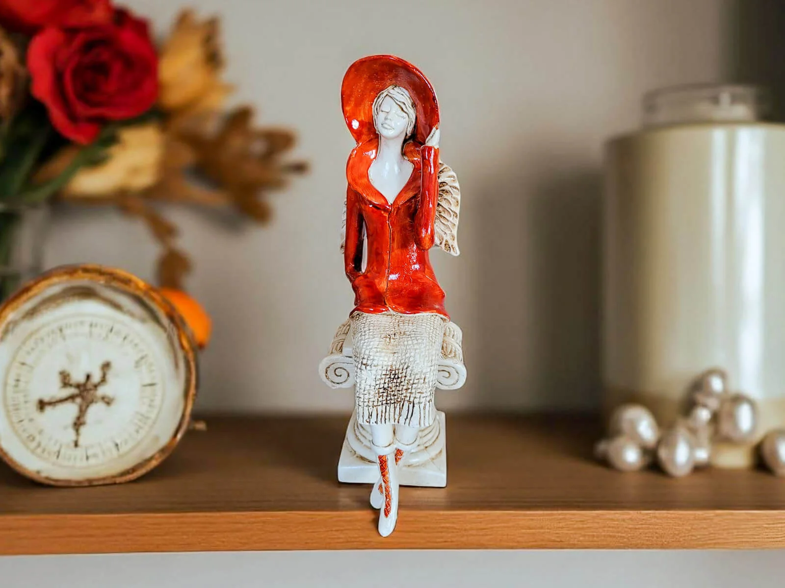 Aniołek Megan to urocza figurka przedstawiająca siedzącą kobietę, której elegancki strój i delikatne detale zachwycają precyzją wykonania. Megan ubrana jest w pomarańczowy żakiet i pasujący kapelusz, a także beżową spódnicę z motywem sweterkowym. Jej krótkie, jasne włosy oraz małe skrzydła skierowane w dół dodają jej subtelnego uroku. Lewą ręką przytrzymuje kapelusz, a prawą trzyma w pasie, co nadaje figurce naturalności i gracji.