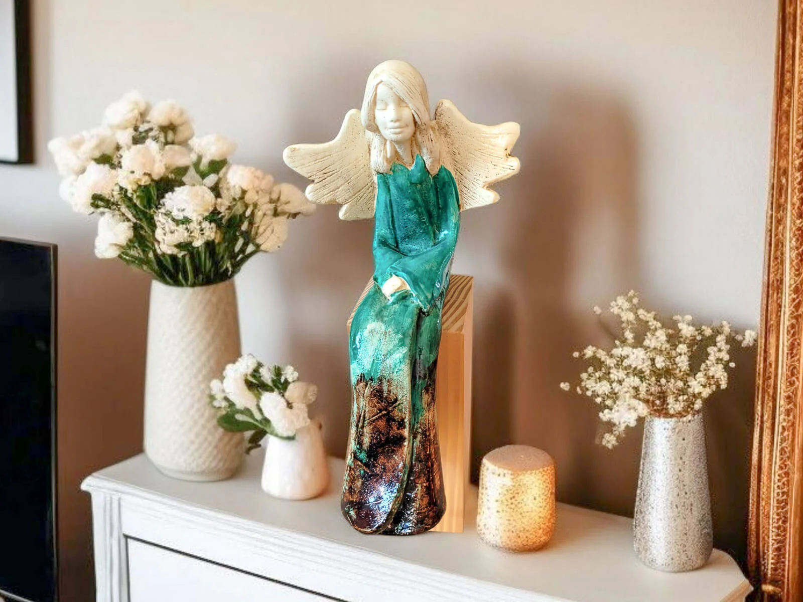 Anioł Agnes to ręcznie wykonana figurka. Agnes jest wytworną damą, która wybrała się na odpoczynek w letnie popołudnie. Siedzi na pieńku w parku i wsłuchuje się w odgłosy ptaków. Zachwyca się urokami ciepłego krajobrazu. Jest ubrana w długi turkusowo brązowy płaszcz z wzorami liści. Ma piękne rozłożyste skrzydła. Nada blasku i energii w twoim wnętrzu. Idealnie nadaje się na prezent dla kobiet. Może być nie lada gratką dla kolekcjonerów aniołków.
