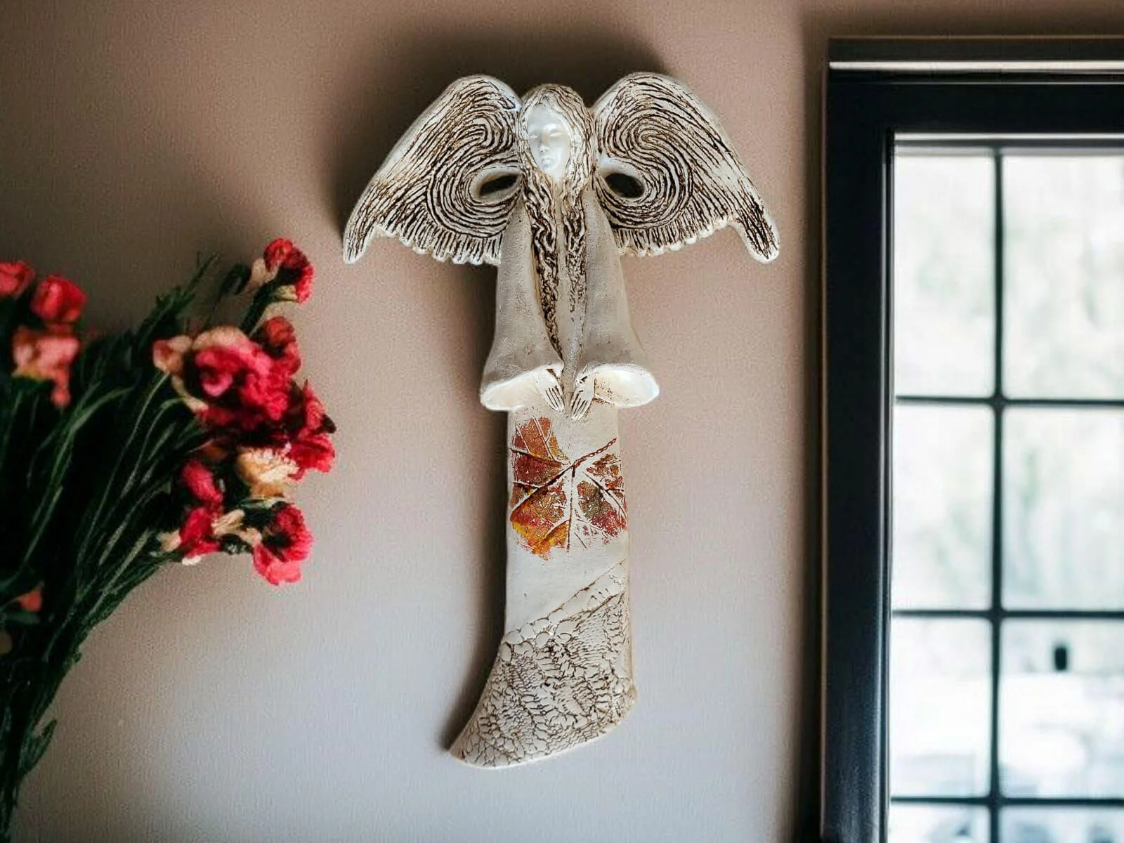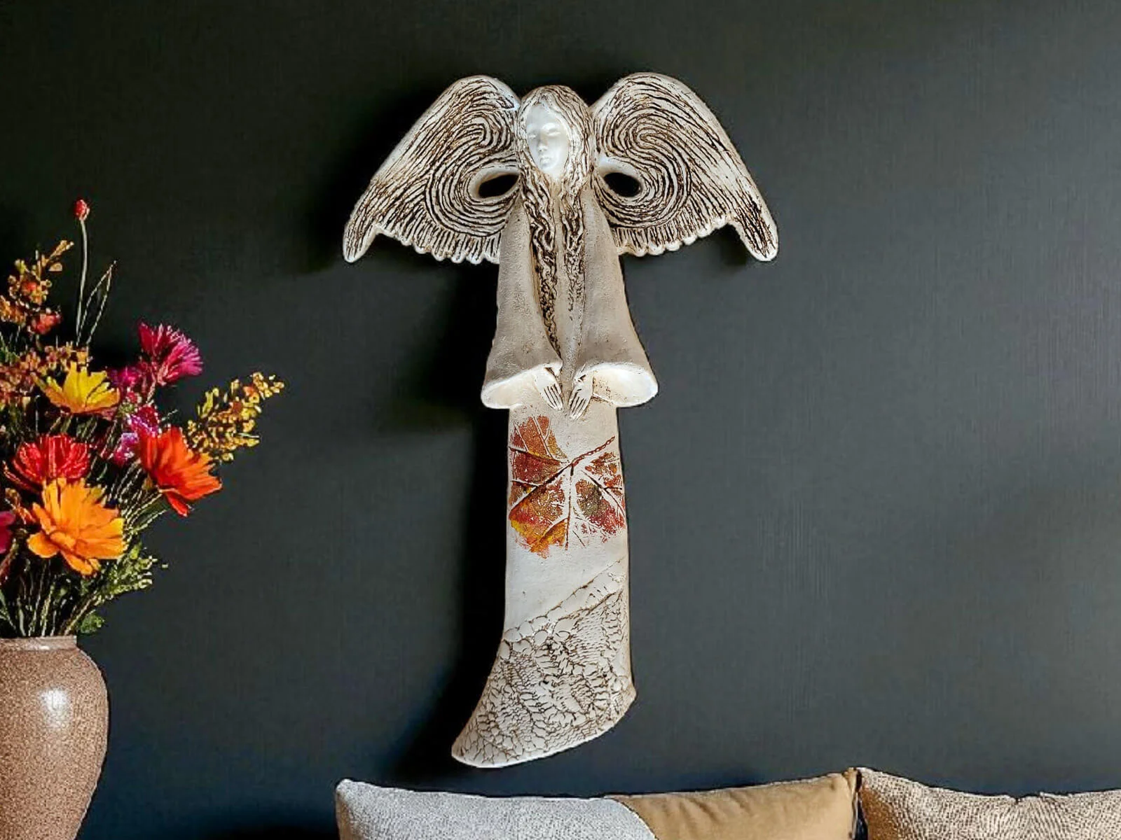 Anioł Clara w limitowanej kolekcji Art z liśćmi to gipsowa dekoracja wykonana ręcznie. Jest nim kobieta w długiej, beżowej sukni. Ma długie, kręcone włosy oraz duże, rozłożone skrzydła z ciekawymi wycięciami na środku. Ręce są skierowane na przód sylwetki, a głowa pochylona w dół. Anioł jest figurką wiszącą, dzięki czemu można zawiesić go na ścianie w widocznym miejscu. Można go również podarować na prezent dla dziadków, rodziców lub kogoś bliskiego kto lubi piękne dekoracje.