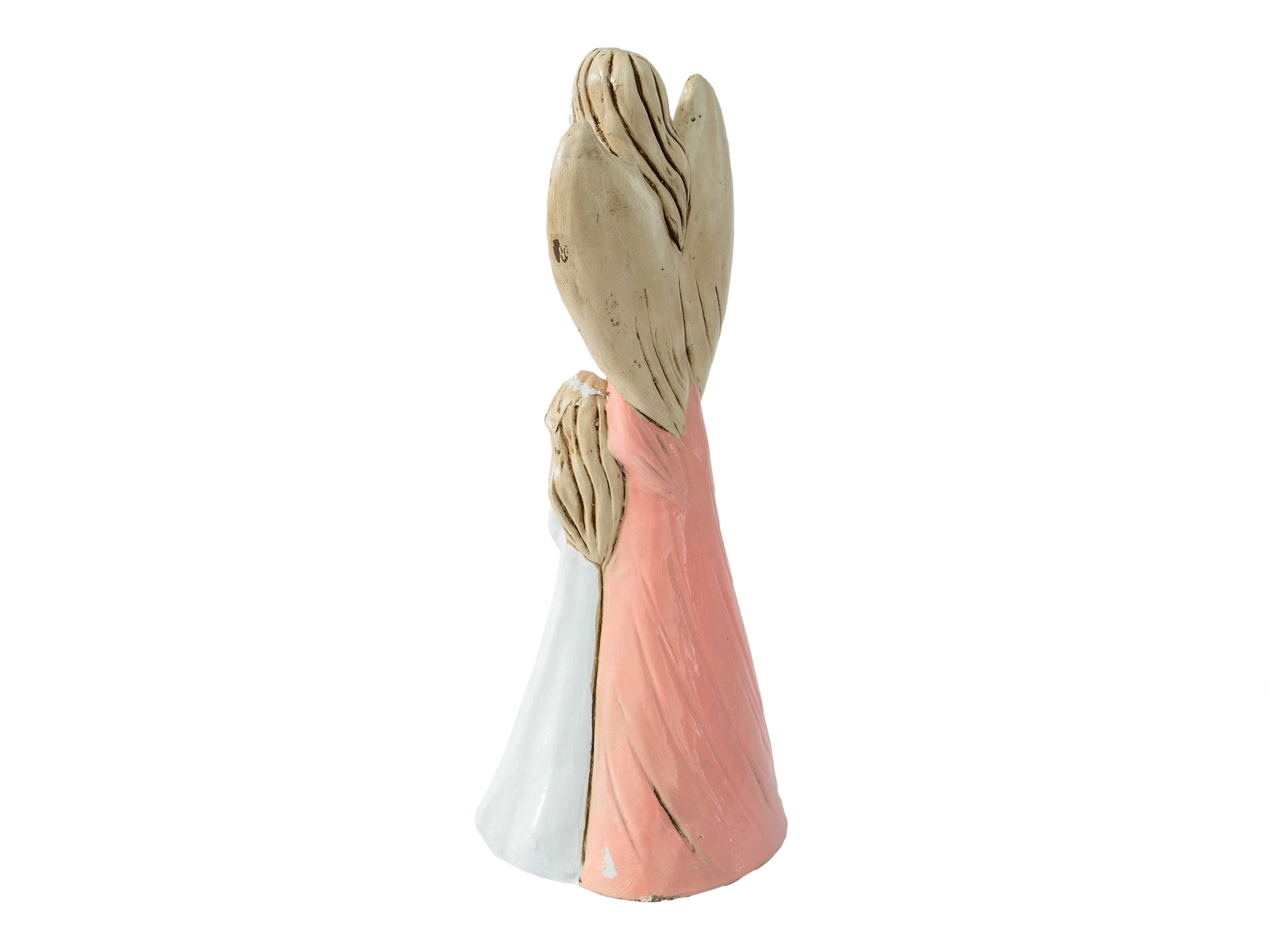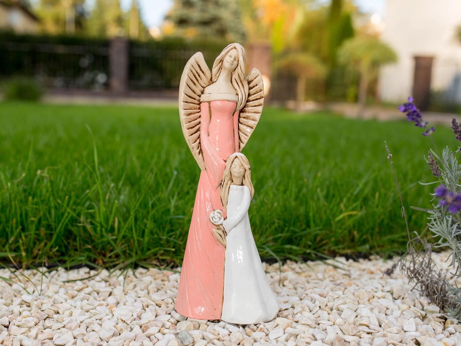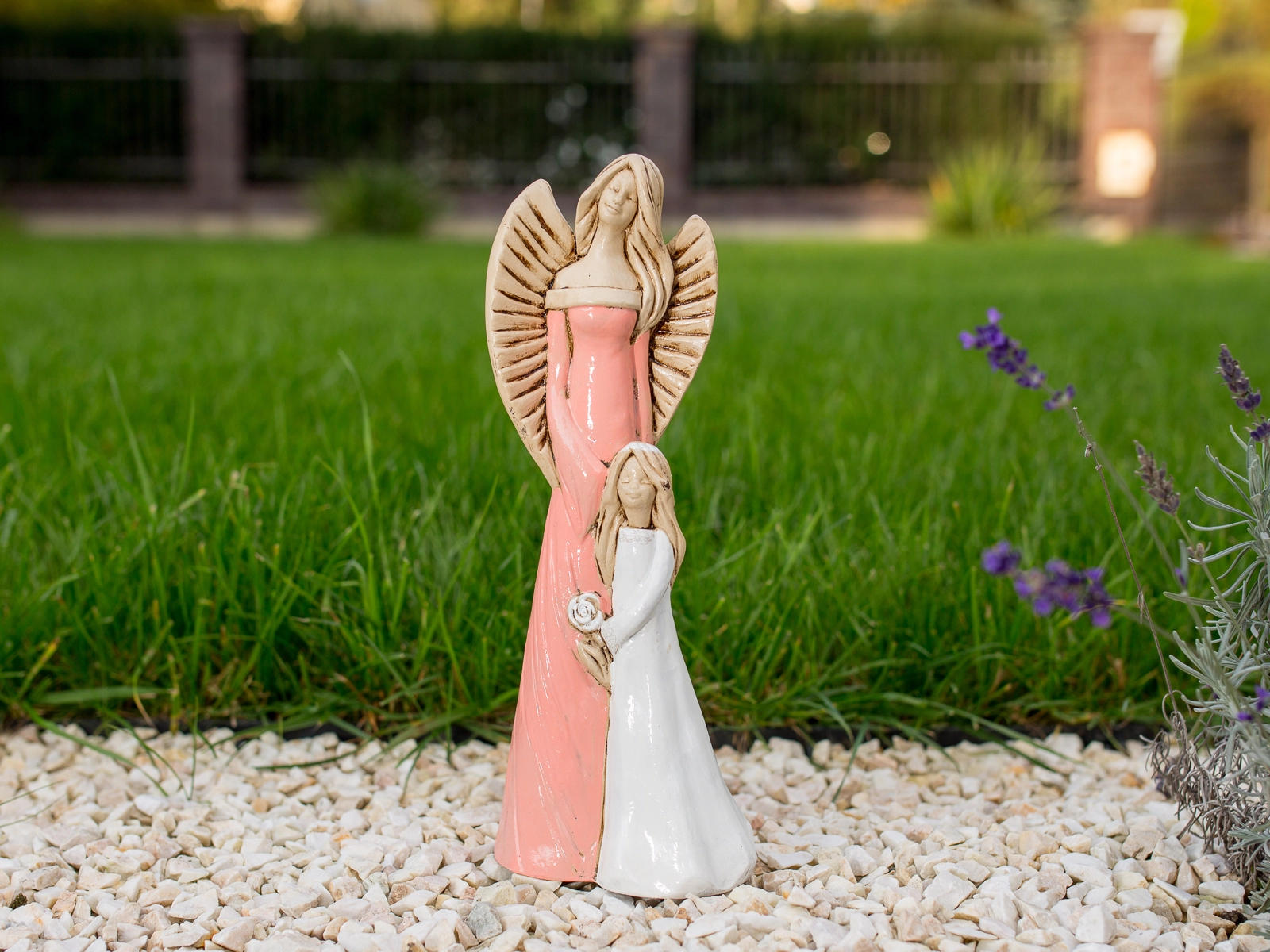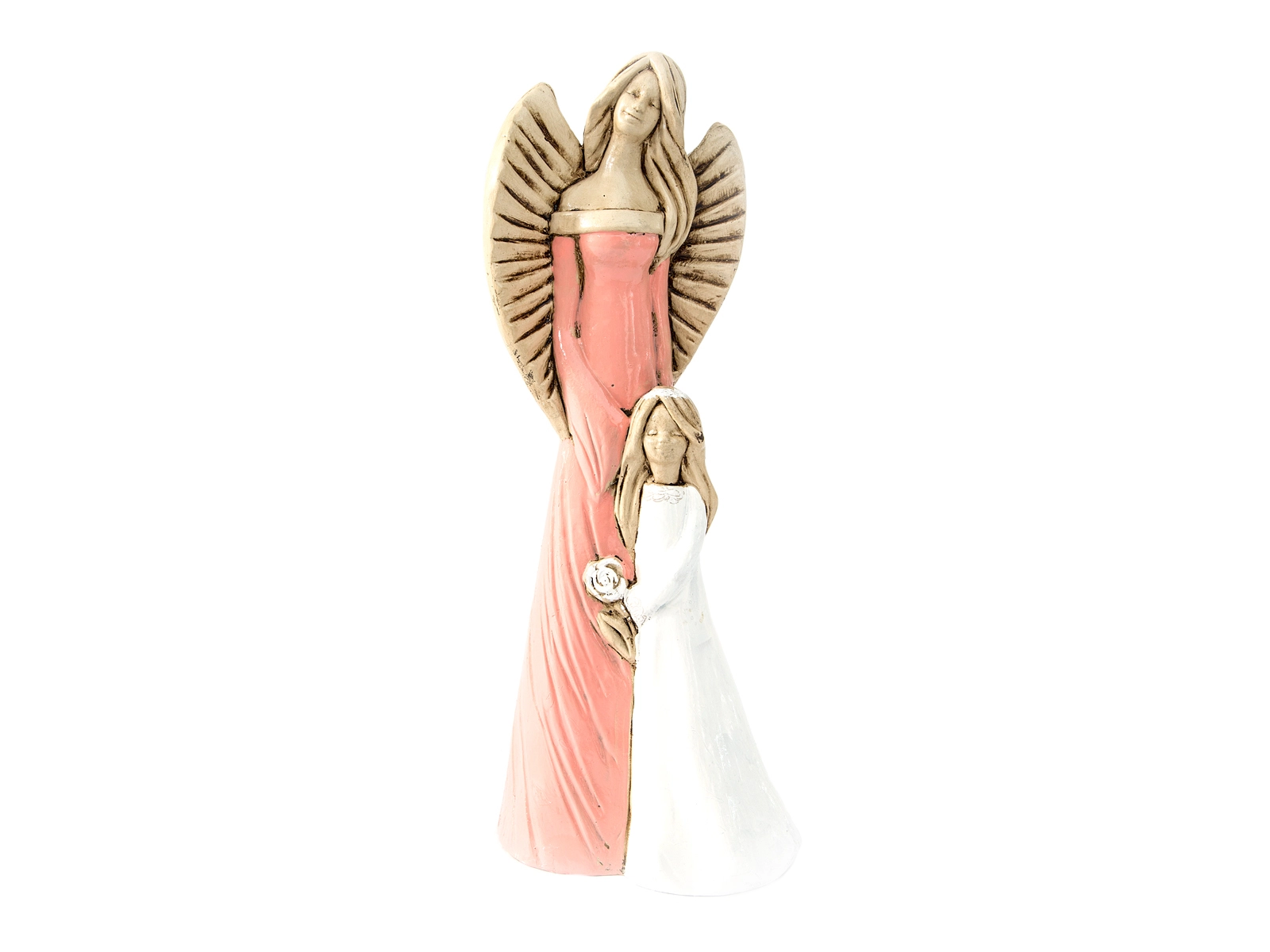 Ręcznie malowana figurka aniołów. Przedstawia piękny obraz matczynej miłości. Kobieta obejmuje swoją córeczkę w czułym geście, przez co mała czuje się bezpiecznie i spokojnie. Figura utrzymana jest w równie pięknej kolorystyce - delikatne odcienie różu i bieli działają kojąco. Hannah i Evelyn mogą stanowić piękny prezent z okazji dnia matki bądź dnia dziecka.