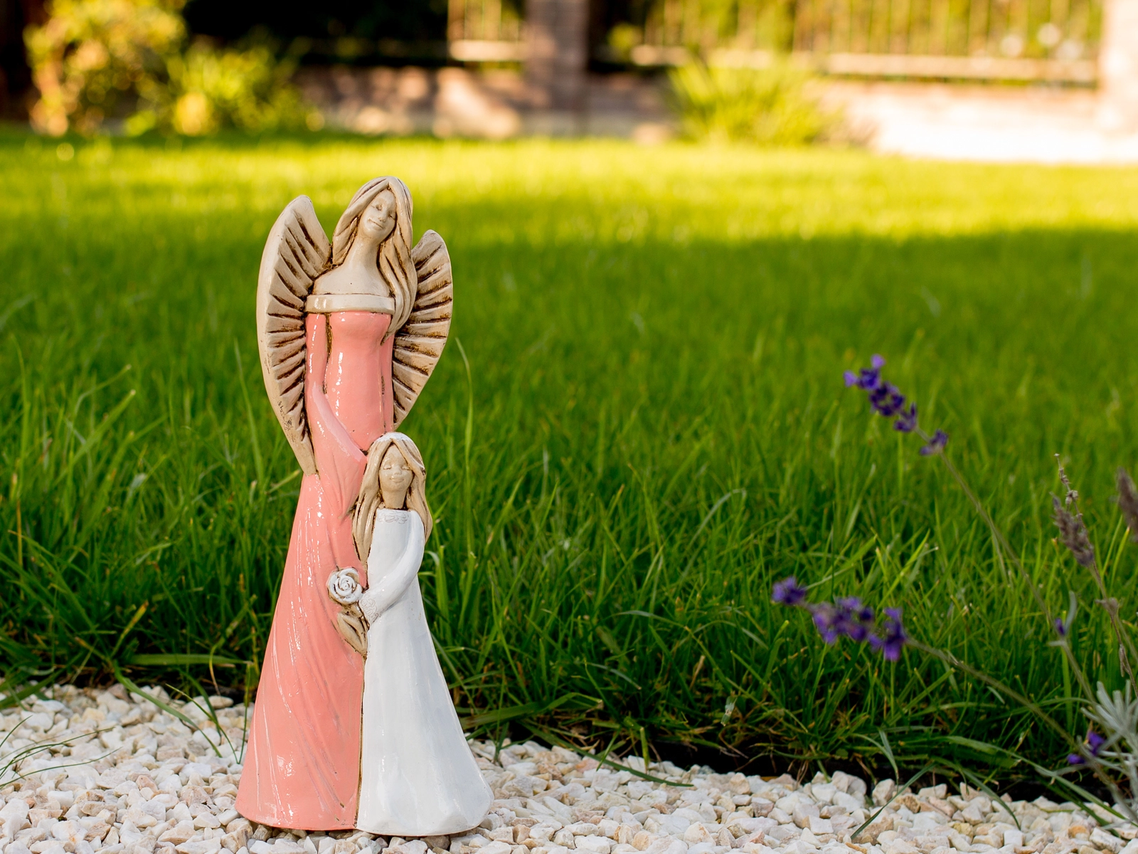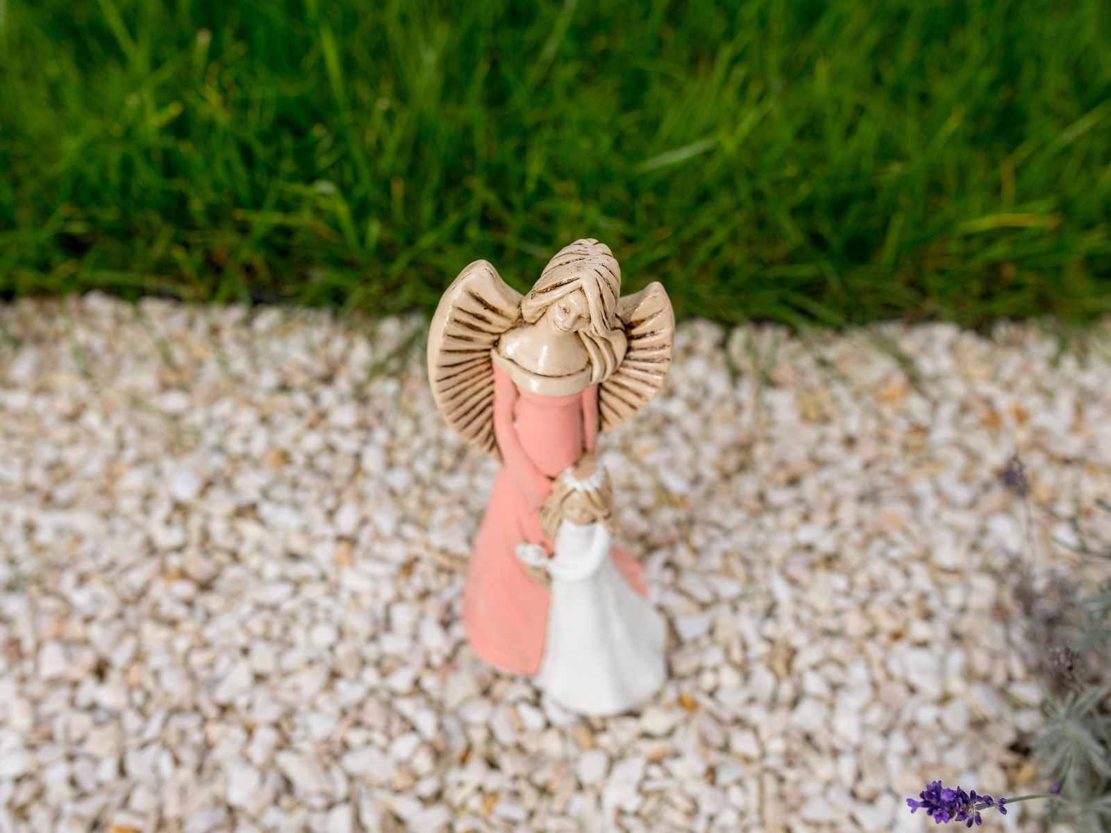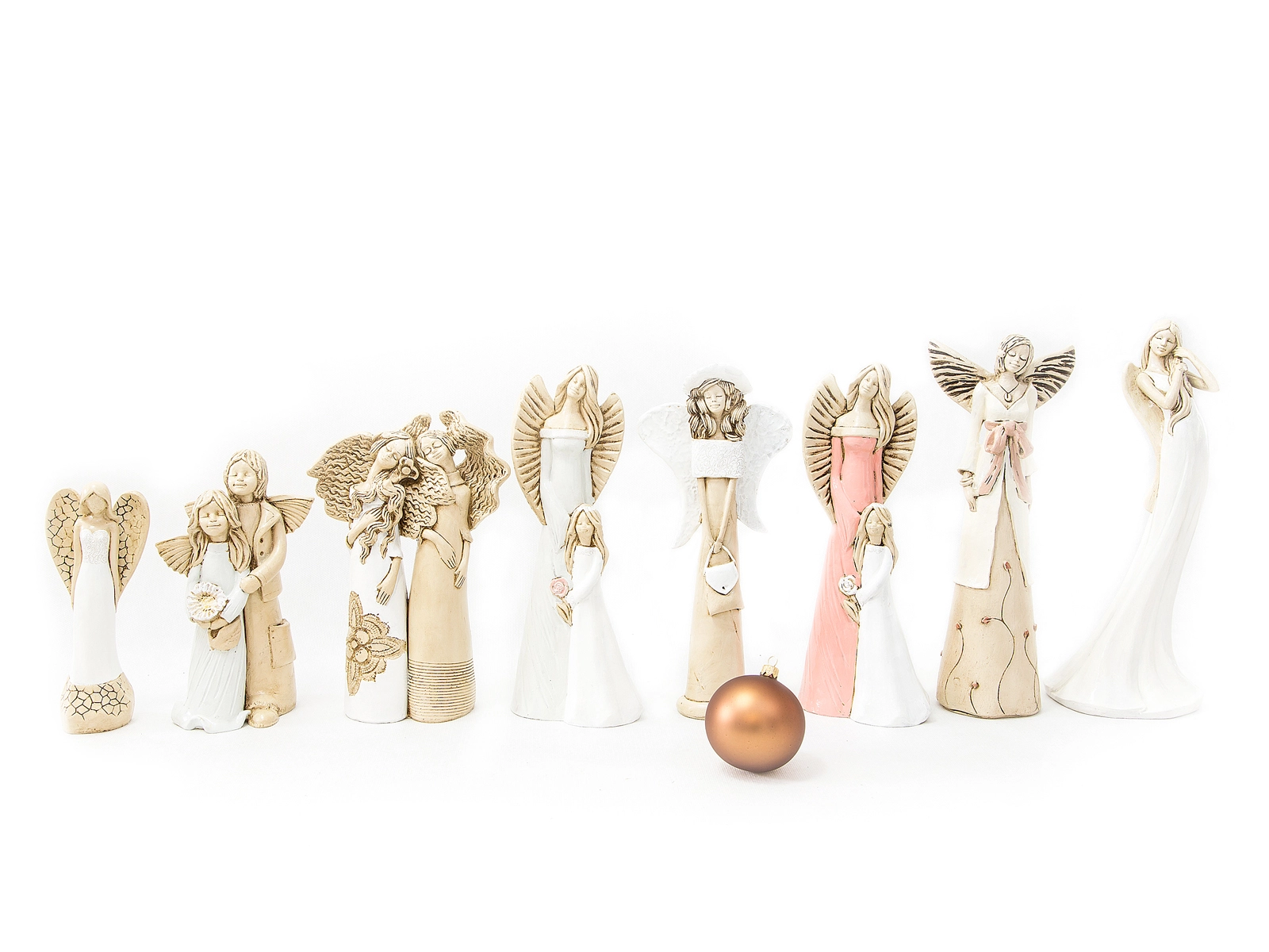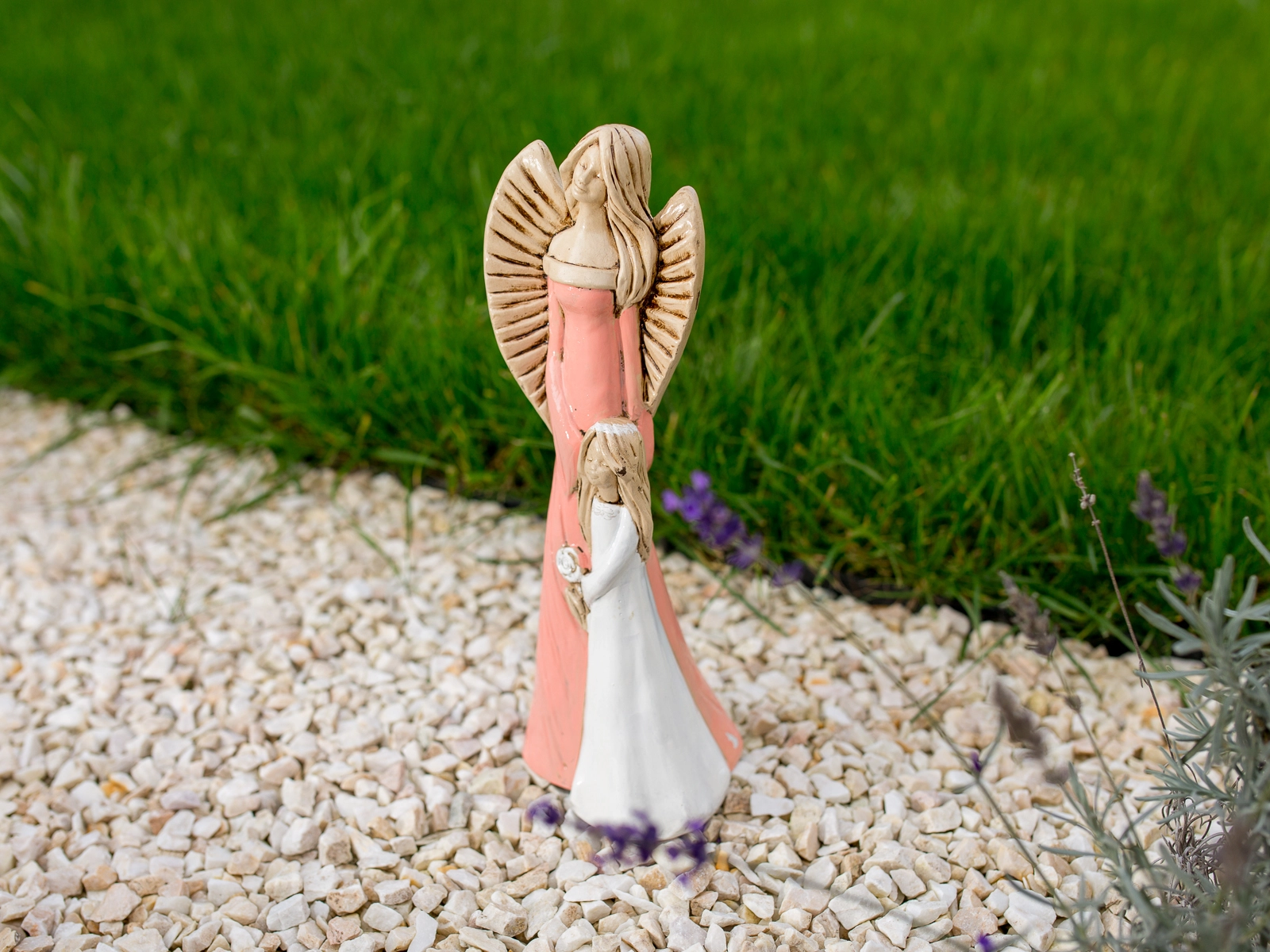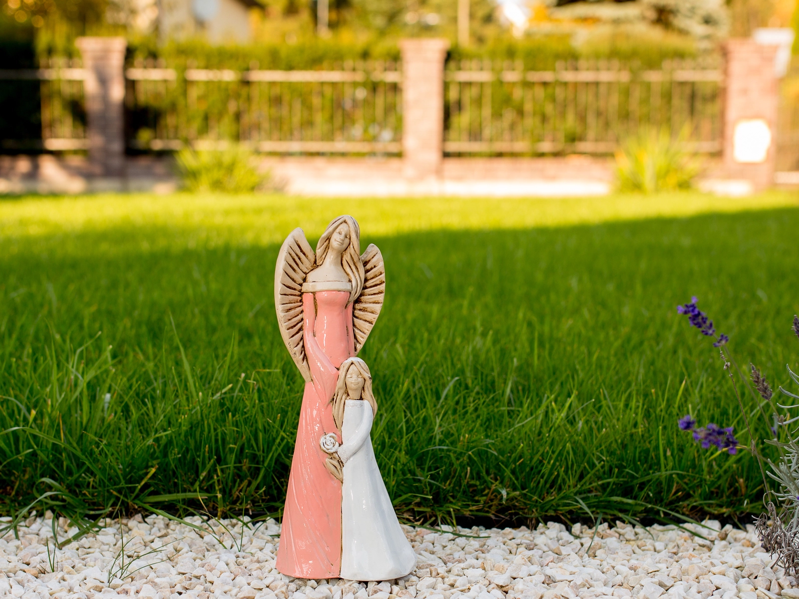 Ręcznie malowana figurka aniołów. Przedstawia piękny obraz matczynej miłości. Kobieta obejmuje swoją córeczkę w czułym geście, przez co mała czuje się bezpiecznie i spokojnie. Figura utrzymana jest w równie pięknej kolorystyce - delikatne odcienie różu i bieli działają kojąco. Hannah i Evelyn mogą stanowić piękny prezent z okazji dnia matki bądź dnia dziecka.