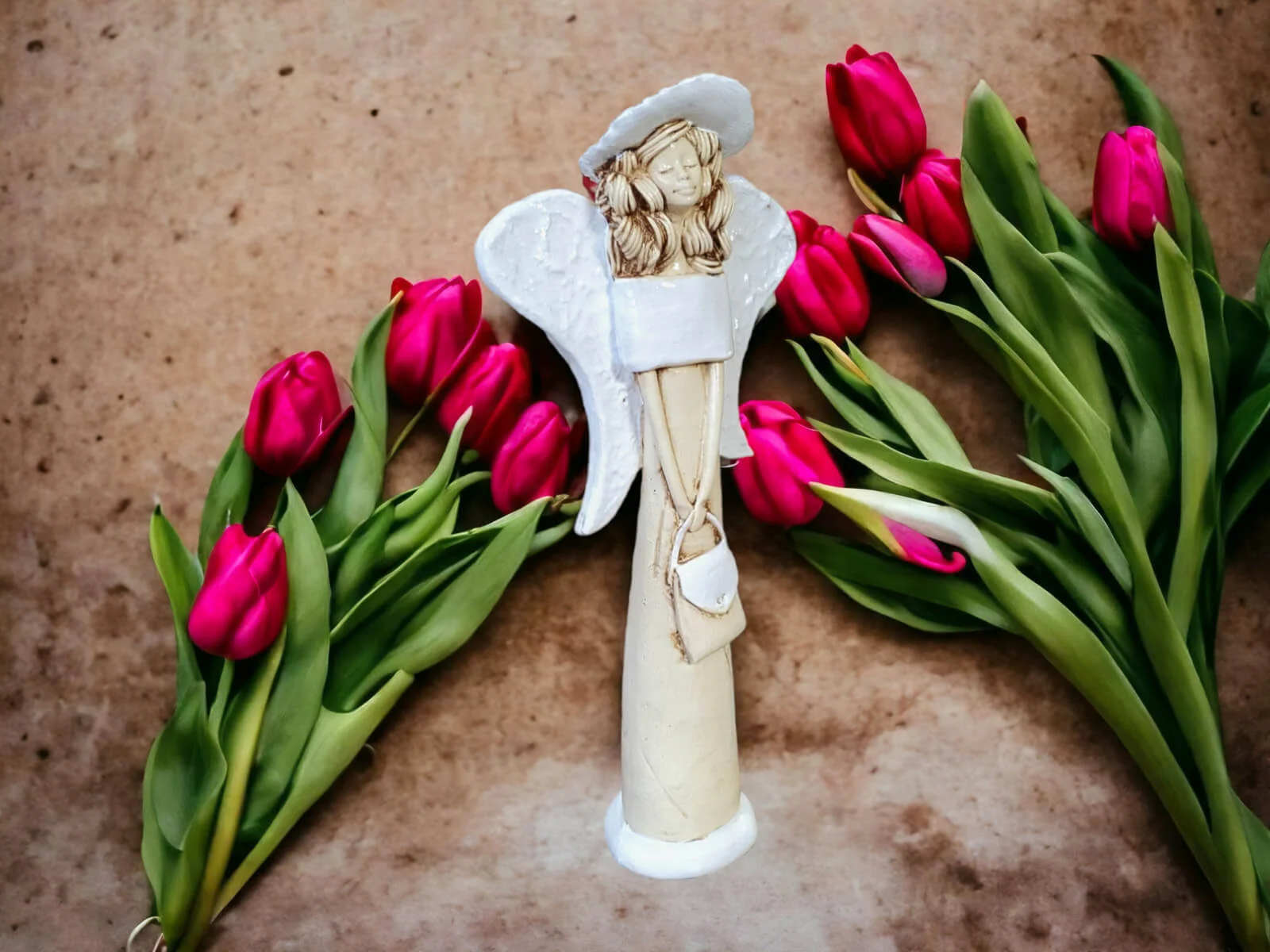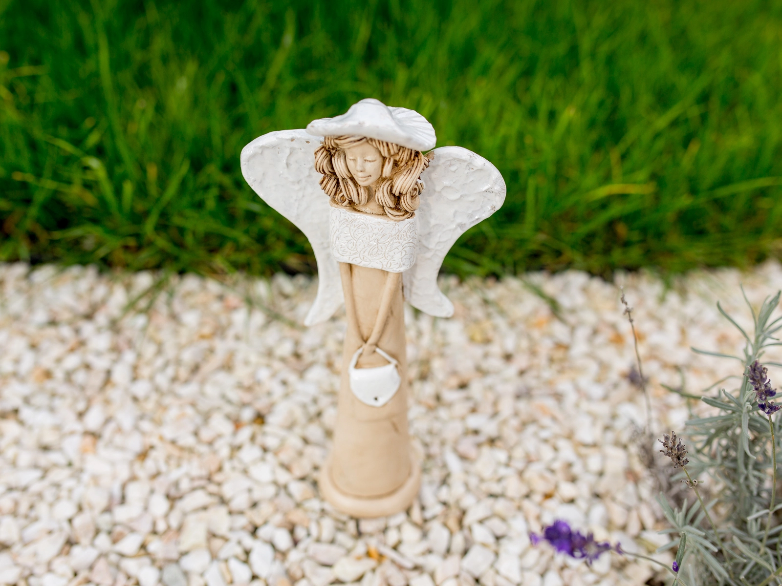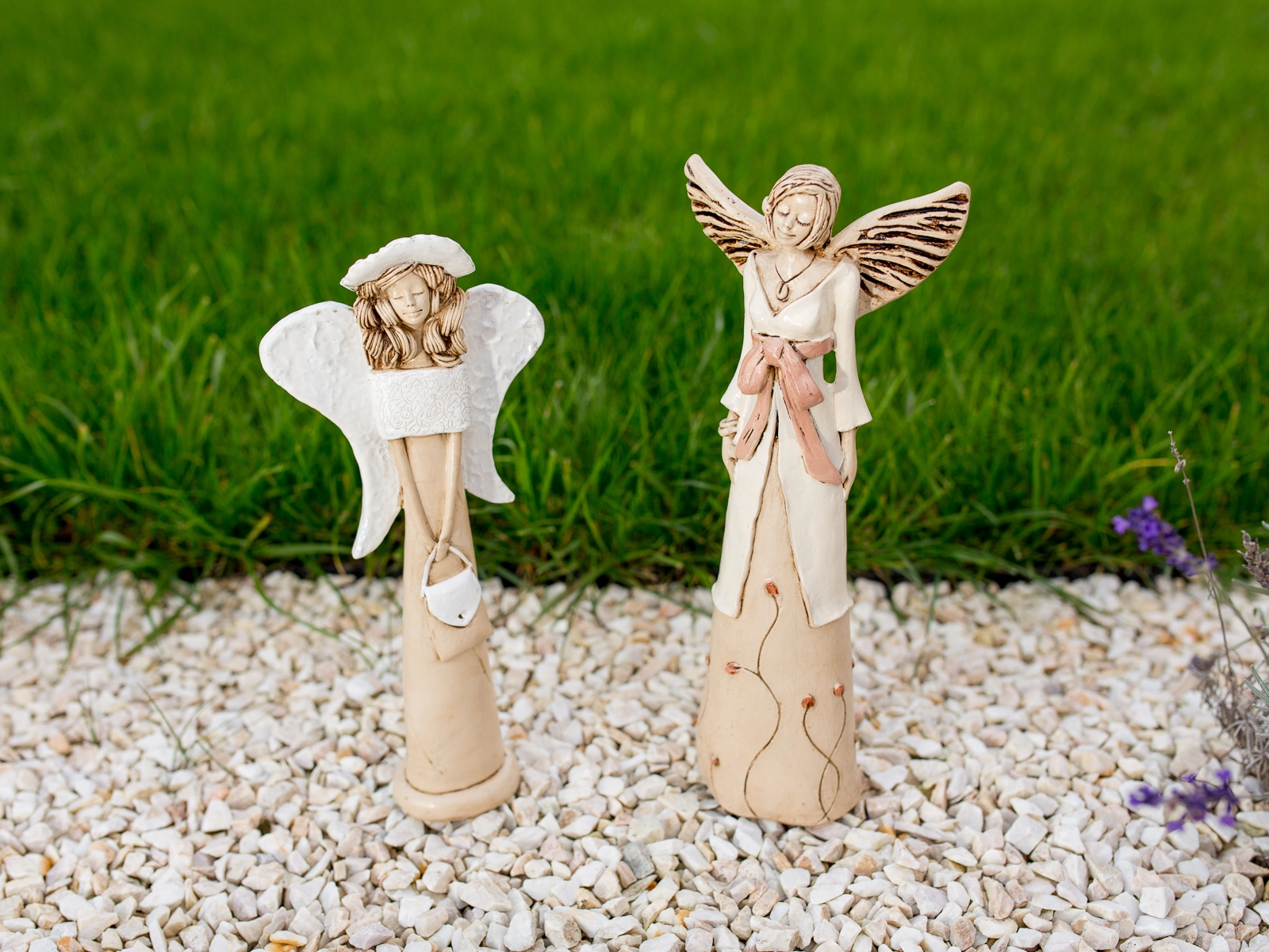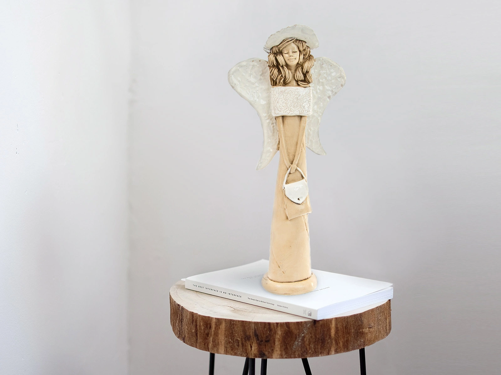 Anioł Coco to ręcznie wykonana figurka w kształcie filigranowej dziewczynki. Ma cudowne rozłożyste skrzydła.Jej beżowy ubiór podkreślają białe akcenty. Figurka Coco idealnie nadaje się na prezent dla dziewczynki jako pamiątka komunijna oraz chrzciny. Anioł może pięknie prezentować się jako ozdoba wnętrz jak i ogrodu.
