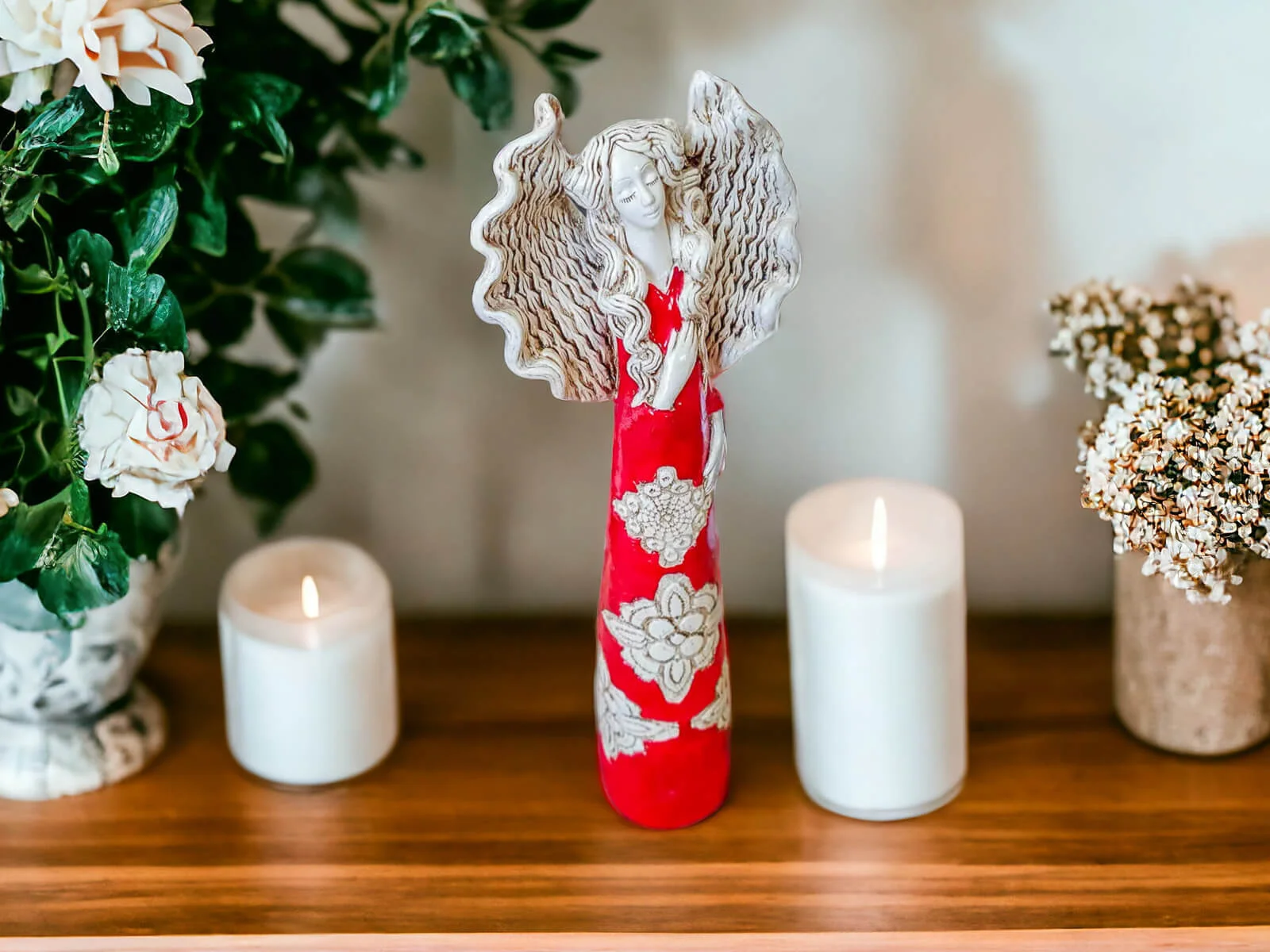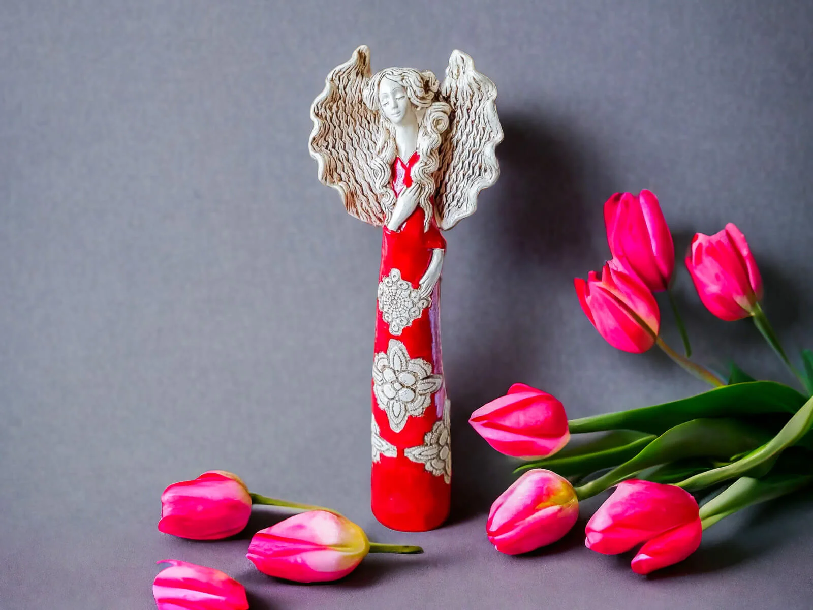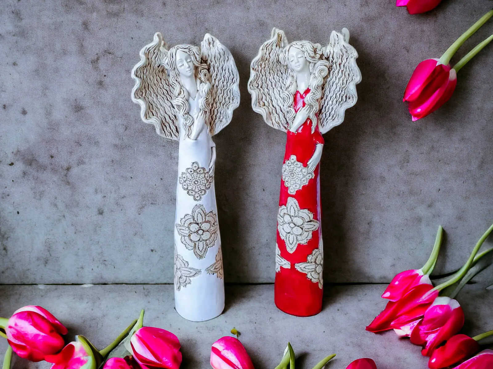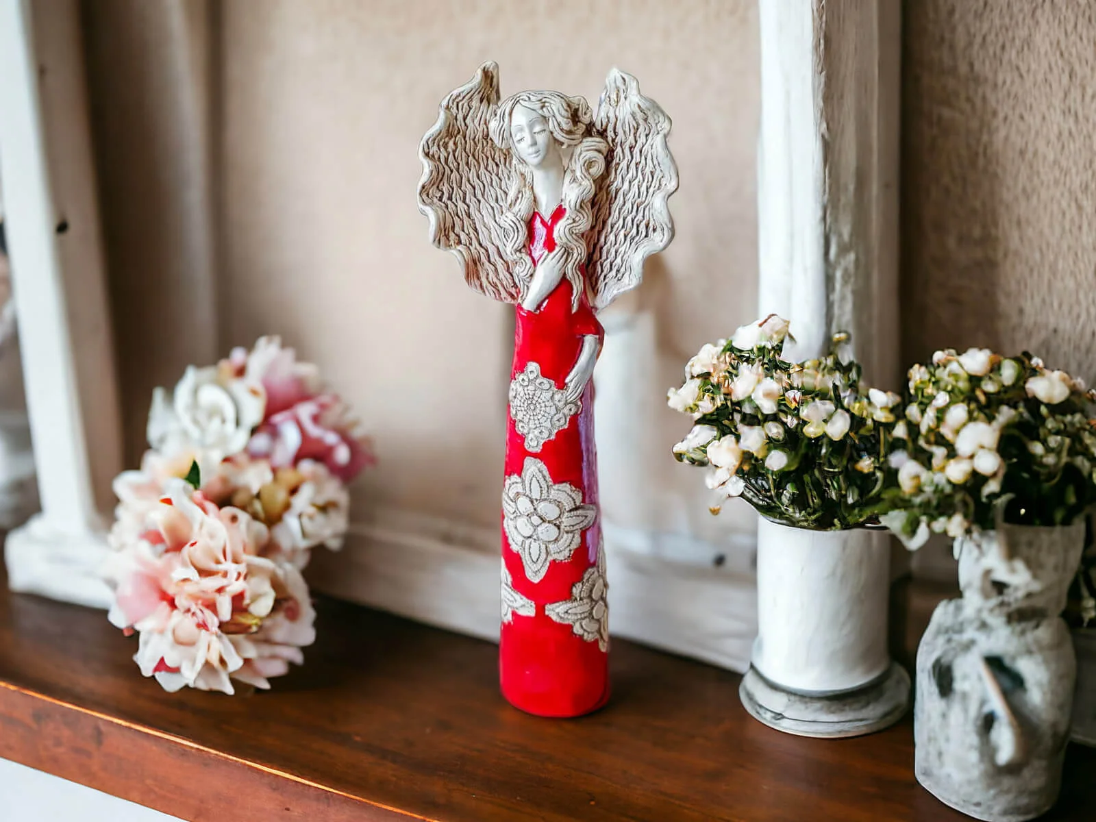 Anioł Madelyn przedstawia kobietę z długimi kręconymi włosami w czerwono-beżowej sukni. Ma duże skrzydła skierowane ku górze oraz prawą dłoń na piersi. Jest figurką stojącą, wykonaną ręcznie z gipsu. Nadaje się na ozdobę do ogrodu jak i wnętrz. Może służyć jako prezent na Dzień Kobiet, Walentynki, a także na Dzień Mamy i Babci.