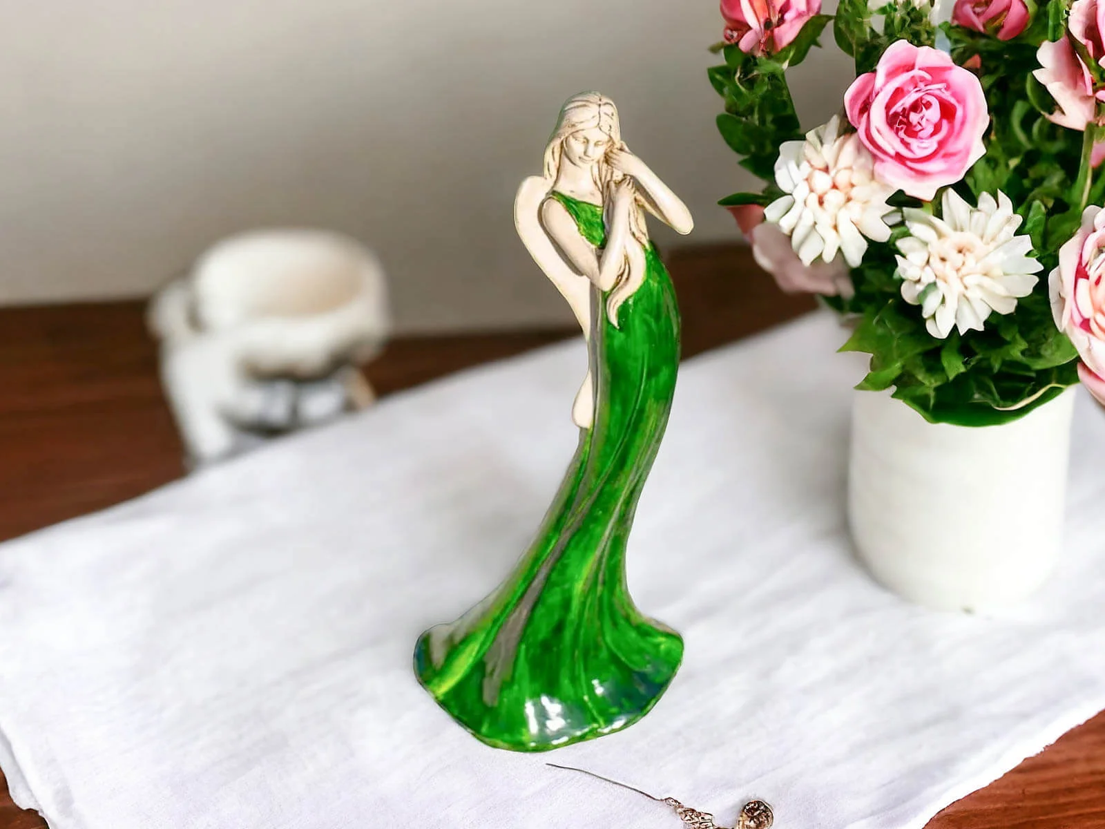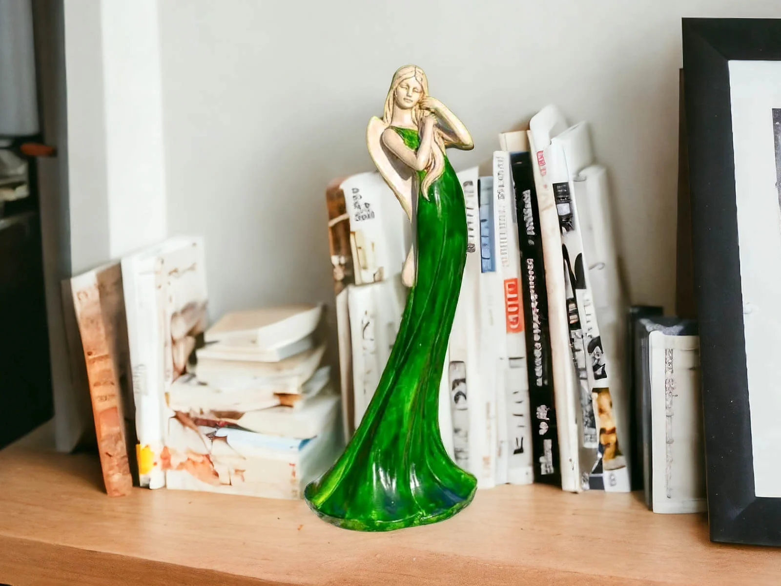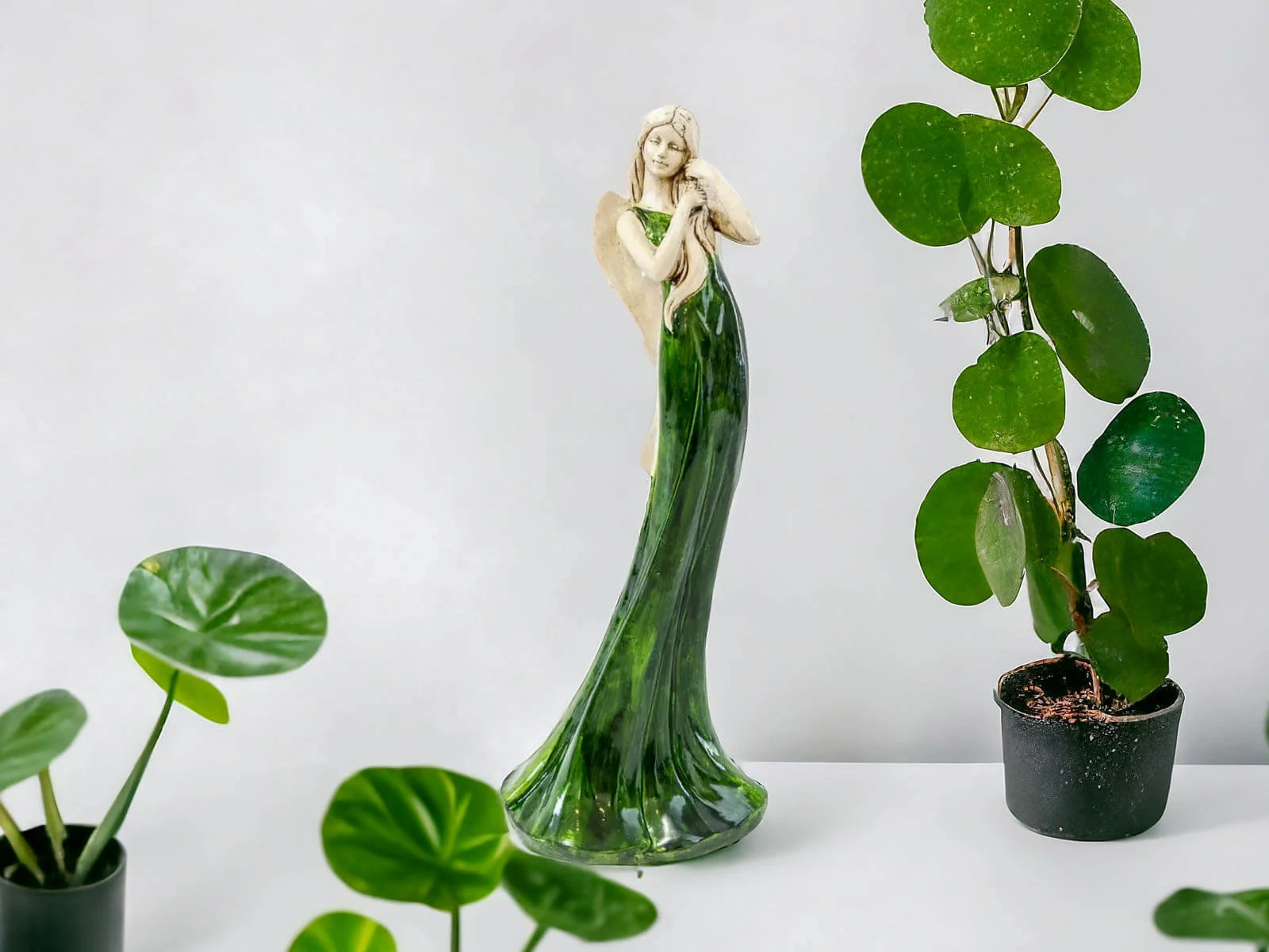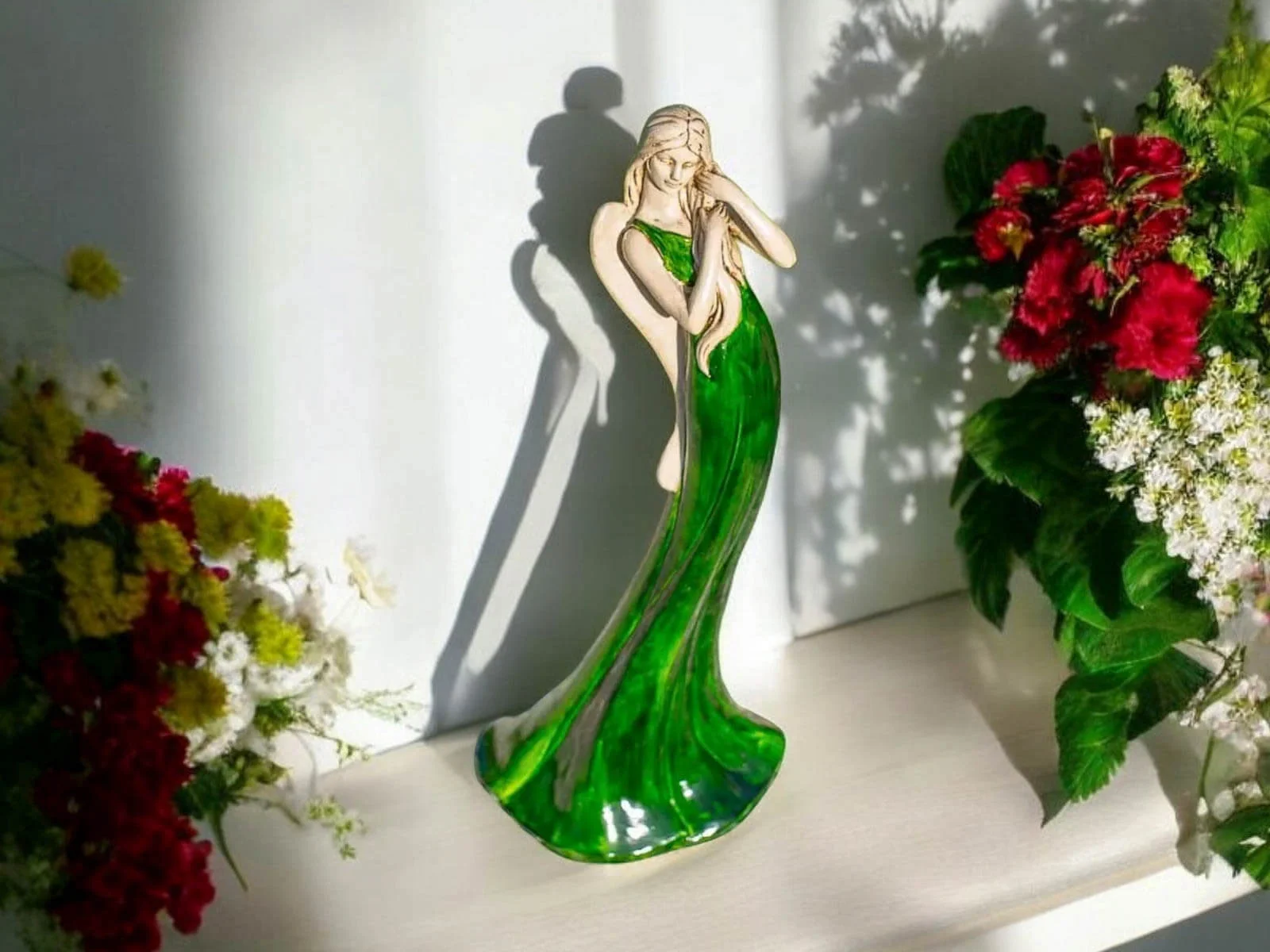 Anioł Elise to stojąca figurka wykonana z gipsu ręcznej produkcji. Przedstawia kobietę, która ubrana jest w długą, zieloną suknię. Ma piękne, jasne włosy, które układa rękoma. Z tyłu widnieją podłużne skrzydła w beżowym kolorze. Dekoracja jest dostojnego wyglądu. Można ją umieścić w salonie lub w ogrodzie, ponieważ idealnie komponowałaby się z wiosennymi kolorami natury. Nadaje się również na prezent dla osoby, która lubi oryginalny wystrój.