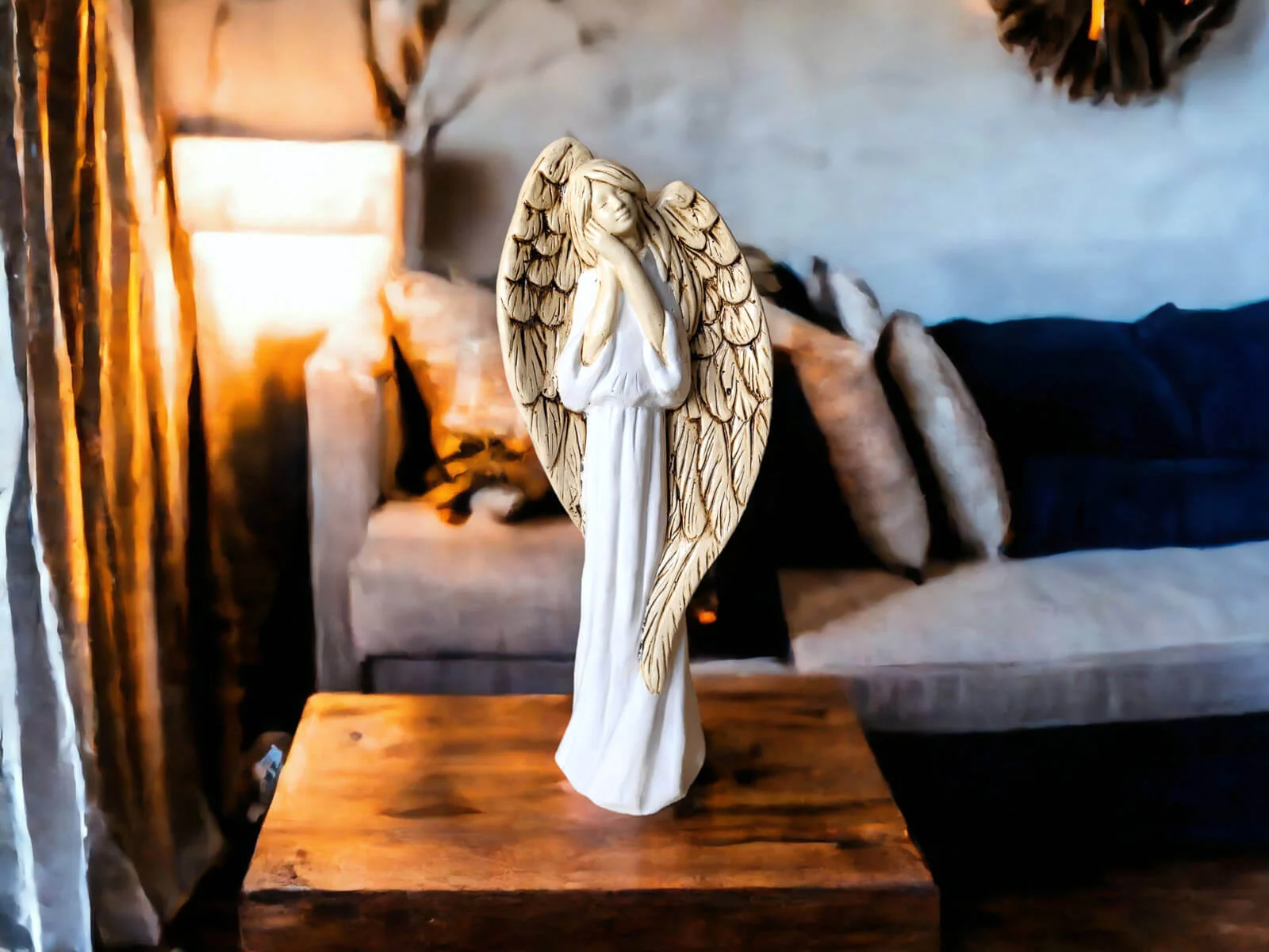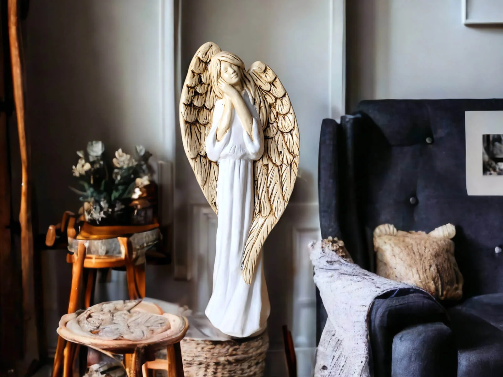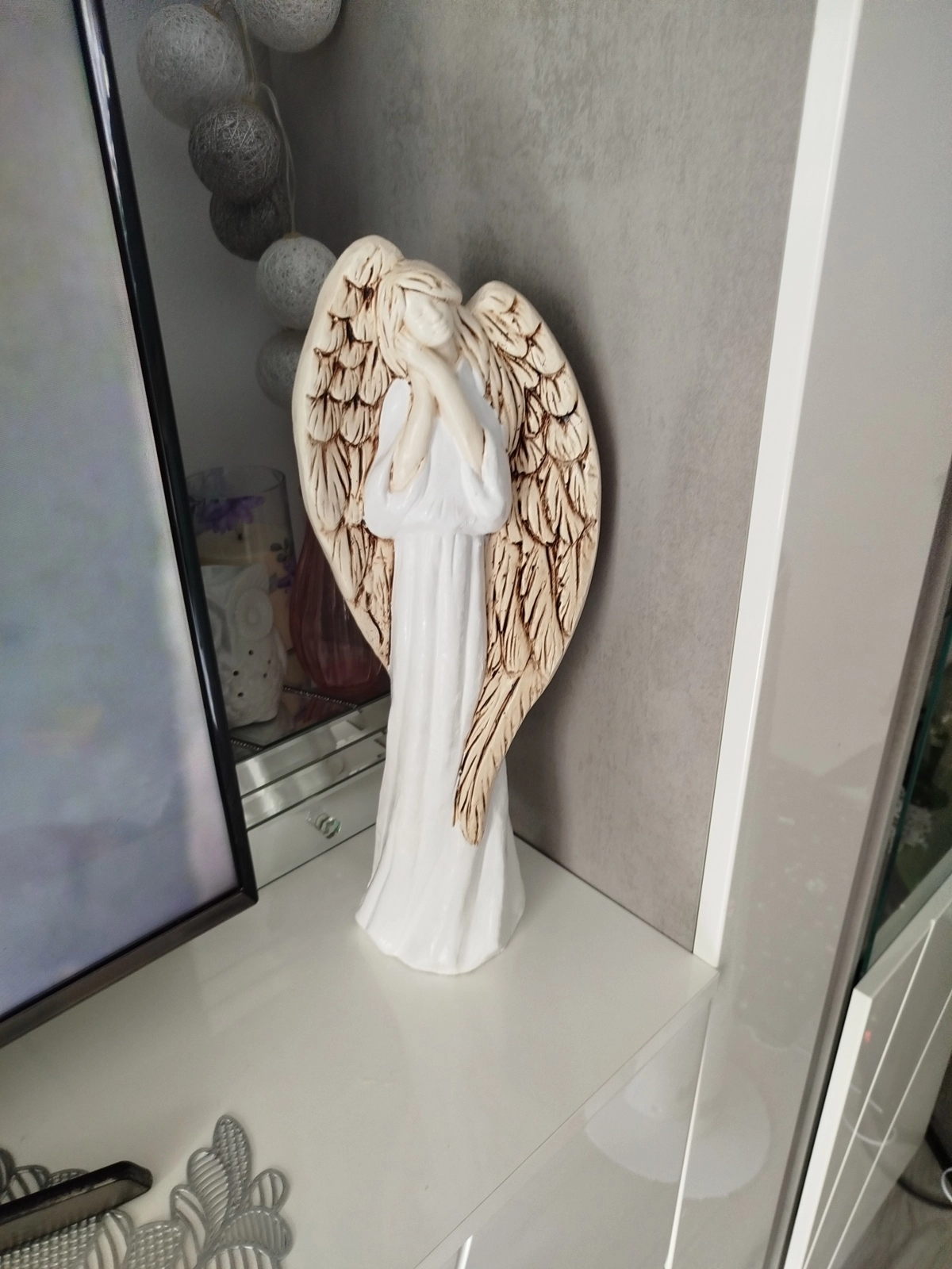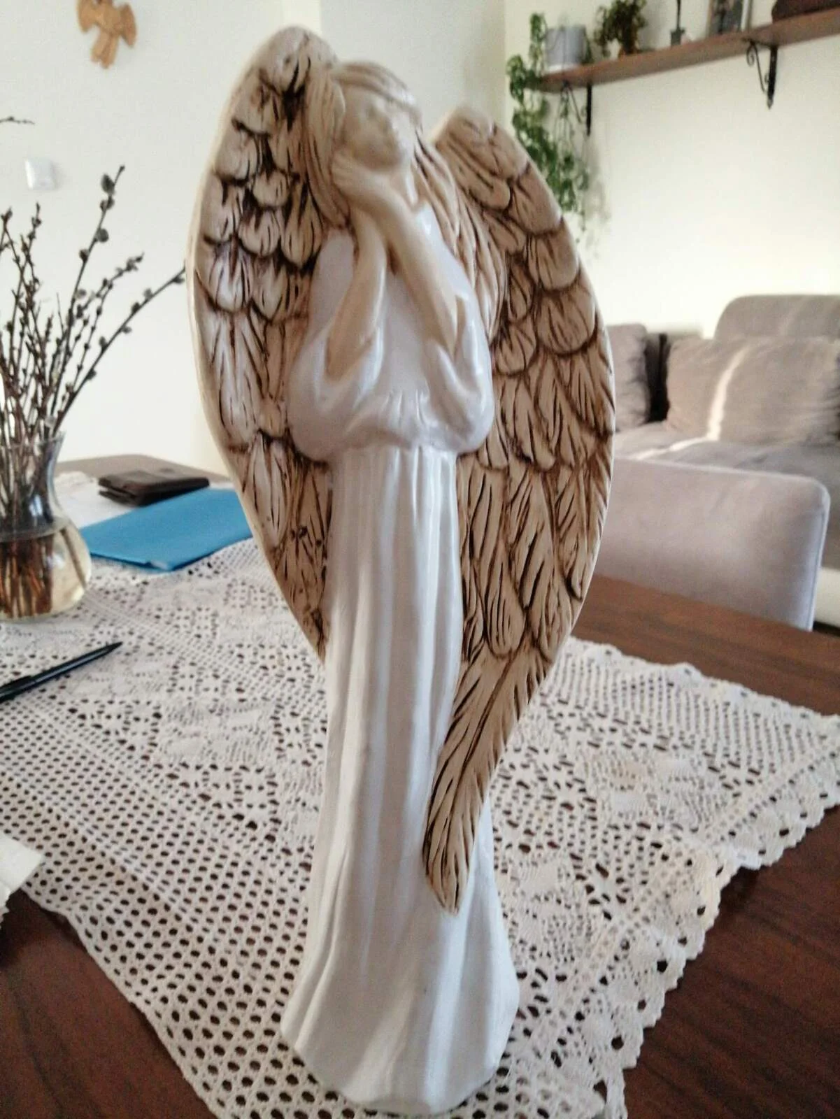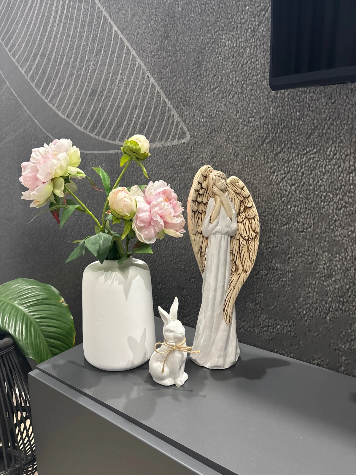 Anioł Gabriel to ręcznie wykonana gipsowa figurka w pięknych odcieniach bieli i beżu. Anioł ma cudowne, rozłożyste skrzydła i przybiera postać o złożonych dłoniach przy twarzy, na której maluje się spokój i melancholia. Idealnie sprawdzi się na prezent ślubny czy komunijny. Może efektownie ozdabiać zarówno wnętrza, jak i ogród.