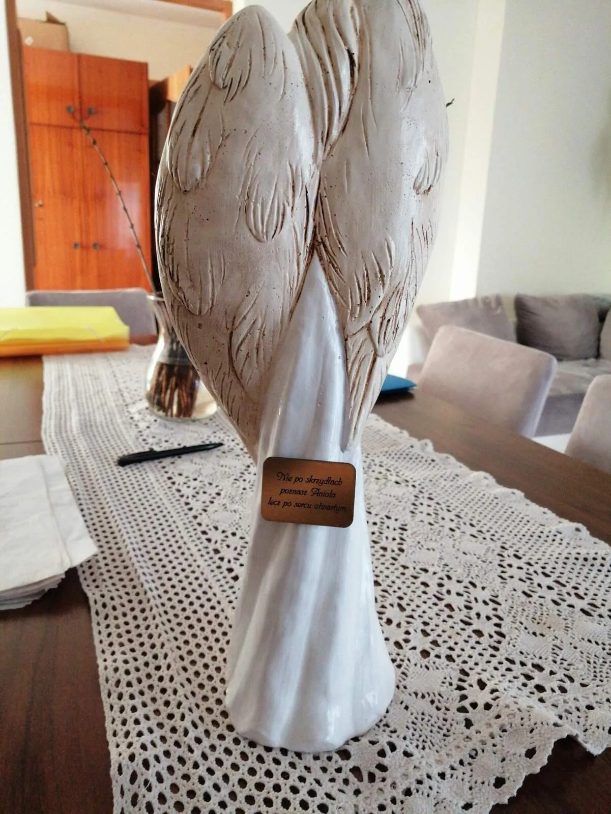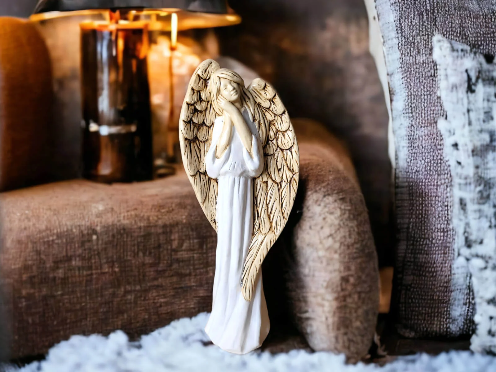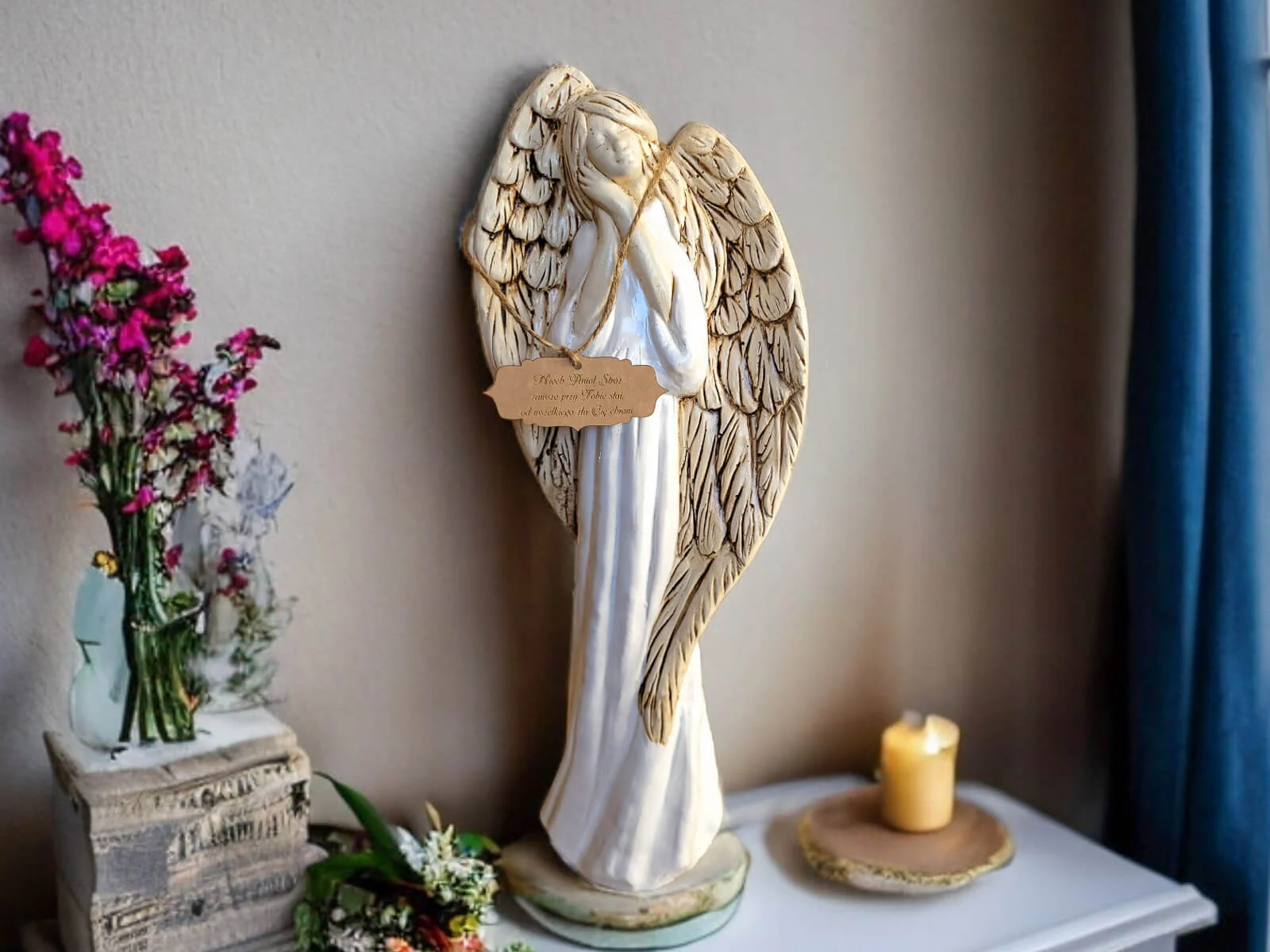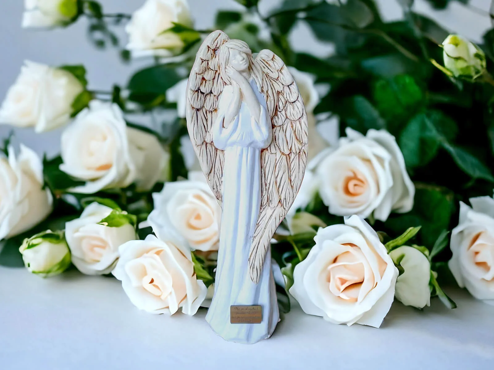 Anioł Gabriel to ręcznie wykonana gipsowa figurka w pięknych odcieniach bieli i beżu. Anioł ma cudowne, rozłożyste skrzydła i przybiera postać o złożonych dłoniach przy twarzy, na której maluje się spokój i melancholia. Idealnie sprawdzi się na prezent ślubny czy komunijny. Może efektownie ozdabiać zarówno wnętrza, jak i ogród.
