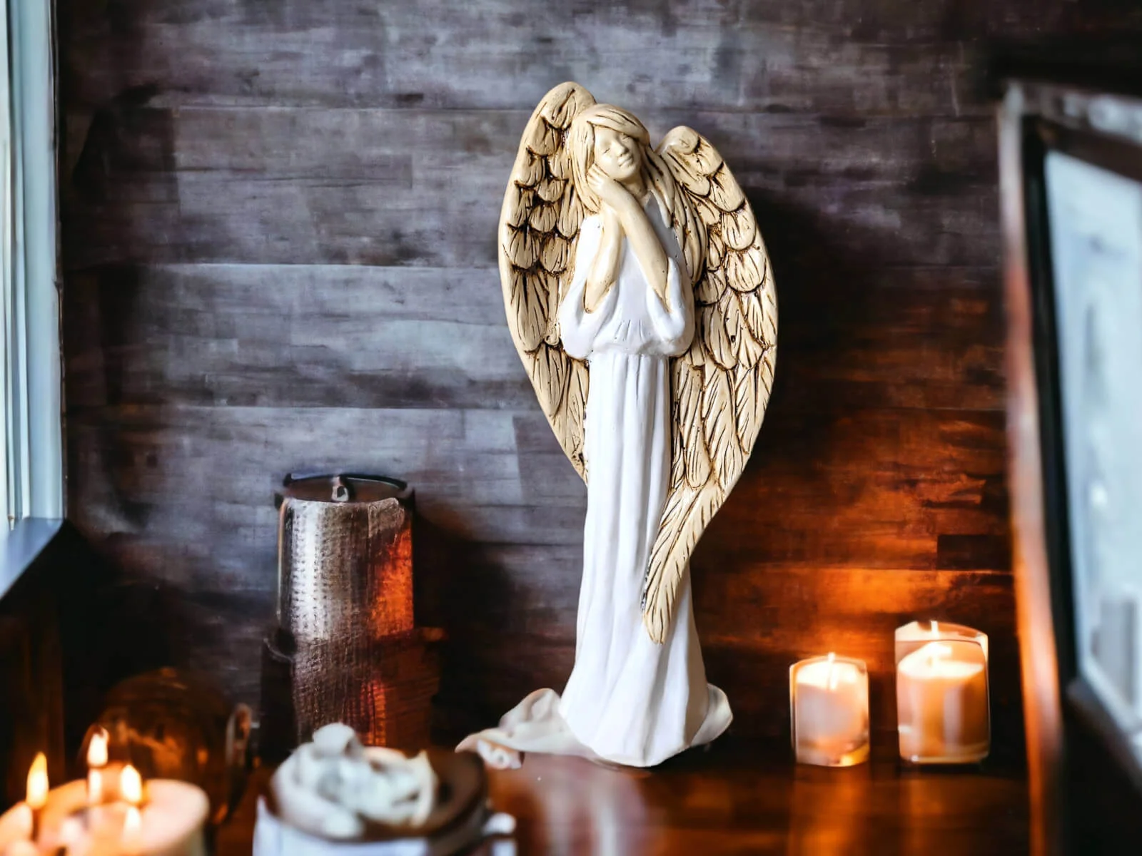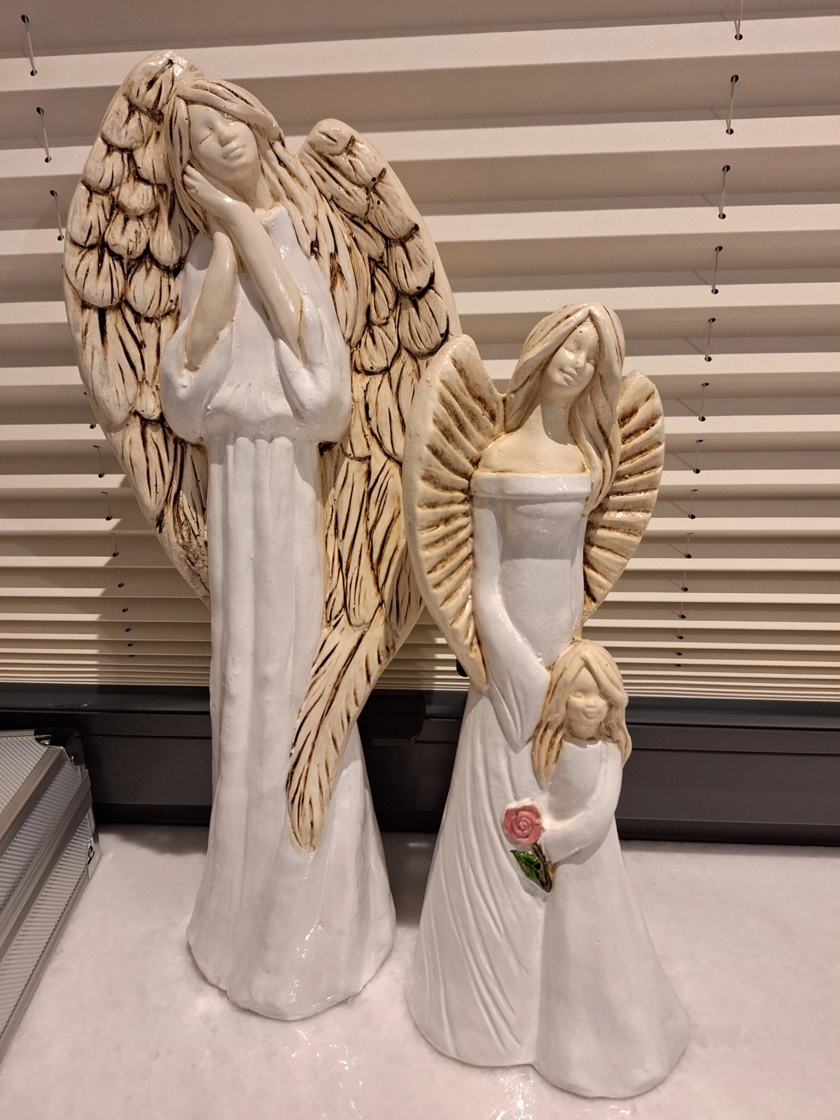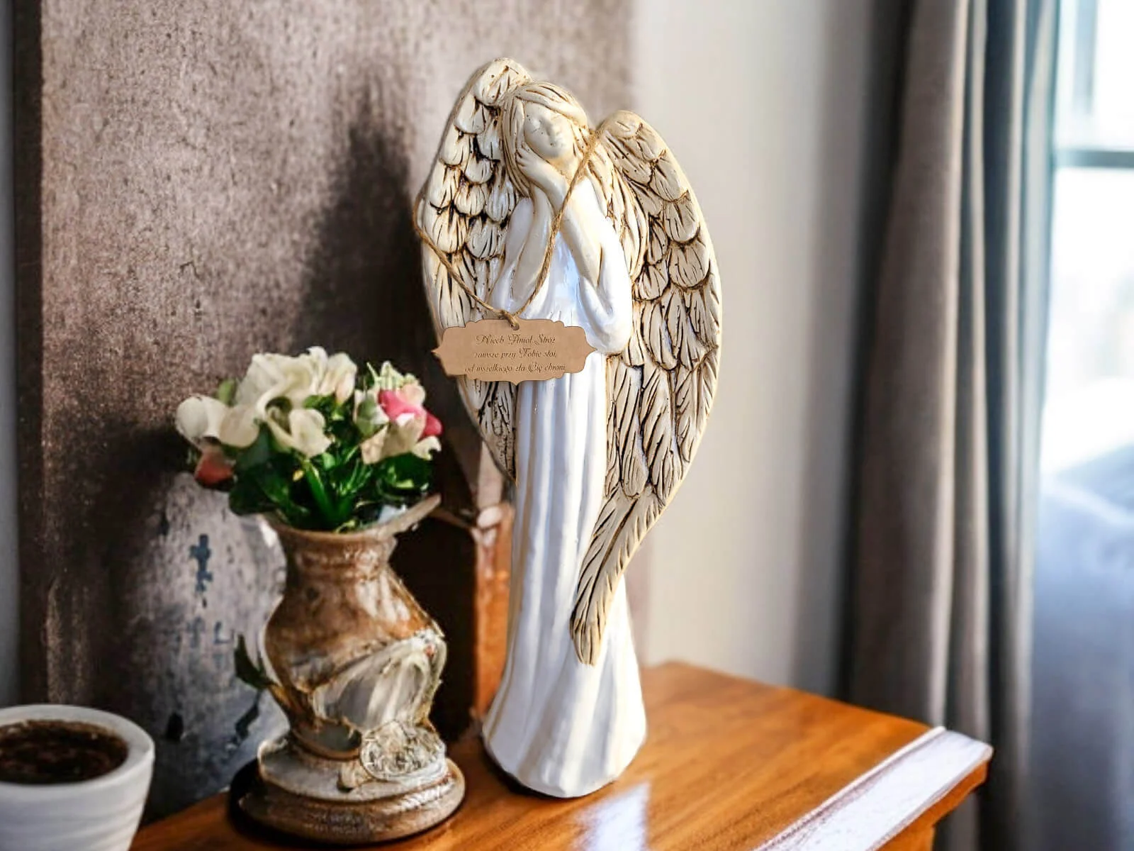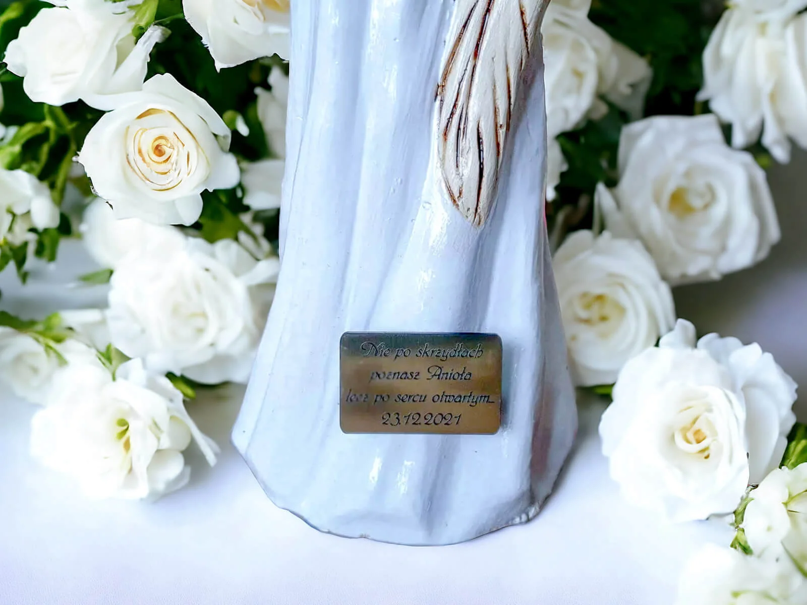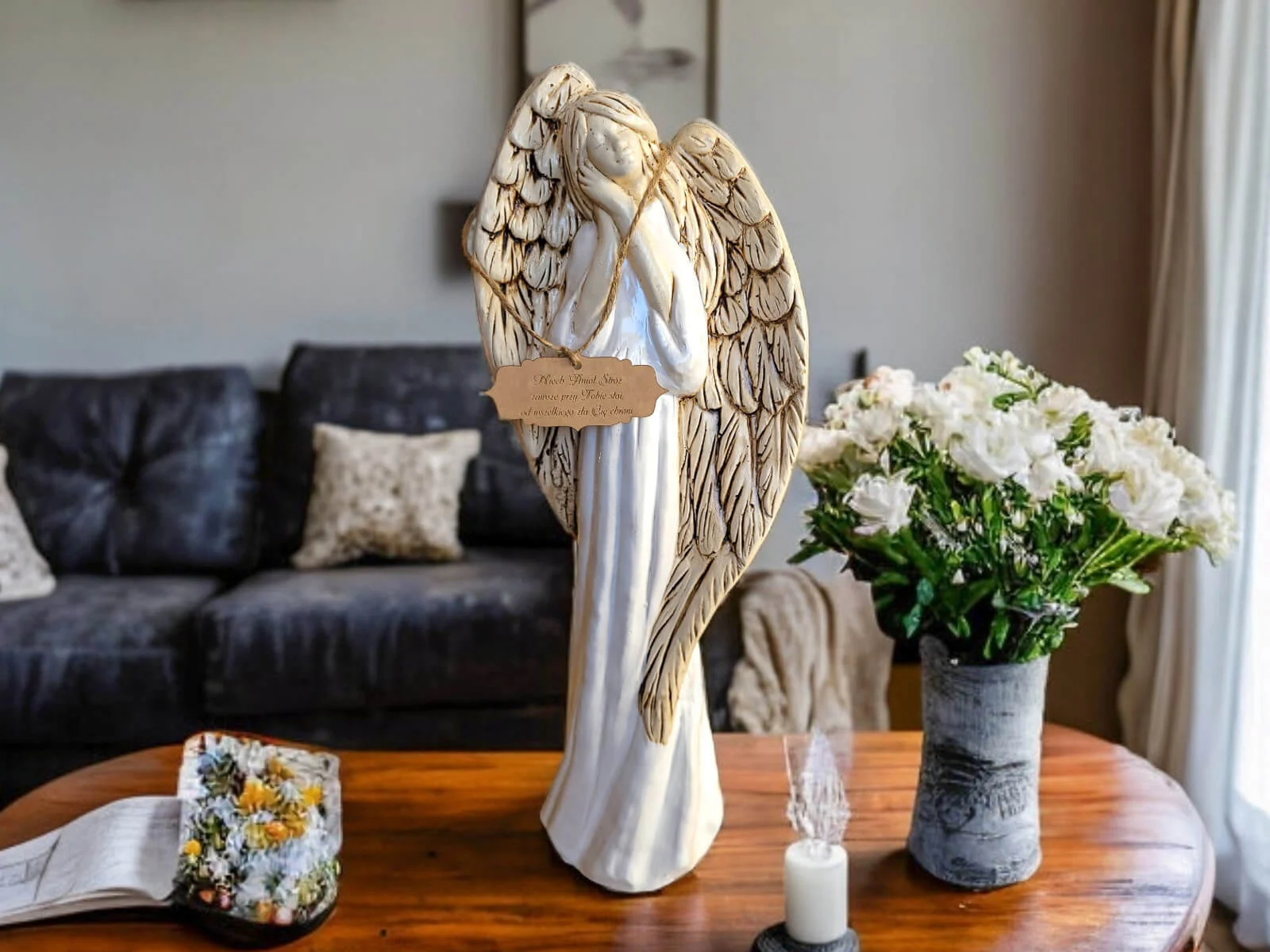 Anioł Gabriel to ręcznie wykonana gipsowa figurka w pięknych odcieniach bieli i beżu. Anioł ma cudowne, rozłożyste skrzydła i przybiera postać o złożonych dłoniach przy twarzy, na której maluje się spokój i melancholia. Idealnie sprawdzi się na prezent ślubny czy komunijny. Może efektownie ozdabiać zarówno wnętrza, jak i ogród.