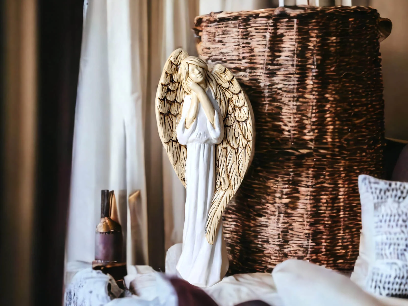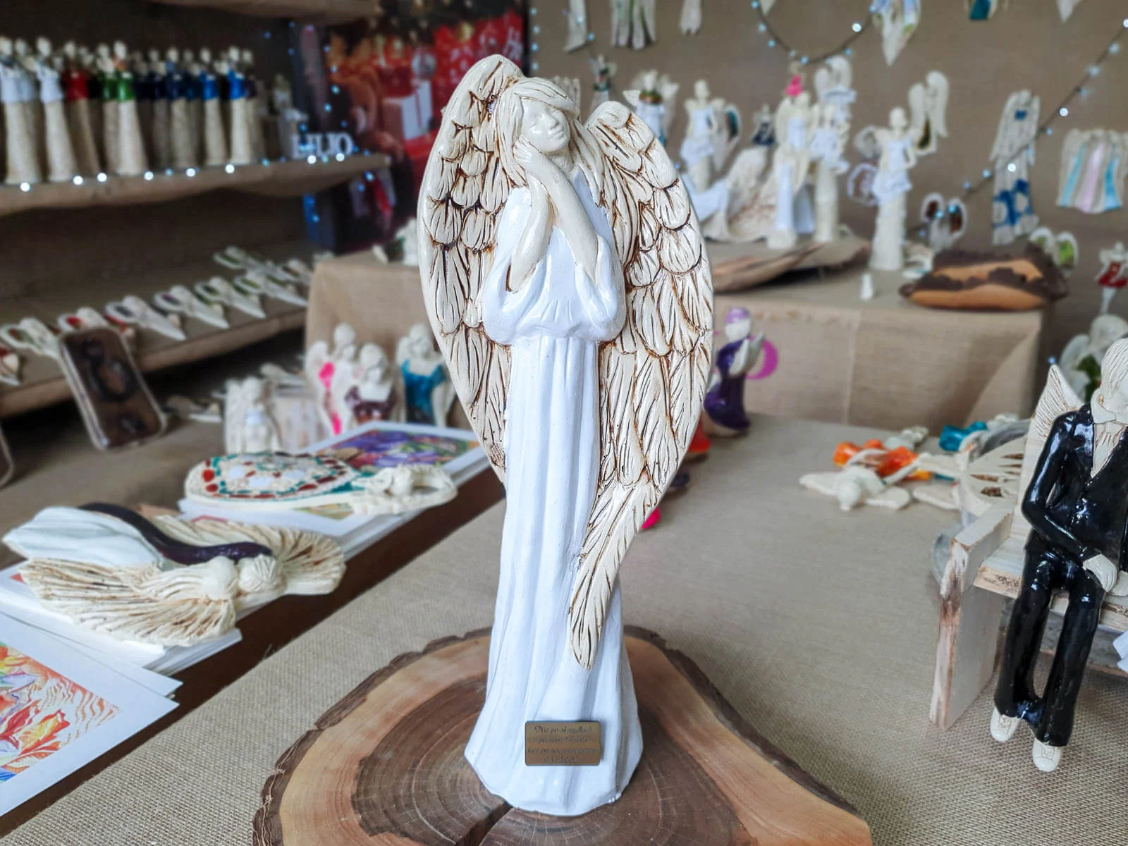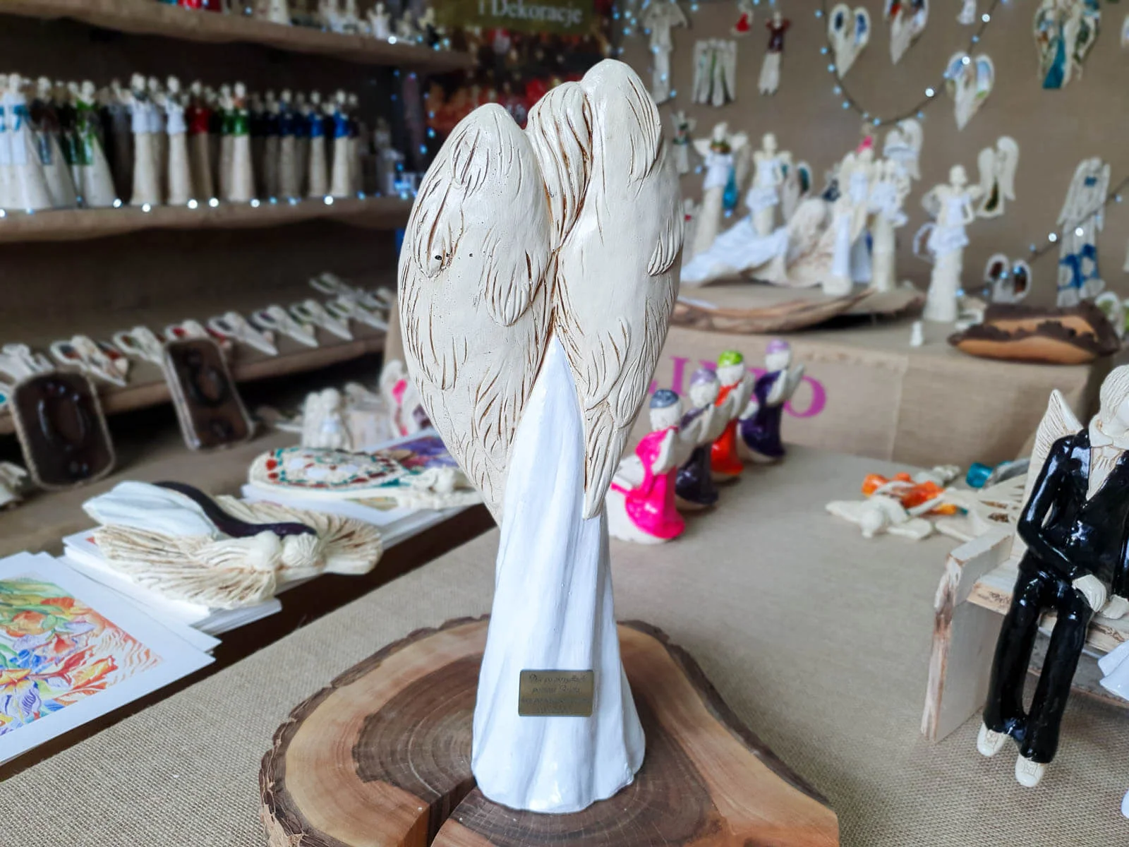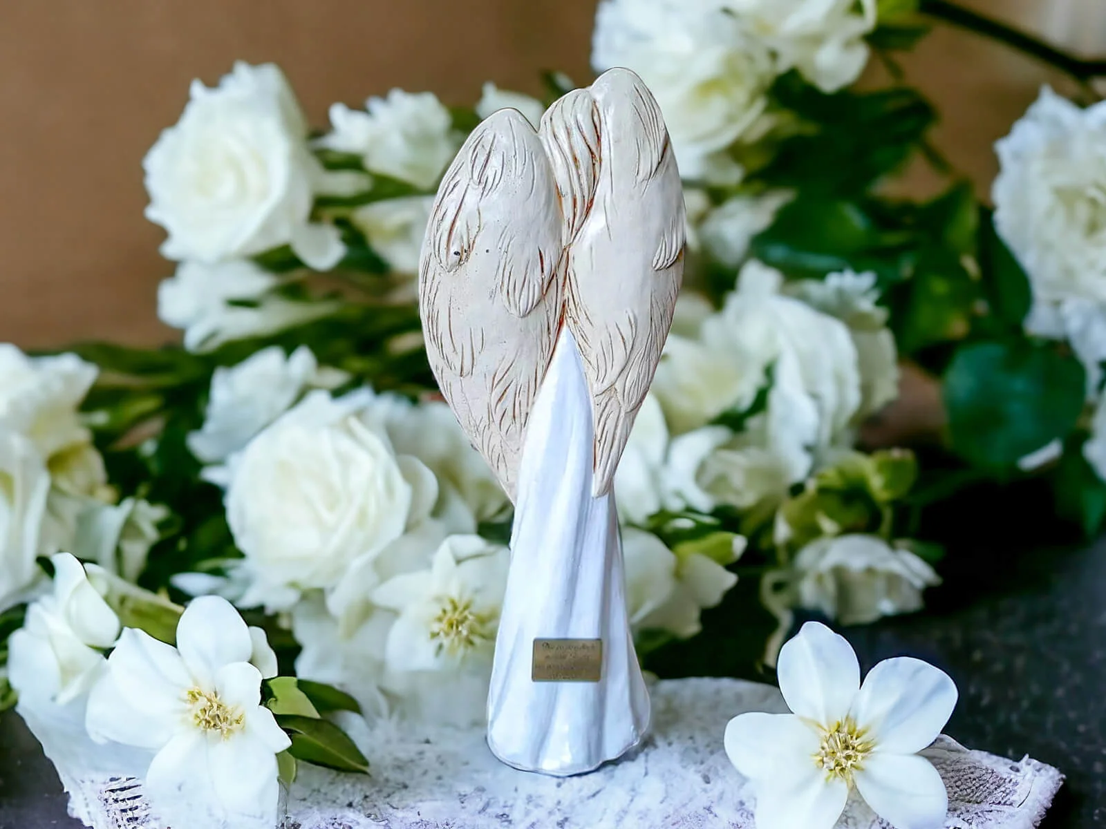 Anioł Gabriel to ręcznie wykonana gipsowa figurka w pięknych odcieniach bieli i beżu. Anioł ma cudowne, rozłożyste skrzydła i przybiera postać o złożonych dłoniach przy twarzy, na której maluje się spokój i melancholia. Idealnie sprawdzi się na prezent ślubny czy komunijny. Może efektownie ozdabiać zarówno wnętrza, jak i ogród.