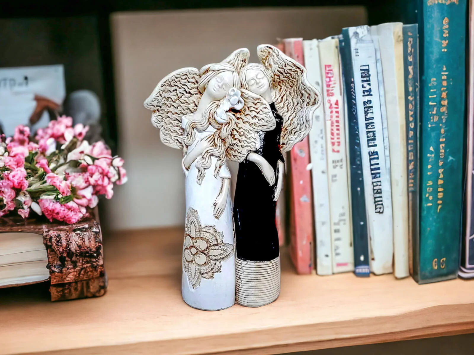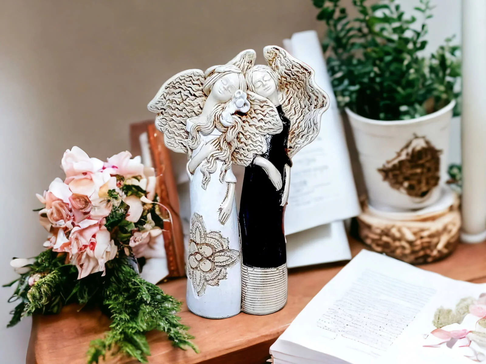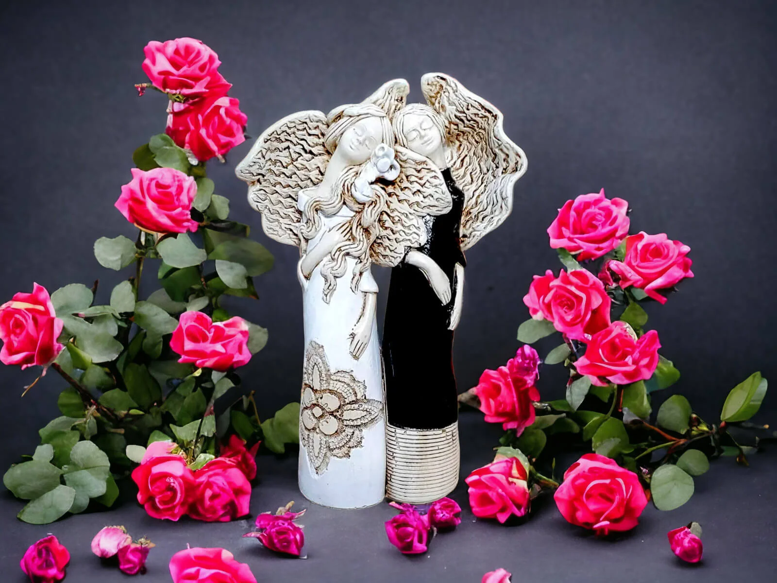 Nora i Ellie to siostry, darzące się wzajemnie ogromną miłością. Kochają spędzać razem czas i nie mogłyby żyć oddzielnie. Dlatego właśnie figurka przedstawia je razem - wtulone w siebie celebrują chwile spędzane razem. Całość ubrana jest w piękne, subtelne barwy - biel, beż z nutą czerni. Figura pięknie udekoruje salon bądź ogród.
