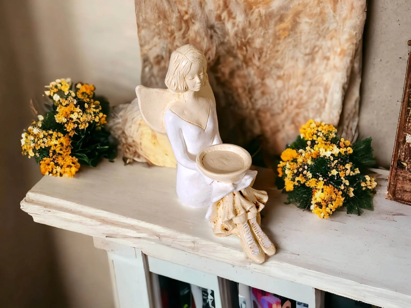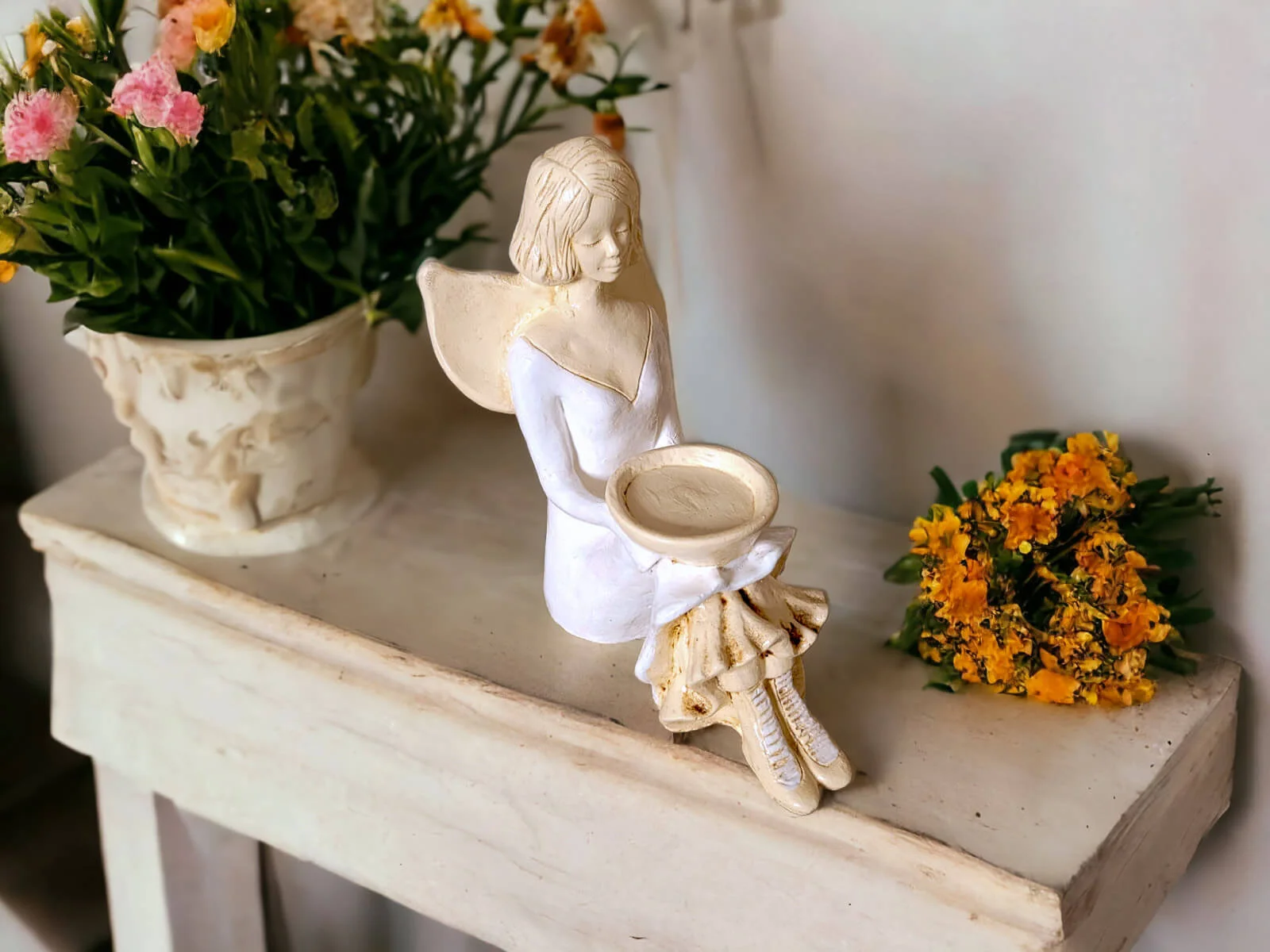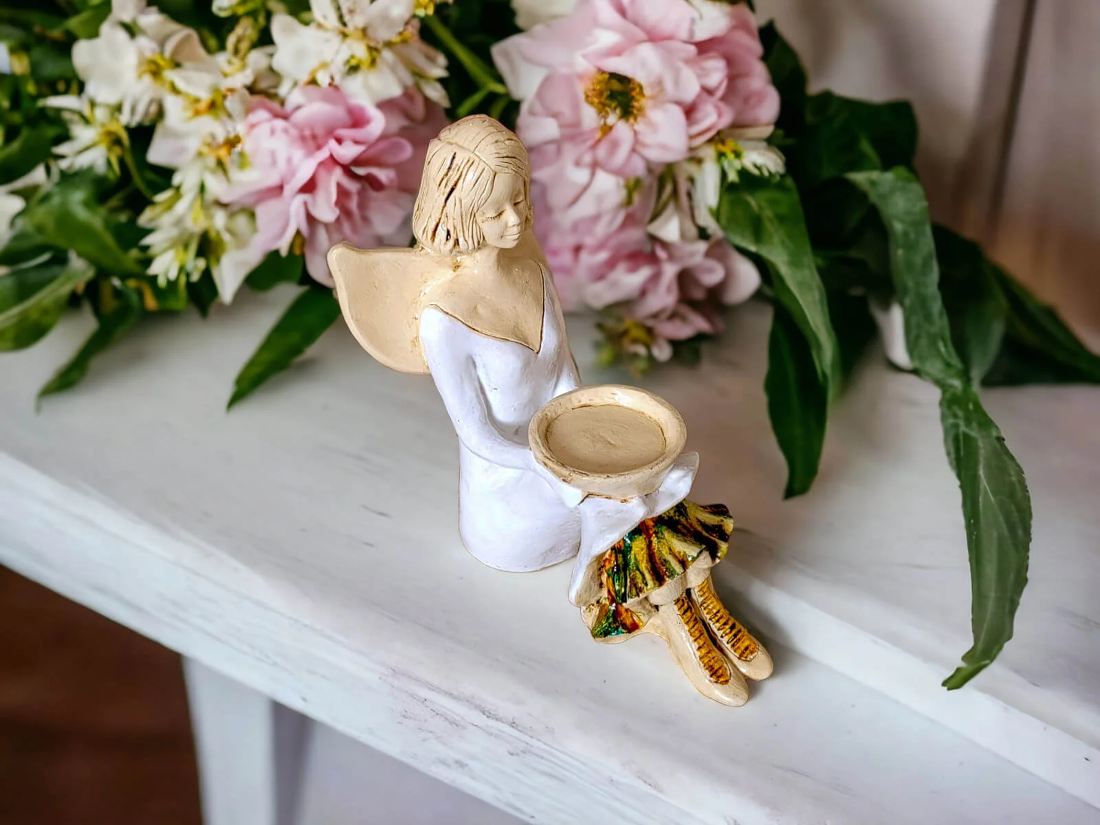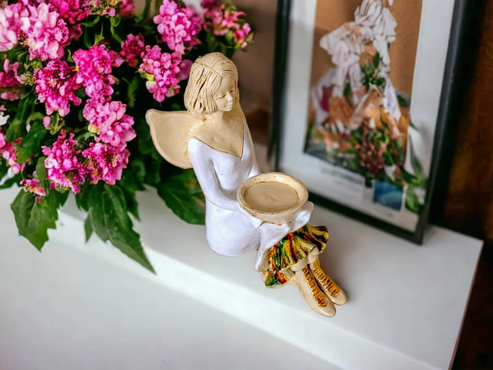 Aniołek Marion jest wykonany z gipsu ręcznej produkcji. Prezentuje dziewczynkę w białej sukience. Ma ona także białe buciki. Włosy sięgają jej za ucho, a z tyłu na plecach posiada małe skrzydła skierowane ku górze. Jest w pozycji siedzącej, a na kolanach trzyma misę, do której można włożyć świeczkę. Dekoracja należy do rodzaju dekoracji stojących, dzięki czemu można ją gdziekolwiek postawić. Idealnie nadaje się jako ozdoba wnętrza lub na prezent np. dla małej dziewczynki, na I Komunię Świętą lub na ślub.