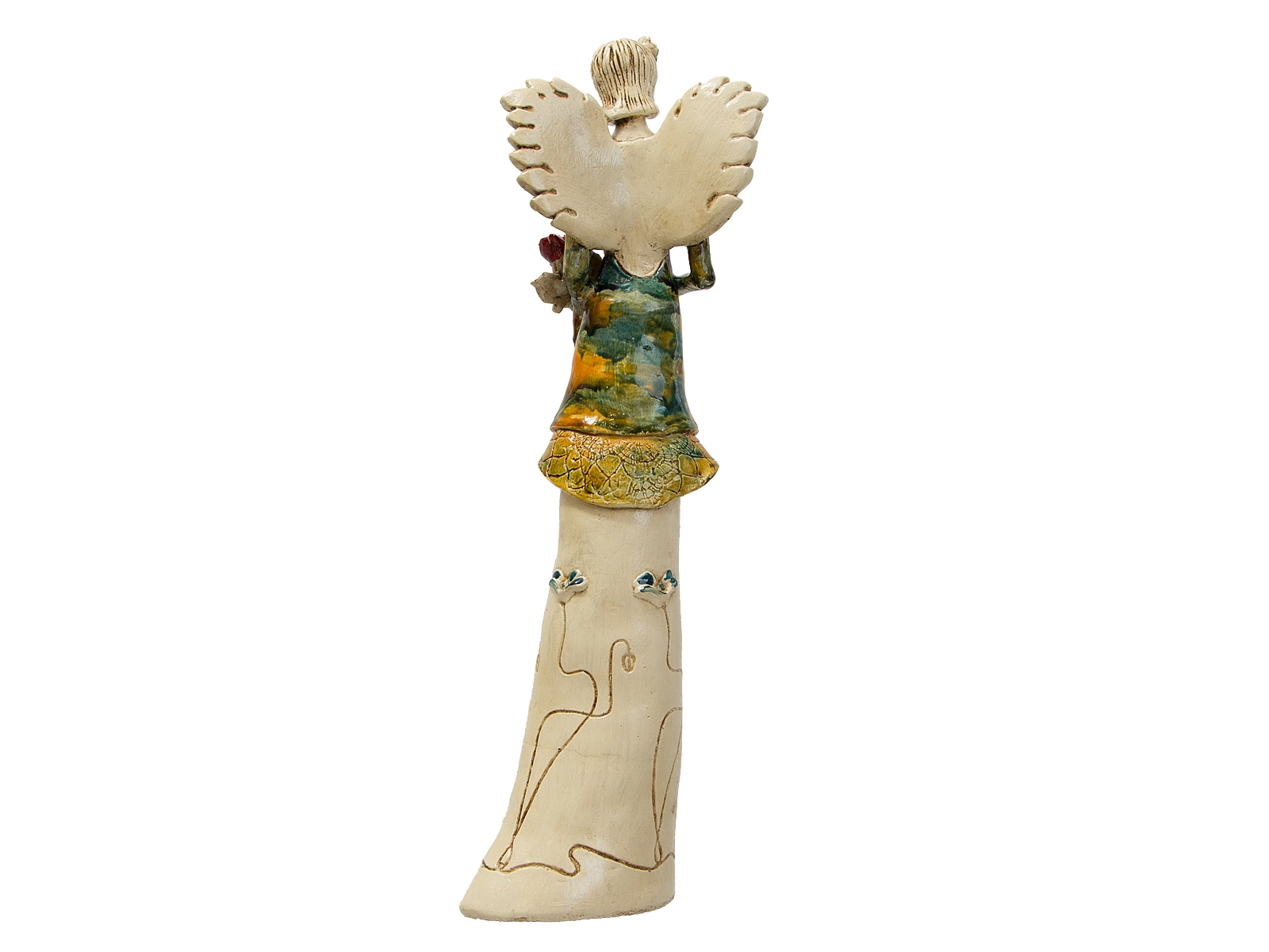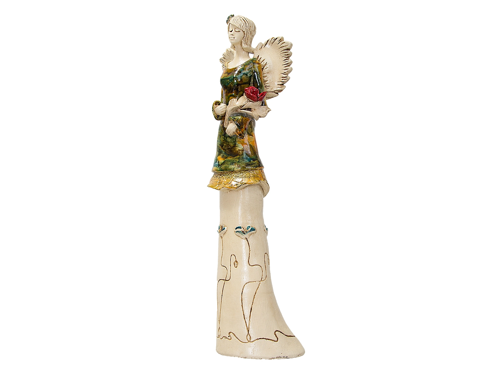 Anioł Mia to ręcznie wykonana figurka. Mia jej imię pochodzi z języka słowiańskiego, co oznacza ,,ukochana’’. Mia wraca ze spotkania z ukochanym, dumnie trzyma w ręku piękną różę, którą dostała od lubego. Ma długą beżową suknie oraz zółto-zieloną narzutę. Cudownie eksponuje delikatne,rozłożyste skrzydła. Idealna na prezent na dzień kobiet. Nadaje się jako ozdoba do każdego wnętrza.