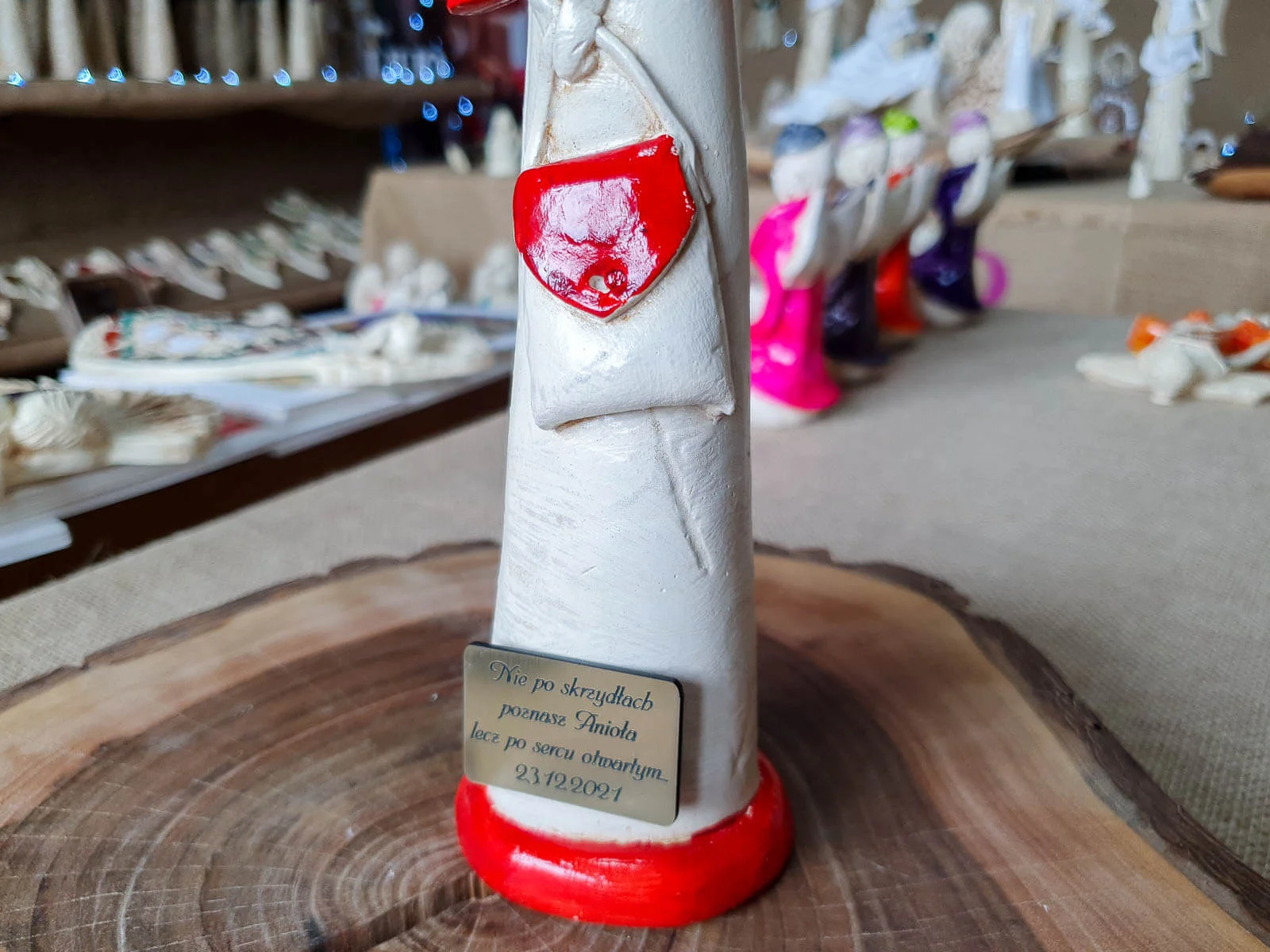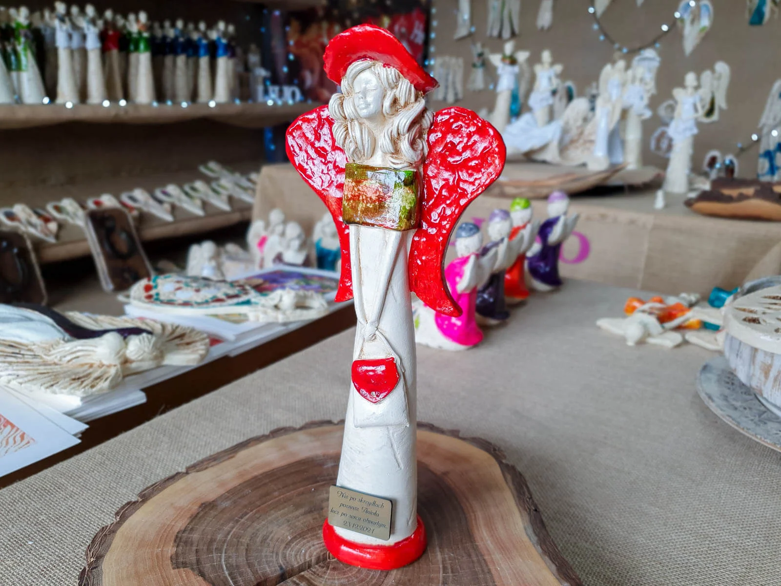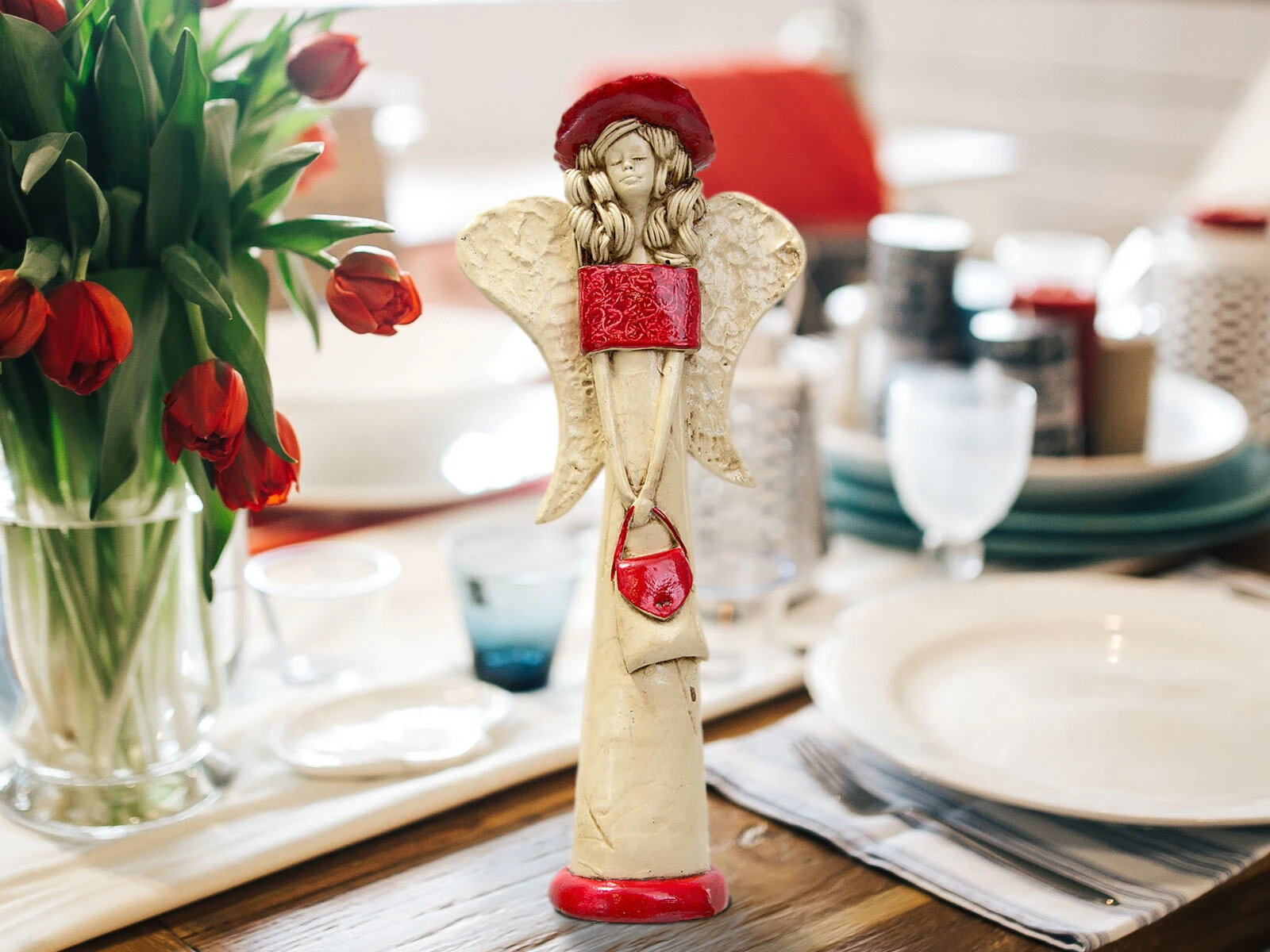 Anioł Coco to ręcznie wykonana figurka w kształcie filigranowej dziewczynki. Ma cudowne rozłożyste skrzydła. Jej beżowy ubiór podkreślają czerwone akcenty. Figurka Coco idealnie nadaje się na prezent dla dziewczynki jako pamiątka komunijna. Anioł może pięknie prezentować się jako ozdoba wnętrz.