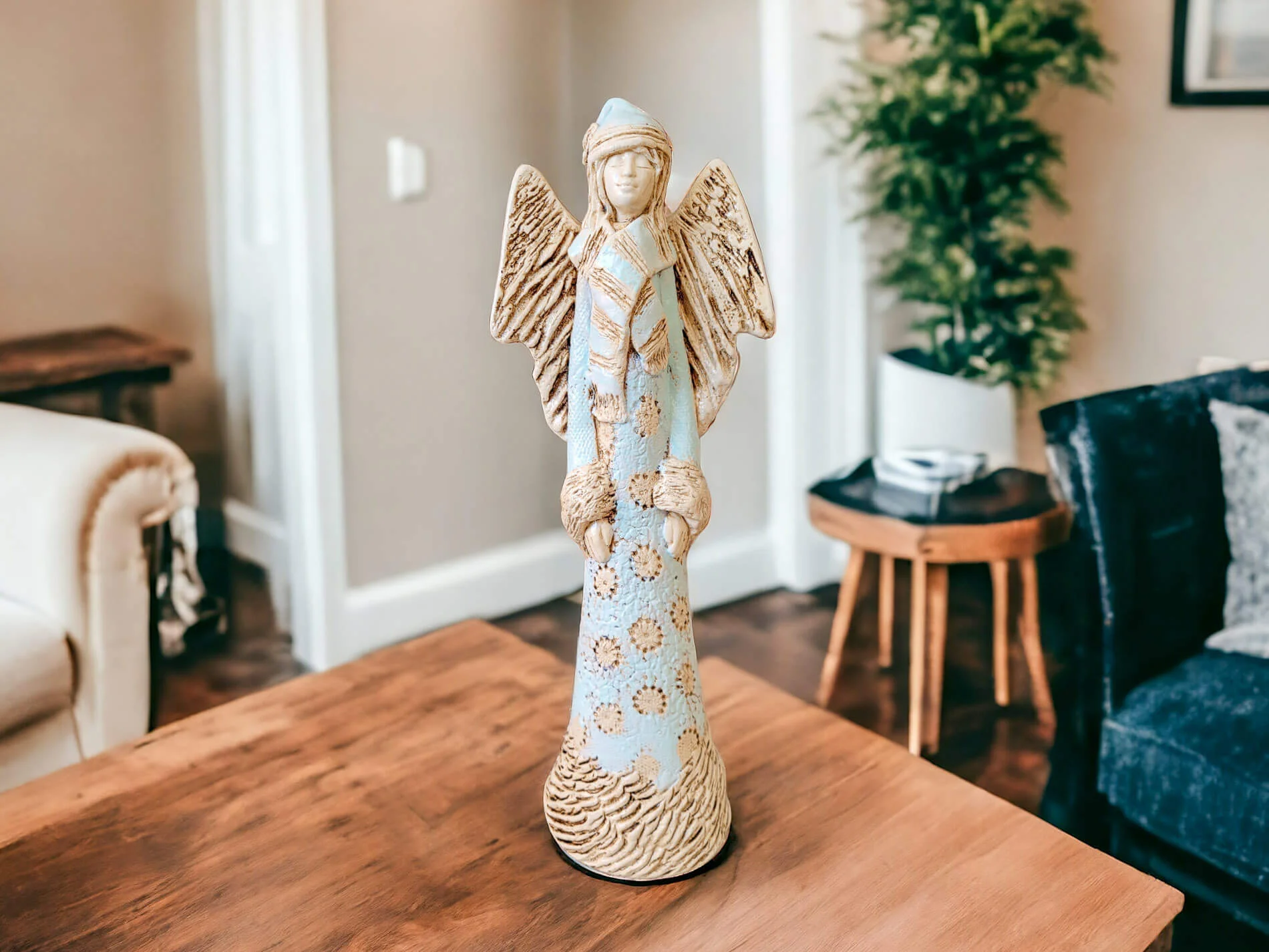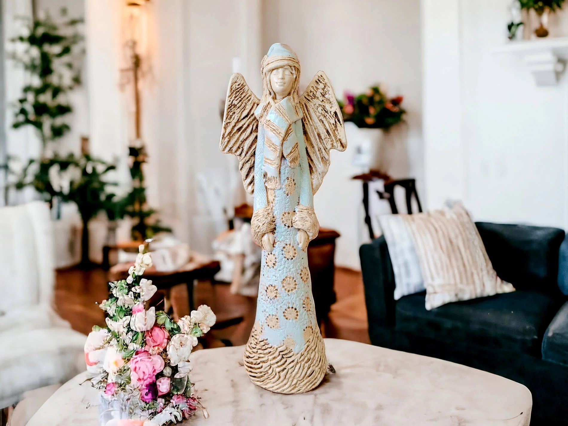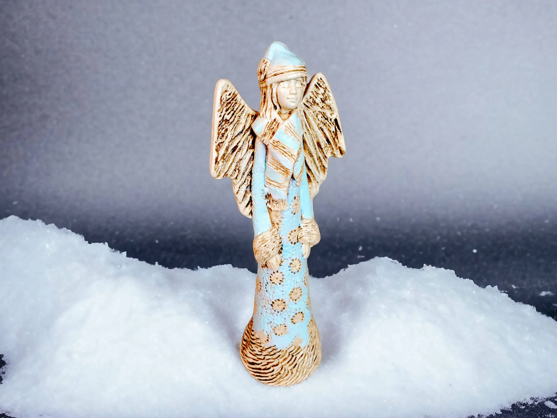 Anioł Abdiel jest dekoracją stojącą, wykonaną z gipsu ręcznej produkcji. Przedstawia kobietę ubraną w długą, niebieską suknię z kwiecistymi wzorami. Na głowie ma beżową czapkę i jasne do ramion włosy. Z tyłu widnieją duże skrzydła opuszczone w dół, a na szyi niebiesko-beżowy szal. Ręce ułożone są wzdłuż sylwetki. Figurka ładnie komponowałaby się jako ozdoba w okresie zimowym. Może również służyć jako prezent dla bliskiej osoby na Gwiazdkę.