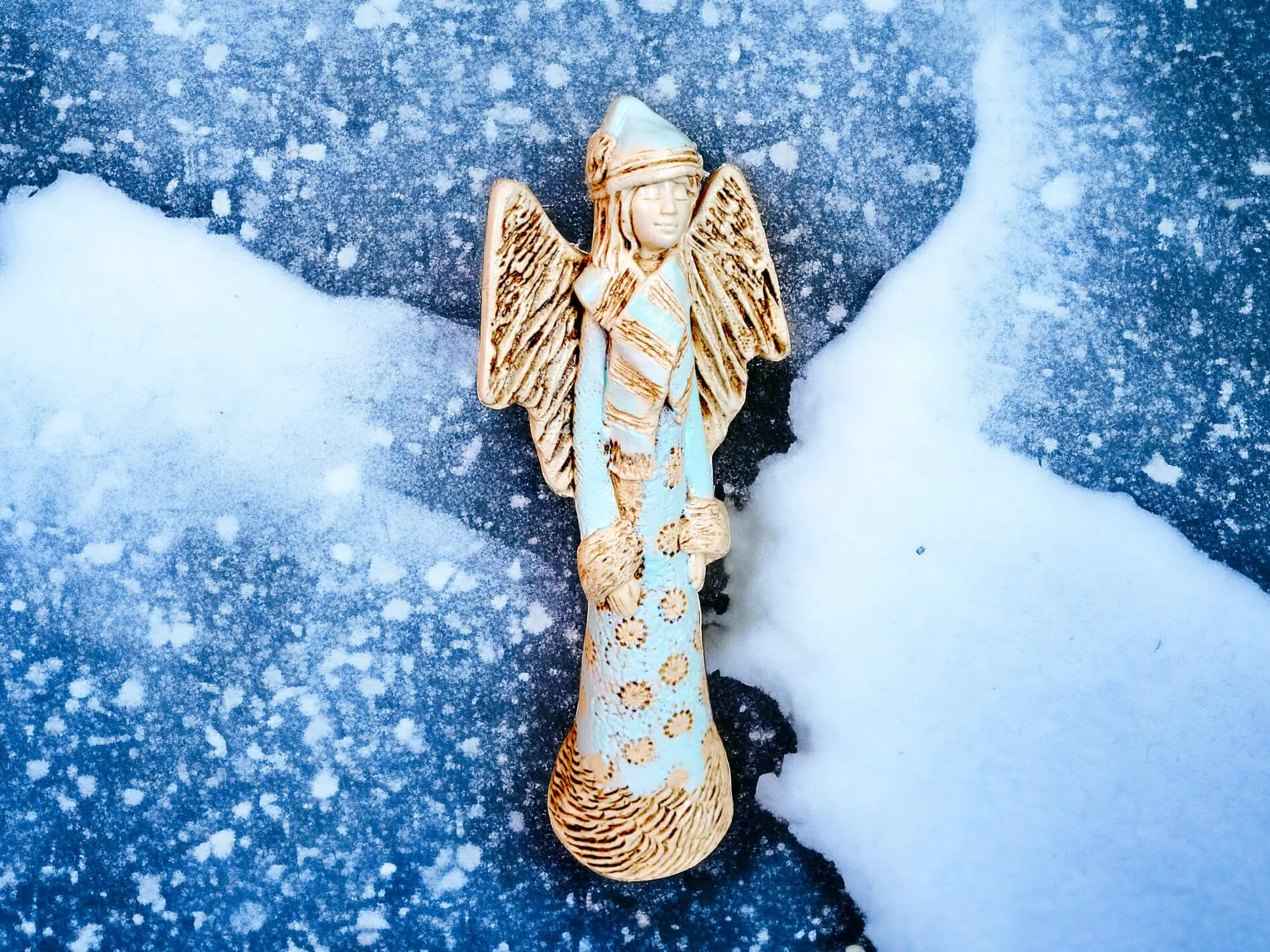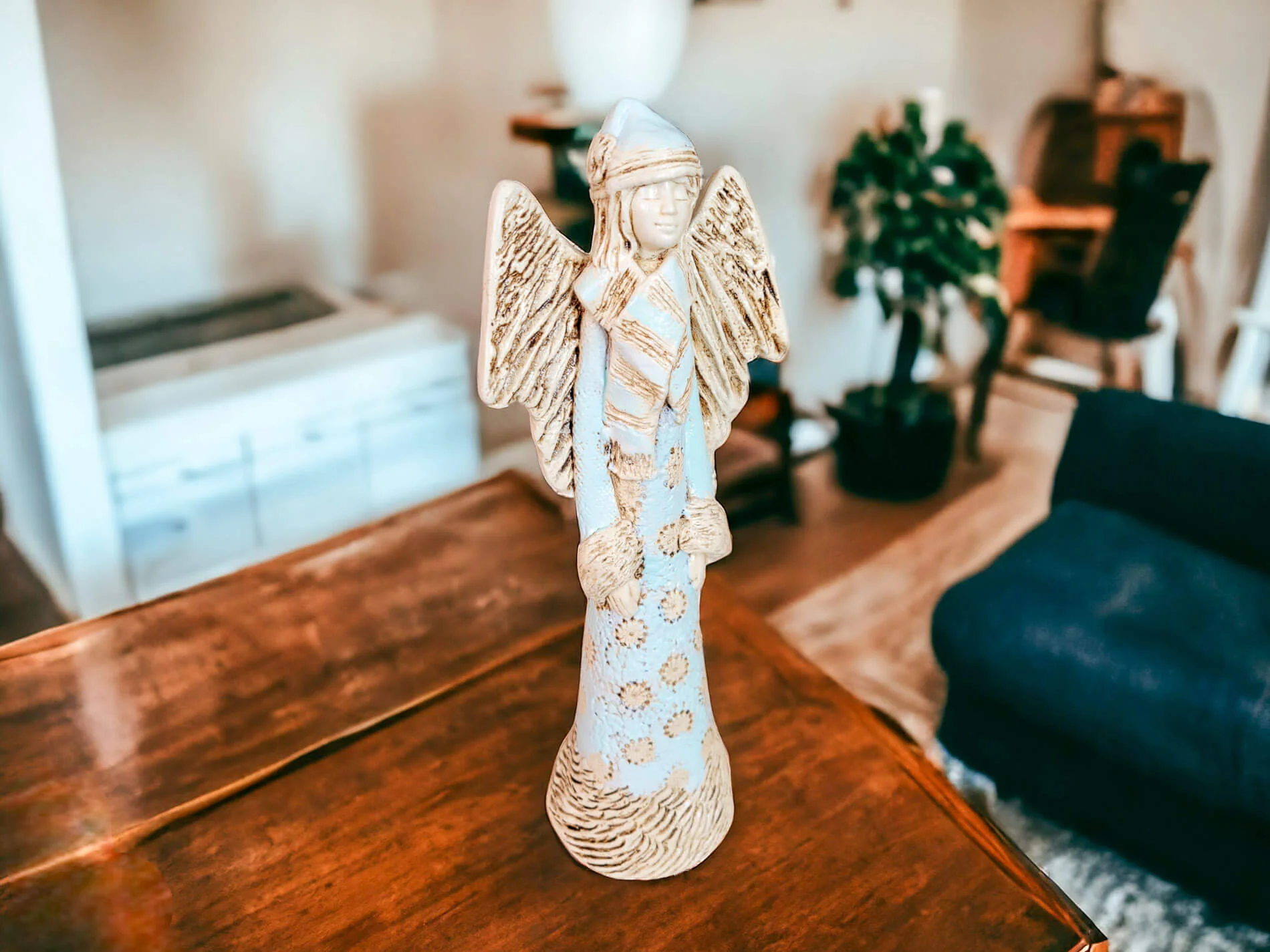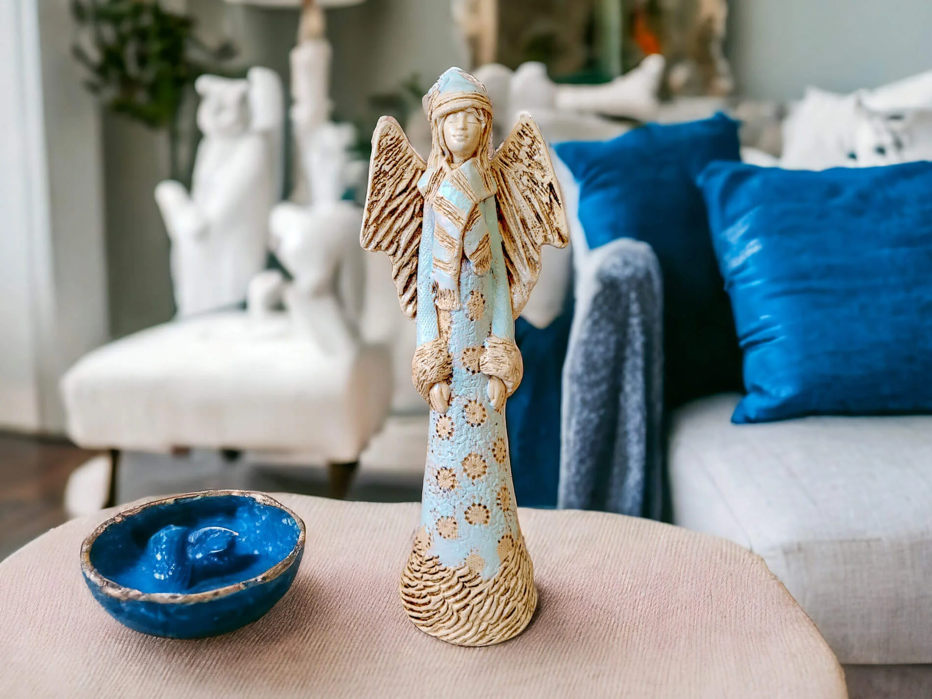 Anioł Abdiel jest dekoracją stojącą, wykonaną z gipsu ręcznej produkcji. Przedstawia kobietę ubraną w długą, niebieską suknię z kwiecistymi wzorami. Na głowie ma beżową czapkę i jasne do ramion włosy. Z tyłu widnieją duże skrzydła opuszczone w dół, a na szyi niebiesko-beżowy szal. Ręce ułożone są wzdłuż sylwetki. Figurka ładnie komponowałaby się jako ozdoba w okresie zimowym. Może również służyć jako prezent dla bliskiej osoby na Gwiazdkę.